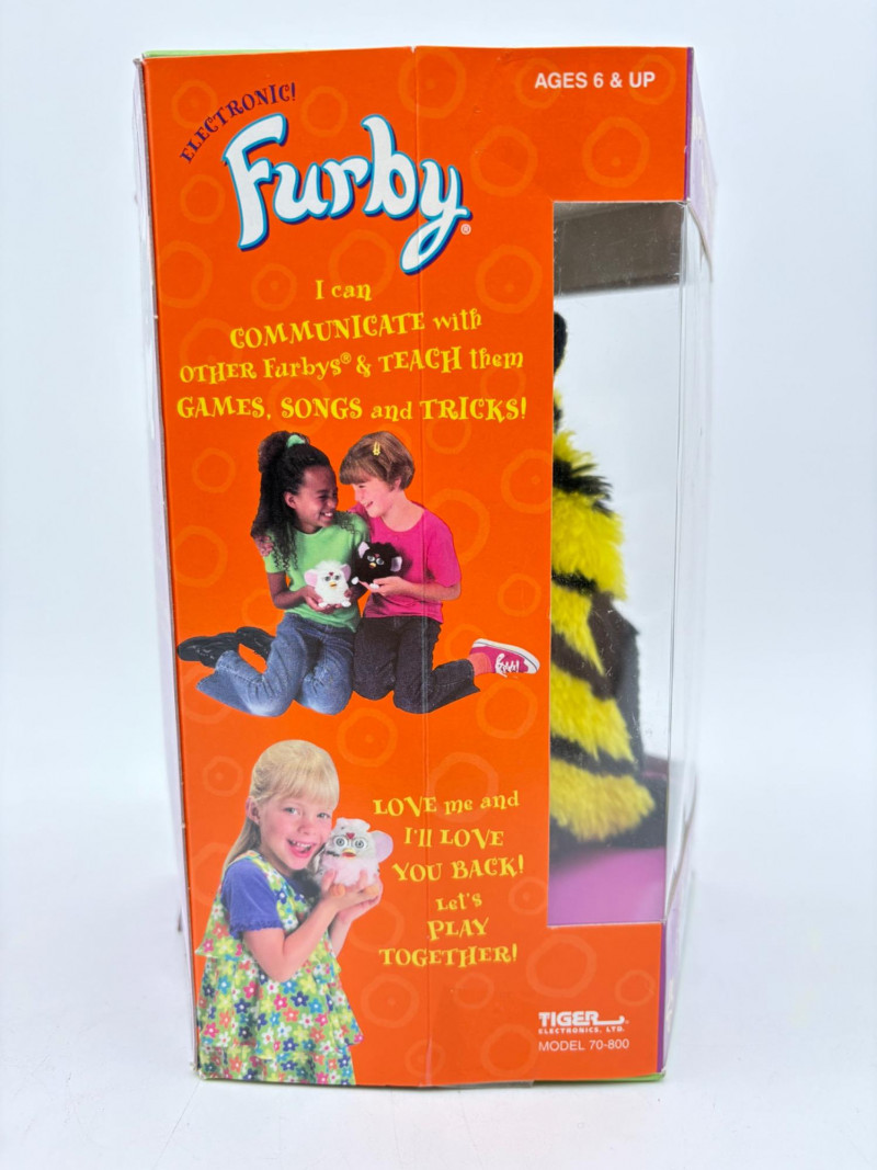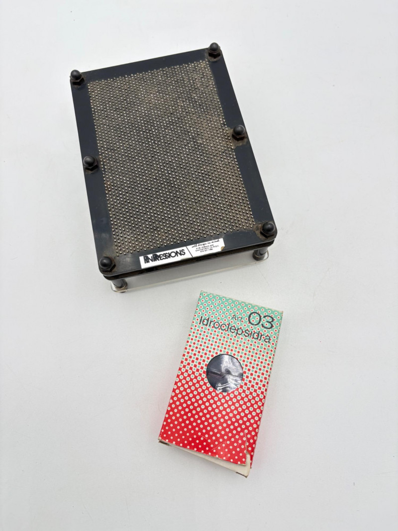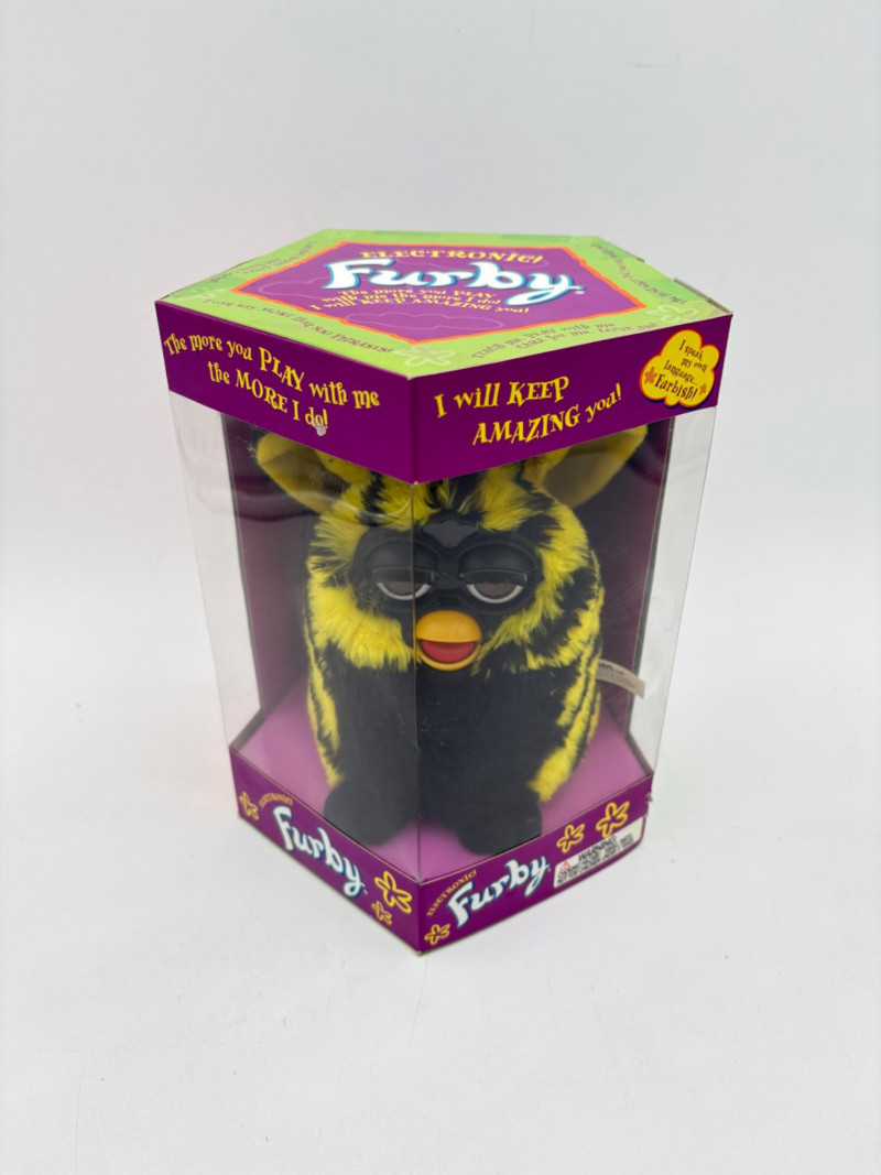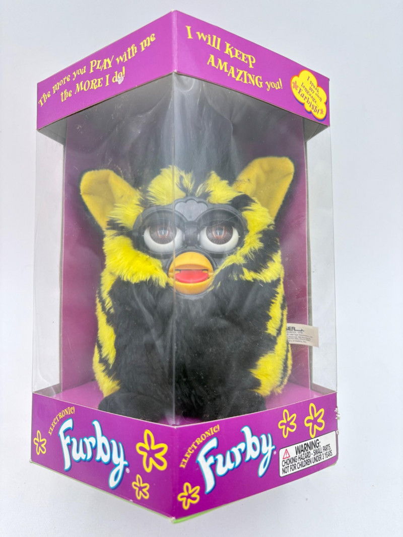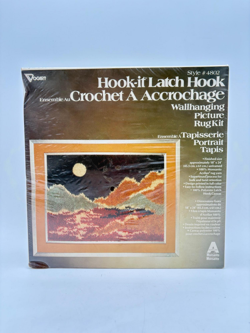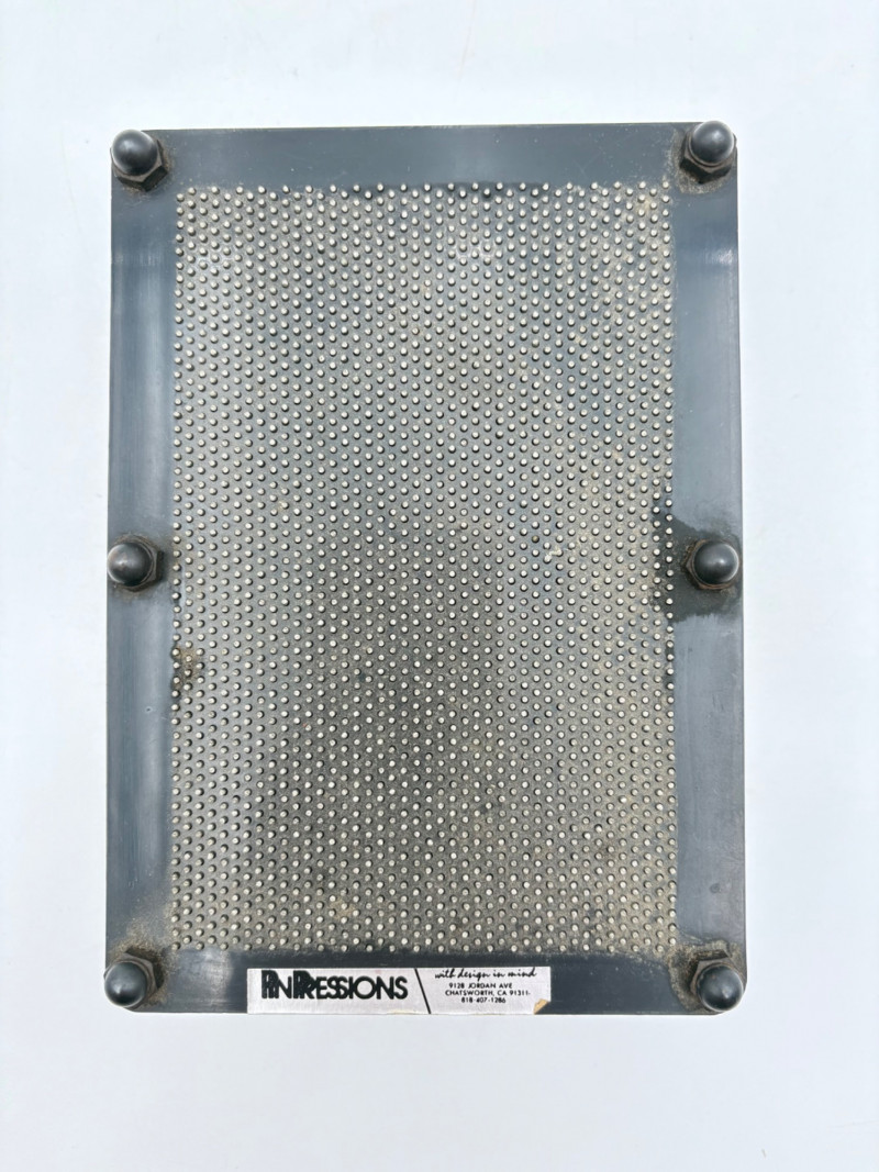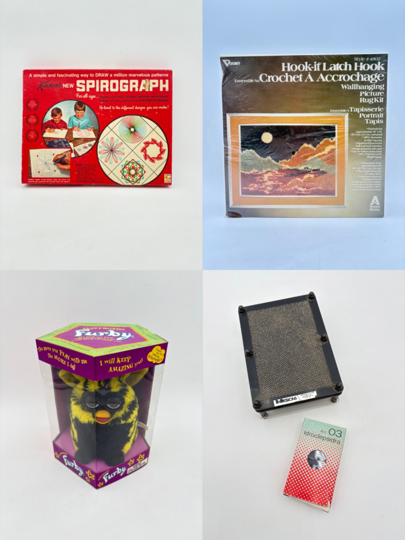 "Old School" items to keep the kids interested when you don't want them looking at the computer screen! - Vintage Spirograph set from Kenner - all parts & instructions are there - even the colored pens (although they have dried out - you can substitute any ballpoint pen). - Vintage hook rug wall hanging kit. Has all the yarn you need to create the "so 70s" landscape. Measures 18" x 24" when complete. New in original shrinkwrap from Vogart. - Furby! He might be unused as there are tape seals on the box (see photos), but we had a couple of other Furbys in open boxes that did not operate fully. We didn't test him on the off-chance that the tapes are the original seals. Be forewarned. From 1999. - Pinpressions design board. Wow, we wanted one of these so badly as a kid - we still want it now! If you are unfamiliar, the sliding pins make the impression of your hand or whatever you push against it stand out in relief! So cool! Measures approx. 7" x 5" x 2". This pinboard could use a good scrub to look terrific again. Check it out: Pin art - Wikipedia - Idropclepsidra toy - flip it & the water runs both ways. Weird. Measures about 4" x 2". -