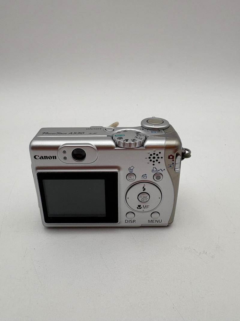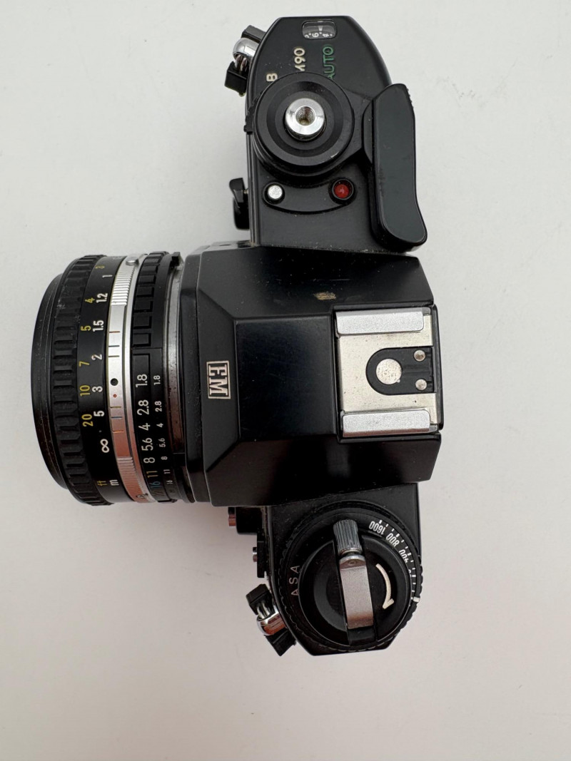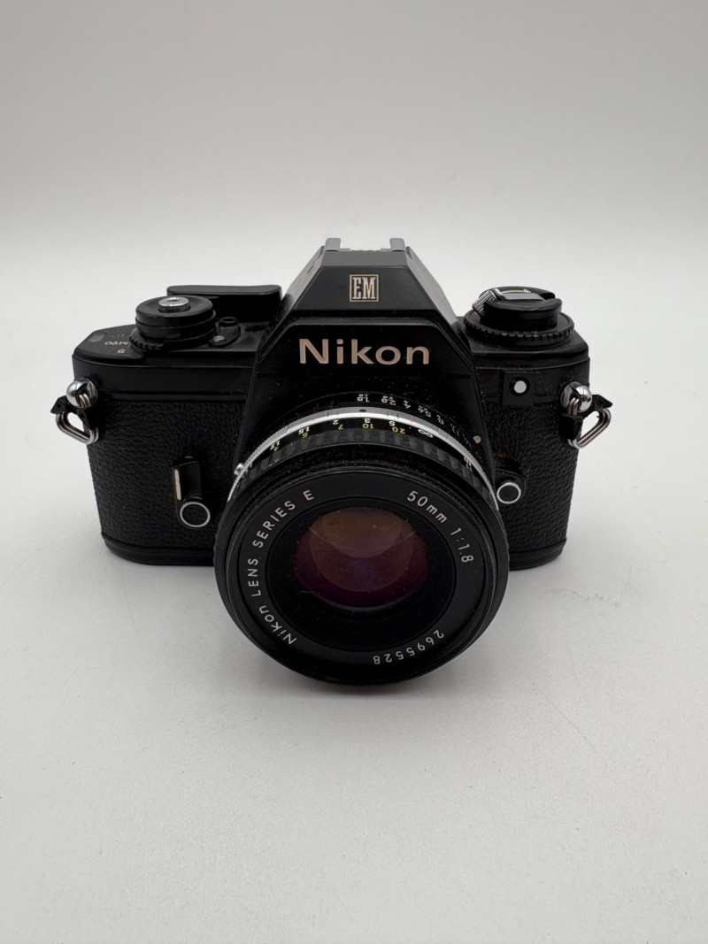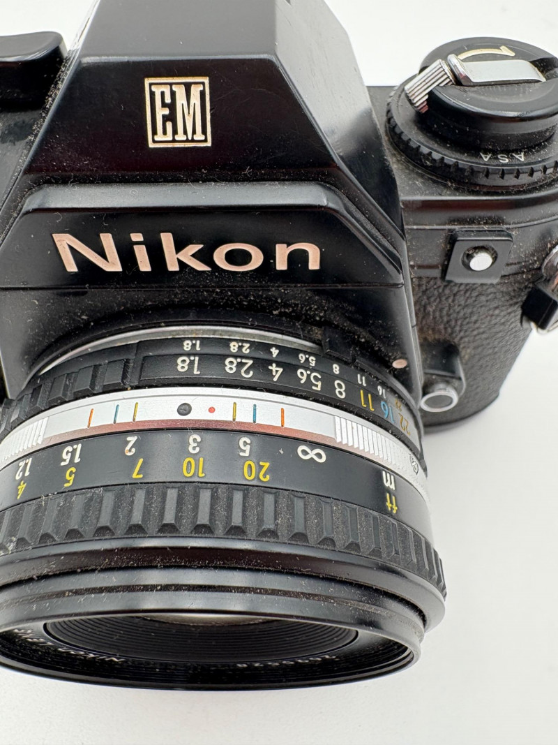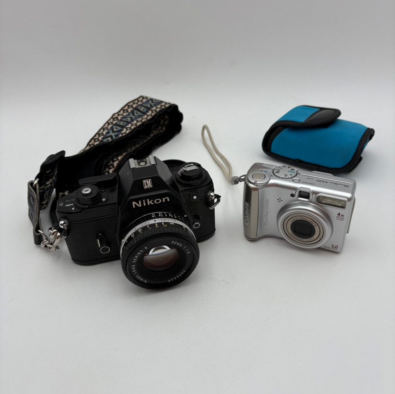 Pair of vintage cameras. We will say right up front we don't know much about photography, so we haven't been able to test if the items are working or complete. You photo connoisseurs out there please look closely at the photos since that will inform you much more than we can! - Nikon EM 35mm with neck strap - Canon PowerShot A530 with scuba cover