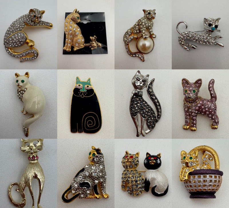 Single childless cat ladies (or guys) unite - here's the lot for you! You can also look even if you don't fit those categories - we welcome everyone who loves felines! 12 vintage and newer cat pins you will love to wear in very different design styles.