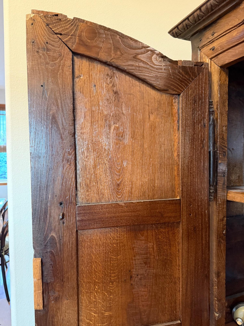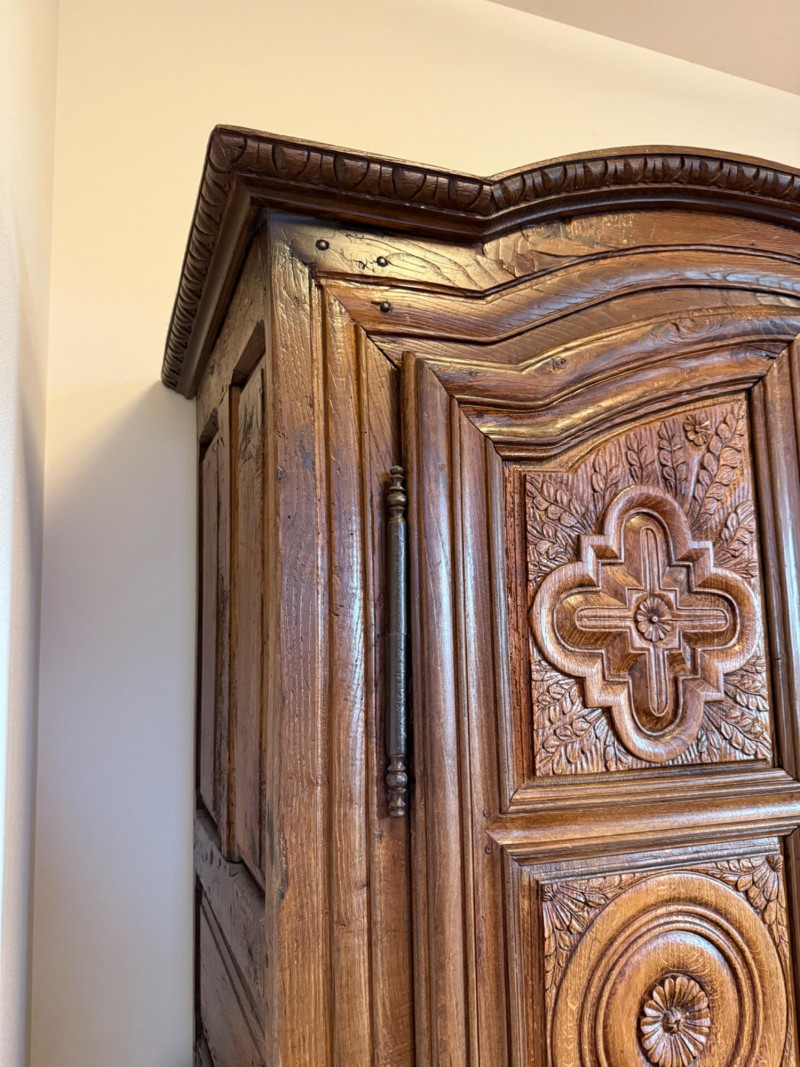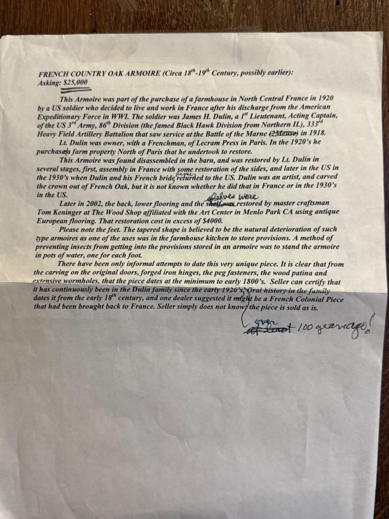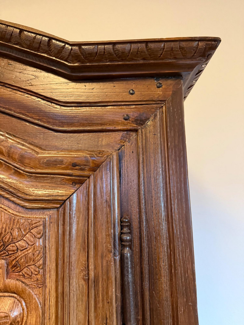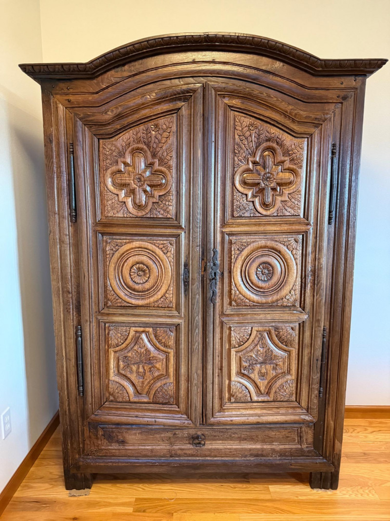 An exceptional antique French provincial armoire crafted from solid oak, showcasing richly hand-carved panels and an elegant arched bonnet top. The double doors feature geometric and foliate motifs, including quatrefoil medallions and circular rosettes, surrounded by intricately chiseled borders of leaves and vines. The deep relief carving and heavy patina attest to its 18th–early 19th century origins, possibly earlier. The cabinet retains original hand-forged iron hardware, including long pin hinges and a large mortise lock plate. The interior has two fitted shelves and ample depth, suitable for linen, dishware, or wardrobe use. The back panels and floorboards were sympathetically restored in 2002 by master craftsman Tom Kenninger of The Wood Shop, Menlo Park, CA, using antique European flooring, a restoration valued over $4,000. This armoire was originally part of a farmhouse purchase in North Central France in 1920 by Lt. James H. Dulin, a decorated U.S. Army officer of the 333rd Heavy Field Artillery Battalion (Black Hawk Division, WWI). After his discharge, Lt. Dulin settled in France and acquired the piece from a French farm near Paris. The armoire was later disassembled and shipped to the U.S., where the Dulin family continued its care through multiple generations. The documentation accompanying the piece notes that Lt. Dulin was also an artist who may have contributed to the restoration or carving details himself in the 1930s. The family retained continuous ownership for over 100 years, underscoring its strong provenance and preservation history. Note: Items inside the cabinet aren't included. French provincial armoires such as this were the centerpiece of rural homes, serving as both storage and a symbol of craftsmanship. The deeply relief-carved panels and arched cornice suggest regional influences from Normandy or Burgundy, where oak was the dominant material and designs reflected both Baroque and rustic Rococo traditions. A fine example of authentic 18th–19th century French cabinetry, combining artistry, provenance, and preservation. Its historical link to the post–WWI expatriate community adds unique narrative appeal. Comparable French oak armoires of this quality and documented provenance typically command $20,000–$30,000 in fine art and antiques auctions. Estimate: $20,000 – $25,000Provenance