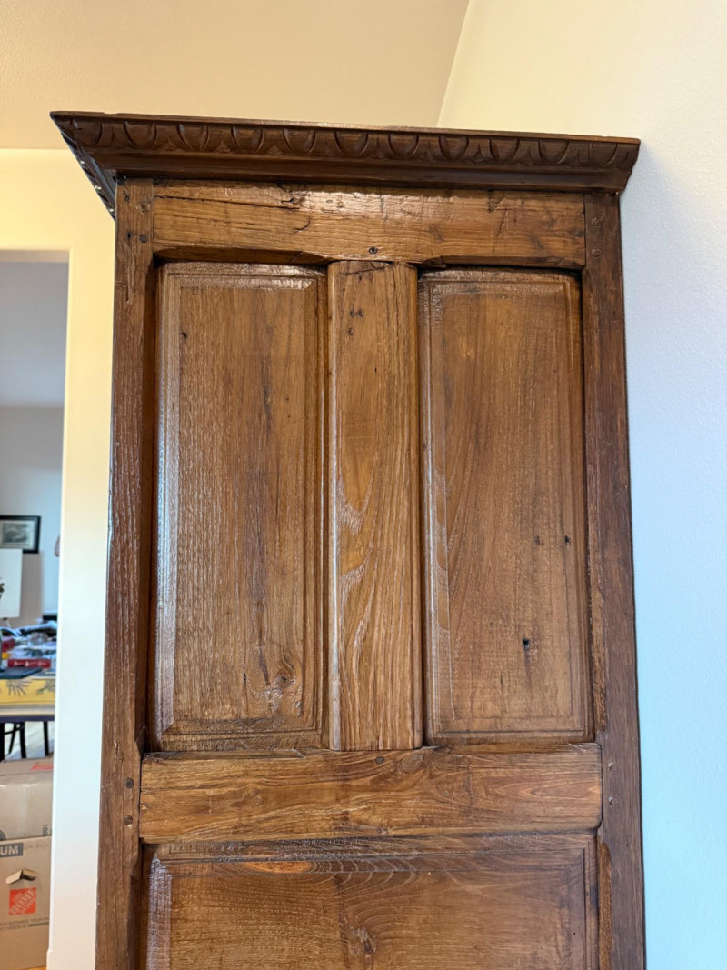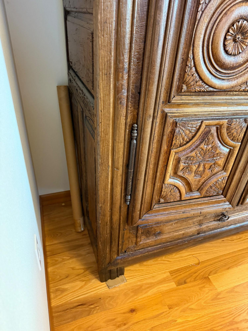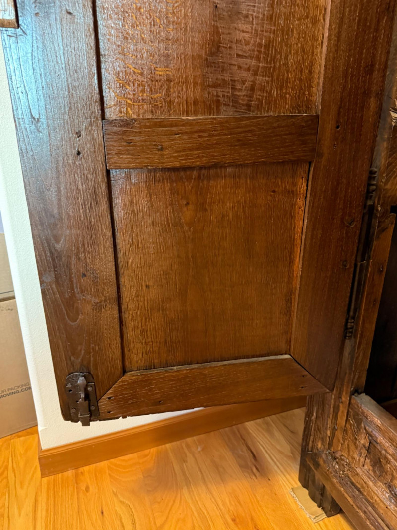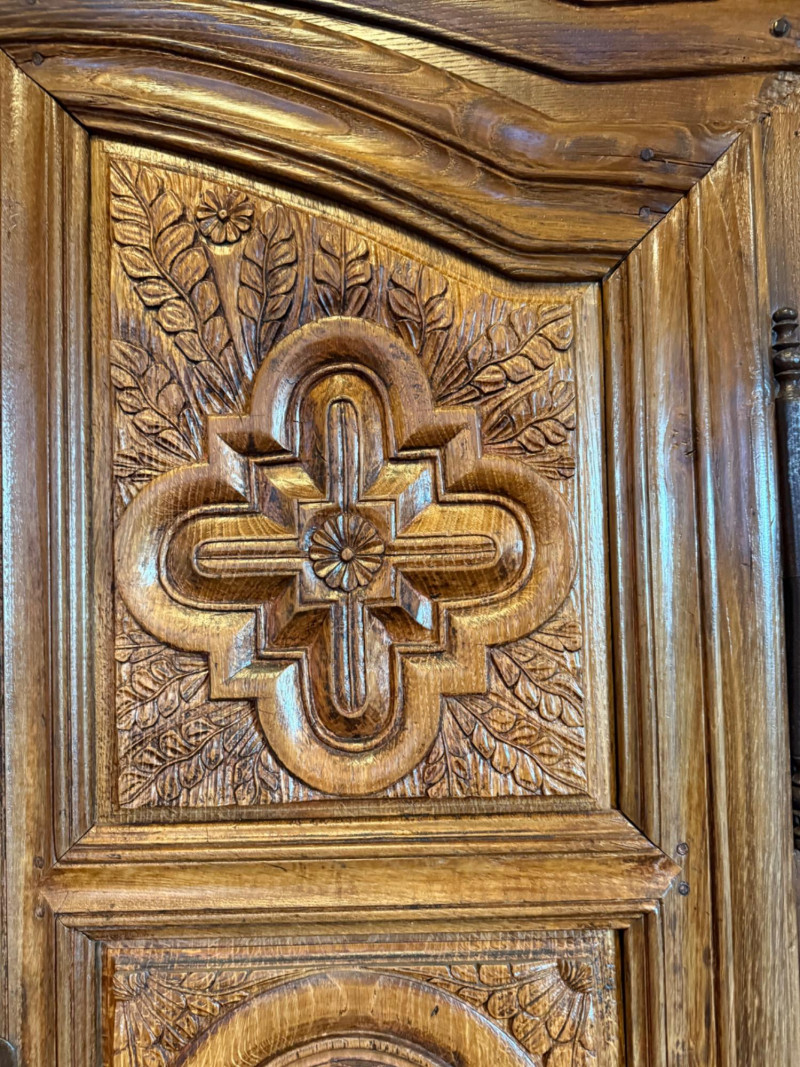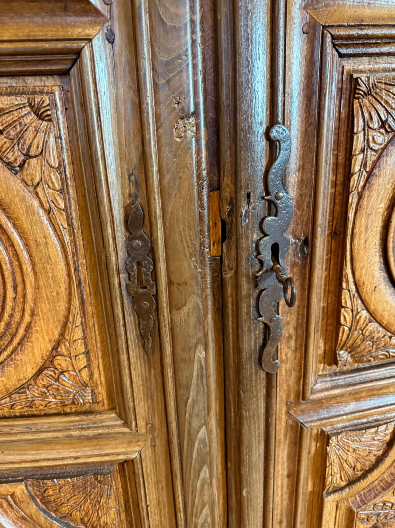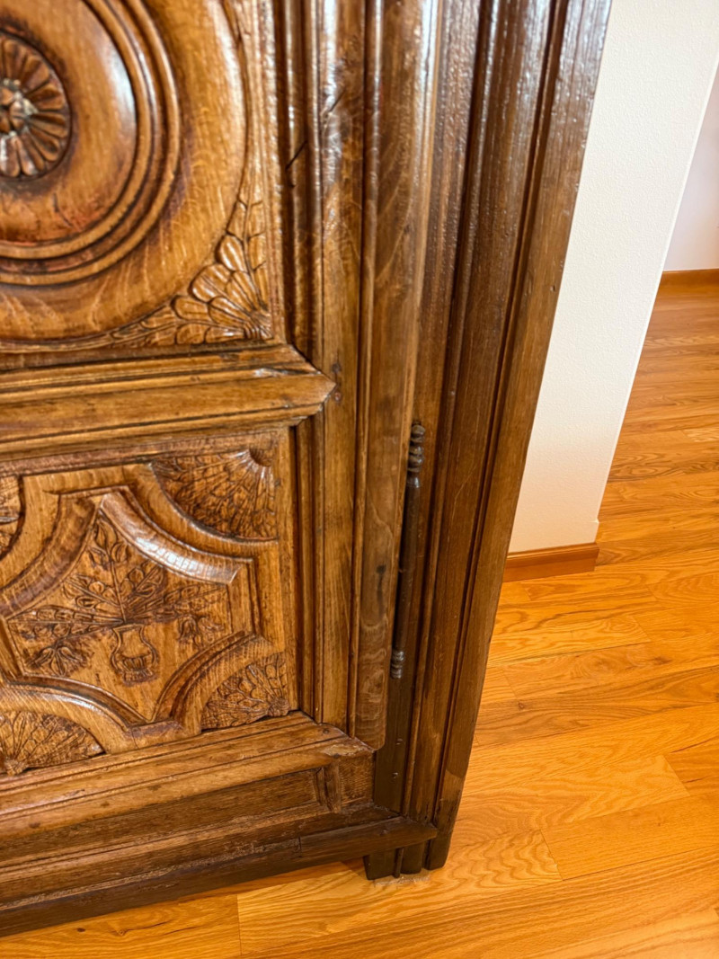 An exceptional antique French provincial armoire crafted from solid oak, showcasing richly hand-carved panels and an elegant arched bonnet top. The double doors feature geometric and foliate motifs, including quatrefoil medallions and circular rosettes, surrounded by intricately chiseled borders of leaves and vines. The deep relief carving and heavy patina attest to its 18th–early 19th century origins, possibly earlier. The cabinet retains original hand-forged iron hardware, including long pin hinges and a large mortise lock plate. The interior has two fitted shelves and ample depth, suitable for linen, dishware, or wardrobe use. The back panels and floorboards were sympathetically restored in 2002 by master craftsman Tom Kenninger of The Wood Shop, Menlo Park, CA, using antique European flooring, a restoration valued over $4,000. This armoire was originally part of a farmhouse purchase in North Central France in 1920 by Lt. James H. Dulin, a decorated U.S. Army officer of the 333rd Heavy Field Artillery Battalion (Black Hawk Division, WWI). After his discharge, Lt. Dulin settled in France and acquired the piece from a French farm near Paris. The armoire was later disassembled and shipped to the U.S., where the Dulin family continued its care through multiple generations. The documentation accompanying the piece notes that Lt. Dulin was also an artist who may have contributed to the restoration or carving details himself in the 1930s. The family retained continuous ownership for over 100 years, underscoring its strong provenance and preservation history. Note: Items inside the cabinet aren't included. French provincial armoires such as this were the centerpiece of rural homes, serving as both storage and a symbol of craftsmanship. The deeply relief-carved panels and arched cornice suggest regional influences from Normandy or Burgundy, where oak was the dominant material and designs reflected both Baroque and rustic Rococo traditions. A fine example of authentic 18th–19th century French cabinetry, combining artistry, provenance, and preservation. Its historical link to the post–WWI expatriate community adds unique narrative appeal. Comparable French oak armoires of this quality and documented provenance typically command $20,000–$30,000 in fine art and antiques auctions. Estimate: $20,000 – $25,000Provenance