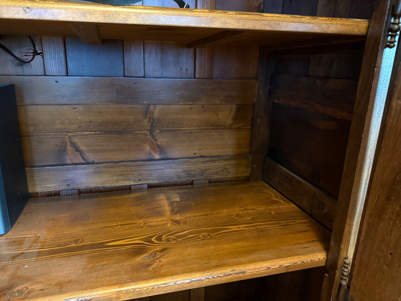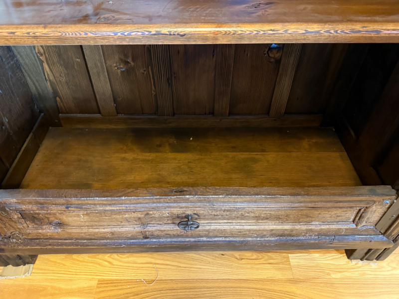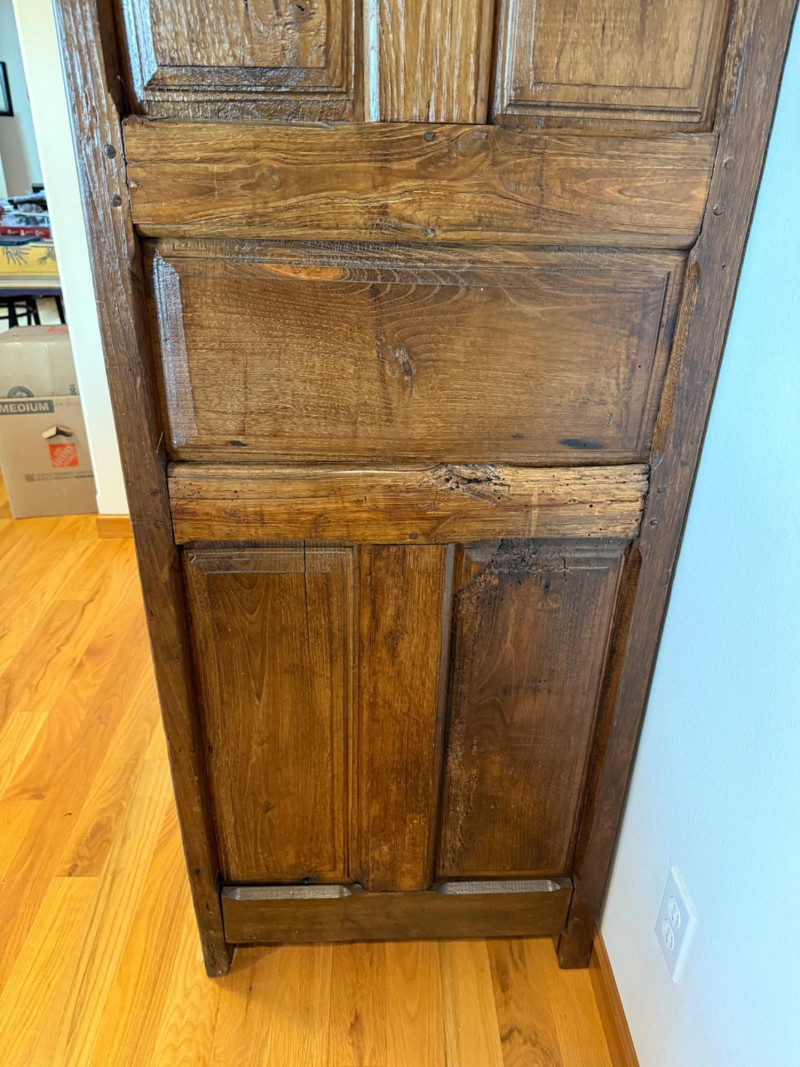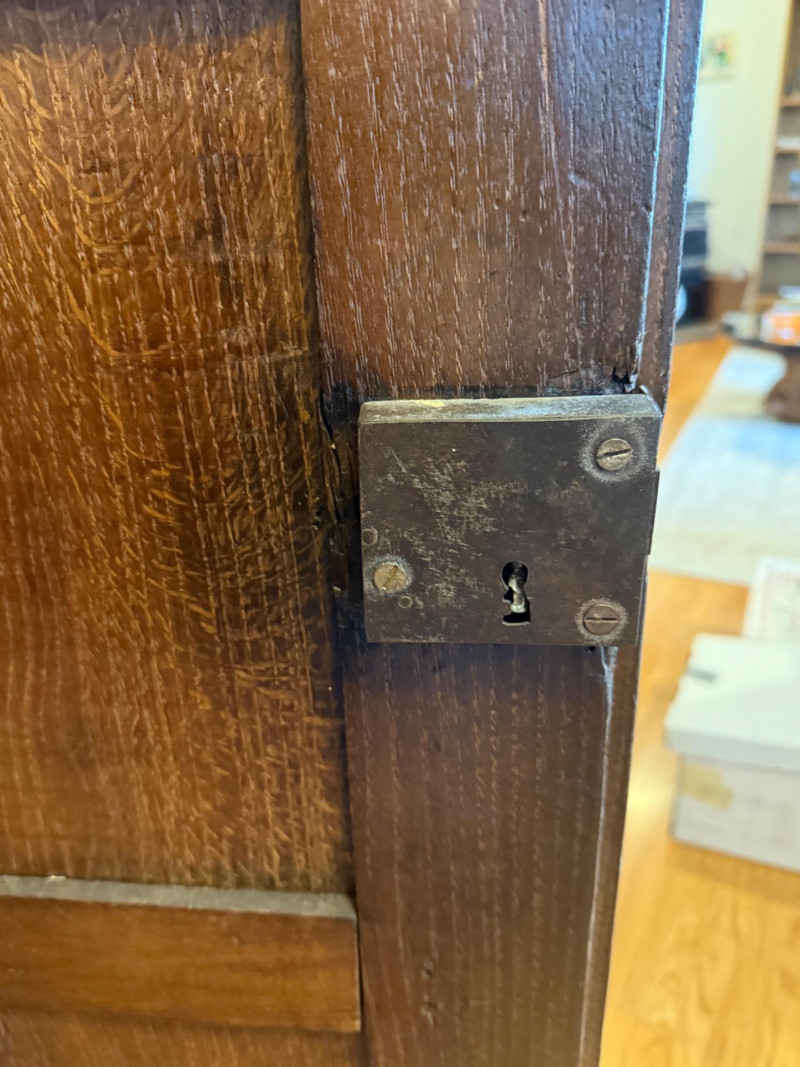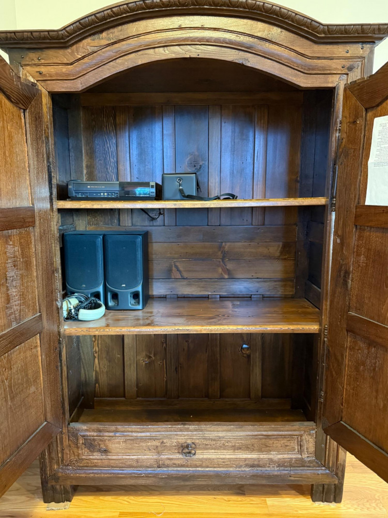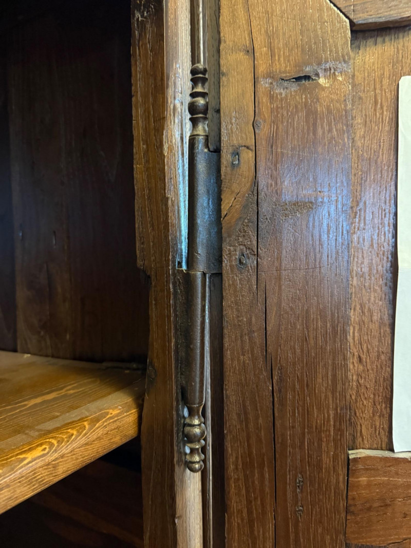 An exceptional antique French provincial armoire crafted from solid oak, showcasing richly hand-carved panels and an elegant arched bonnet top. The double doors feature geometric and foliate motifs, including quatrefoil medallions and circular rosettes, surrounded by intricately chiseled borders of leaves and vines. The deep relief carving and heavy patina attest to its 18th–early 19th century origins, possibly earlier. The cabinet retains original hand-forged iron hardware, including long pin hinges and a large mortise lock plate. The interior has two fitted shelves and ample depth, suitable for linen, dishware, or wardrobe use. The back panels and floorboards were sympathetically restored in 2002 by master craftsman Tom Kenninger of The Wood Shop, Menlo Park, CA, using antique European flooring, a restoration valued over $4,000. This armoire was originally part of a farmhouse purchase in North Central France in 1920 by Lt. James H. Dulin, a decorated U.S. Army officer of the 333rd Heavy Field Artillery Battalion (Black Hawk Division, WWI). After his discharge, Lt. Dulin settled in France and acquired the piece from a French farm near Paris. The armoire was later disassembled and shipped to the U.S., where the Dulin family continued its care through multiple generations. The documentation accompanying the piece notes that Lt. Dulin was also an artist who may have contributed to the restoration or carving details himself in the 1930s. The family retained continuous ownership for over 100 years, underscoring its strong provenance and preservation history. Note: Items inside the cabinet aren't included. French provincial armoires such as this were the centerpiece of rural homes, serving as both storage and a symbol of craftsmanship. The deeply relief-carved panels and arched cornice suggest regional influences from Normandy or Burgundy, where oak was the dominant material and designs reflected both Baroque and rustic Rococo traditions. A fine example of authentic 18th–19th century French cabinetry, combining artistry, provenance, and preservation. Its historical link to the post–WWI expatriate community adds unique narrative appeal. Comparable French oak armoires of this quality and documented provenance typically command $20,000–$30,000 in fine art and antiques auctions. Estimate: $20,000 – $25,000Provenance
