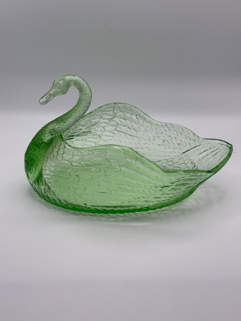 A molded green Vaseline glass dish in the form of a swan, measuring 8.5" long by 5.5" wide. The swan’s arched neck and head form the front of the piece, while the wings and body create a shallow bowl suitable for wrapped candies, trinkets, or display. The glass is textured to mimic feathering, with molded detail along the wings, tail, and base. The piece is pressed rather than blown, with a flat base and defined mold lines. Glass Type: Uranium-infused Vaseline glass (glows under UV light) Color: Translucent yellow-green Finish: Glossy with molded feather texture Construction: Pressed glass with visible mold seams Base: Flat, unmarkedMaterial & Features