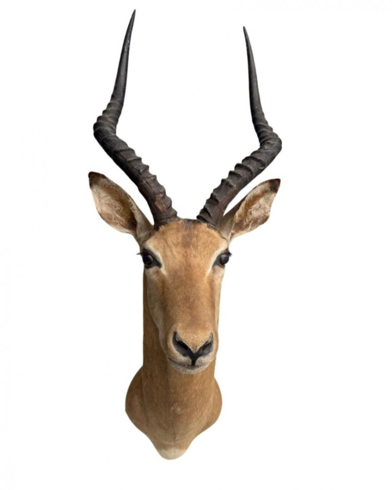 Lot 21 – Safari Decor / Natural History A professionally mounted impala shoulder taxidermy featuring lifelike preservation and striking upward-curving horns. The mount includes the head and upper neck, with natural fur coloration and alert ear positioning. The spiraled horns are symmetrical and well-preserved, curving upward and slightly inward with ridged texture. The facial features are cleanly set, with glass eyes and a neutral expression.