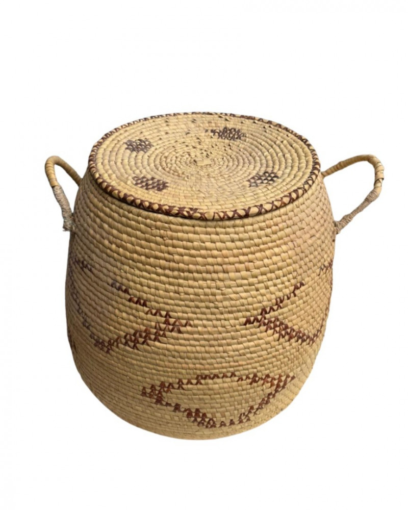 A handwoven lidded basket crafted from natural fibers using a tight coiling technique. The basket features symmetrical geometric patterns in brown against a tan base, woven into both the body and the domed lid. Two looped side handles are integrated into the structure for easy carrying. The lid fits snugly and mirrors the basket’s decorative motif, creating a unified and functional design. Design Features: Coiled construction with tight, uniform stitching Symmetrical geometric motifs woven into body and lid Domed lid with matching pattern and snug fit Two looped side handles for carrying Flat base for stable display