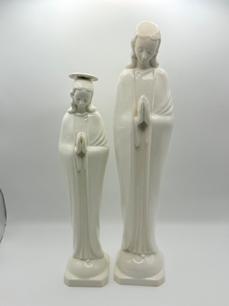 A matched pair of white glazed ceramic figurines by Goebel, depicting religious figures in prayerful poses. Each figure stands with hands pressed together and head gently bowed. The shorter figure features a halo and stylized robes, representing an angel or saint. The taller figure, with longer hair and no halo, likely represents the Virgin Mary. Both pieces reflect Goebel’s signature smooth finish and serene styling, with minimalist contours and reverent expression. Maker: Goebel (Germany) Material: Glazed porcelain ceramic Color: Pure white with glossy finish Details