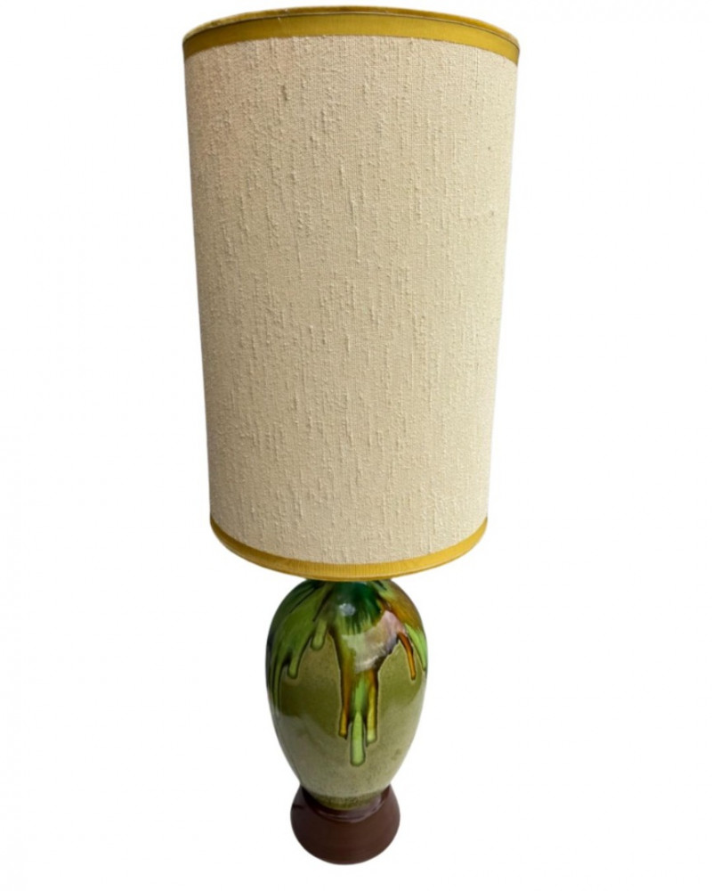 Vintage ceramic lamp attributed to Honi Chilo, featuring a tall cylindrical shade and a glossy drip-glaze base in green and brown tones. The ceramic body sits on a circular wooden stand, and the shade is wrapped in textured beige fabric with yellow trim at the top and bottom. A bold mid-century accent with sculptural presence and collectible appeal. Important Details: Maker: Honi Chilo Material: Ceramic base, wood stand, fabric shade Color: Green and brown glaze; beige shade with yellow trim Dimensions: Approx. 36" H × 16" W Design Features: Glossy drip-glaze ceramic body Tall textured shade with yellow trim Circular wooden base