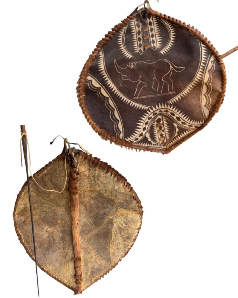 Tribal Decor / Vintage Weaponry A traditional African shield crafted from stretched animal hide over a bent wooden frame, featuring a central carved rhinoceros motif surrounded by symmetrical geometric and tribal designs. The surface is painted and shaved to reveal layered textures, with the hide stitched along the perimeter using leather strips. A wooden spear or handle is affixed to the back, suggesting ceremonial or display use. Length: 25.5 inches Width: 28 inches Depth: Varies with curvature; approx. 3–4 inches Material: Cowhide or buffalo hide stretched over wood Surface: Painted and shaved with geometric and animal motifs Design Features: Central rhinoceros carving in raised relief Symmetrical tribal patterns flanking the central motif Perimeter stitching with leather cord Attached wooden spear or handle on reverse Dimensions (approximate)