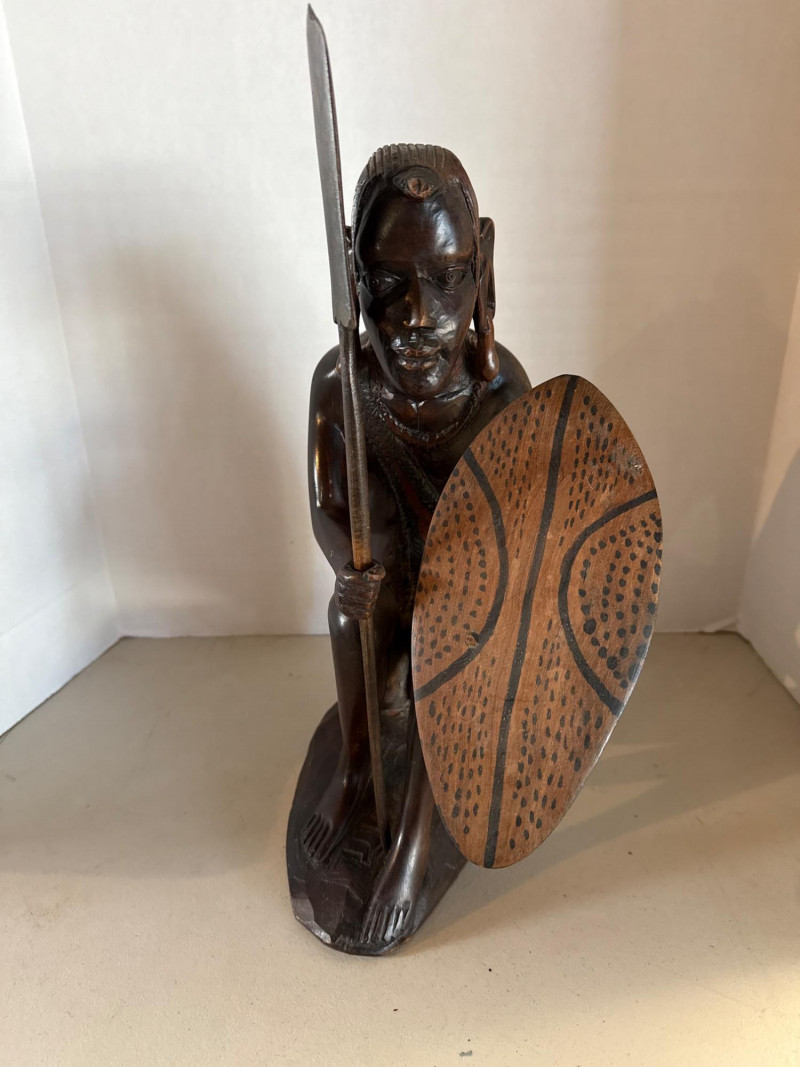 The statue is typically made from carved wood, possibly Jacaranda wood. The figure is shown in a crouching or seated position, holding a long spear and a distinctive oval shield. The shield features a traditional design, often with colors like red, black, or brown, which can indicate the warrior's status or experience.