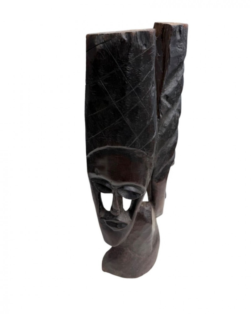 Tribal Decor / Ethnographic Art A hand-carved wooden sculpture depicting a stylized human face with elongated features and abstract proportions. The piece is carved from a single block of dark hardwood, with deep-set eyes, a long nose, and a narrow mouth. The top of the head features intricate linear carvings, possibly representing hair, braiding, or a ceremonial headdress. The top edge is uneven, suggesting either intentional artistic finish or breakage. The overall form is vertical and mask-like, with a strong sculptural presence. Material: Solid carved hardwood Color: Deep brown with natural grain and patina Finish: Matte with visible tool marks and age wear Design Features: Elongated facial proportions with stylized symmetry Deeply carved eyes, nose, and mouth Top of head features linear carvings resembling braids or headdress Uneven top edge—possibly unfinished or broken Flat base for upright displayDetails