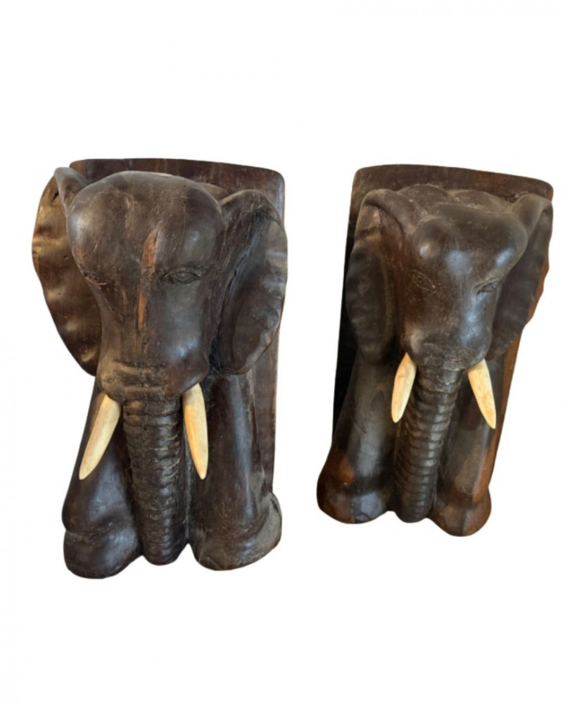 A pair of hand-carved wooden elephant head sculptures designed as bookends, each featuring detailed facial contours, flared ears, and downward-curving trunks. The tusks are crafted from a lighter material—likely faux ivory or bone substitute—and are smoothly inset into the face. The wood is dark and richly grained, with a matte finish that highlights the carved texture. The elephants face forward in mirrored symmetry, making them ideal for shelf display or functional use. Material: Carved hardwood with bone tusks Color: Deep brown wood; tusks in cream or bone tone Finish: Matte with visible grain and tool marksDetails