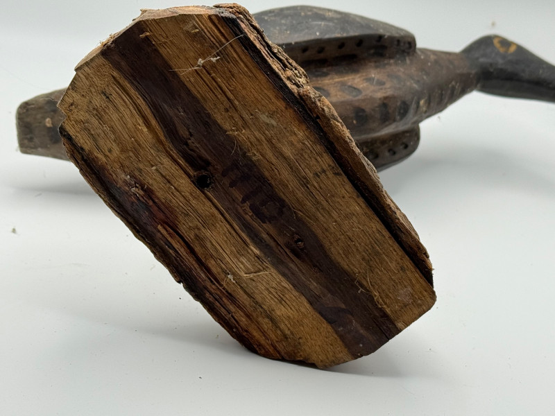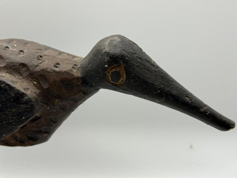 A handcrafted wooden sculpture of a curlew bird, mounted on a natural log base. The bird is carved with a long, downward-curving beak and stylized feather texture, capturing the distinctive silhouette of this coastal wader. Painted in dark tones—black on the head and wings, with a brownish body—the figure features expressive yellow eyes with black pupils. The legs are made from two slender wooden dowels, giving the bird a perched stance atop a bark-textured base. Species Representation: Curlew (shorebird known for its long, curved bill) Material: Carved and painted wood; natural log baseDetails
