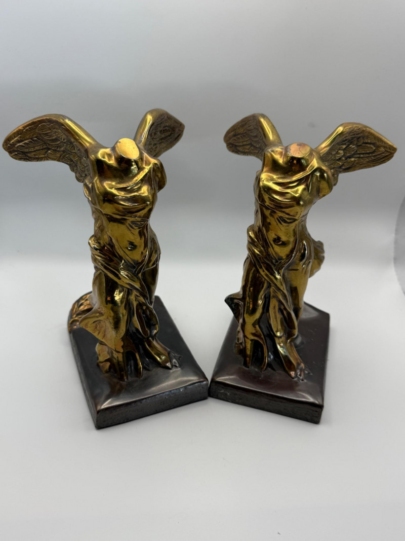 Winged Victory of Samothrace Bookends: Bronze-Toned Replicas of Hellenistic Grace This pair of sculptural bookends features miniature reproductions of the Winged Victory of Samothrace, also known as Nike of Samothrace, a celebrated Hellenistic statue dating to the 2nd century BCE. The original, housed in the Louvre, is renowned for its dynamic form and expressive drapery. Material: Cast in a bronze-colored composite or metal, giving the pieces a classical patina and weight suitable for functional display. Form: Each figure is headless and armless, consistent with the original statue’s fragmentary condition. The wings are fully extended, and the garments appear wind-swept, conveying motion and triumph. Base: Mounted on rectangular plinths, allowing the sculptures to serve as stable bookends while preserving their sculptural integrity. Origin of Design: The Nike of Samothrace was created to commemorate a naval victory and is considered a masterpiece of Hellenistic sculpture for its dramatic pose and mastery of form. Symbolism: Nike, the Greek goddess of victory, represents triumph, movement, and divine favor, making these bookends not only decorative but symbolically resonant. Function: Ideal for classical-themed interiors, libraries, or collectors of Greco-Roman art, these bookends blend aesthetic refinement with practical use.Design and Features
