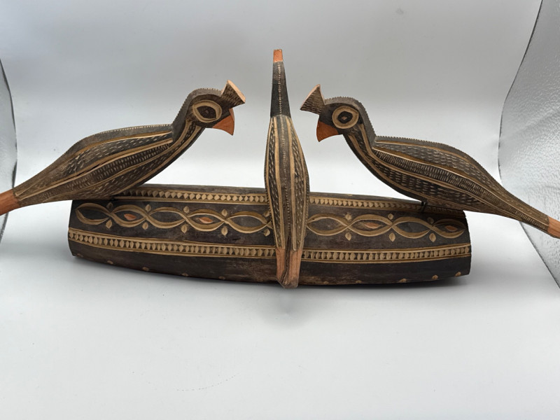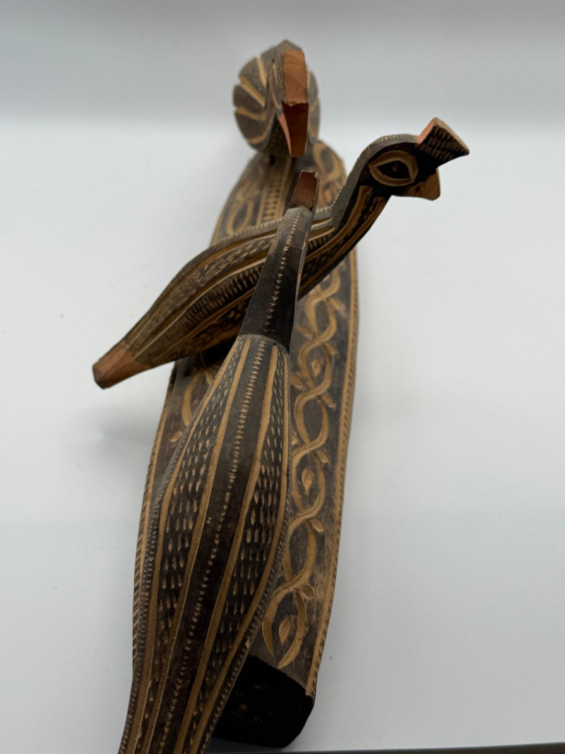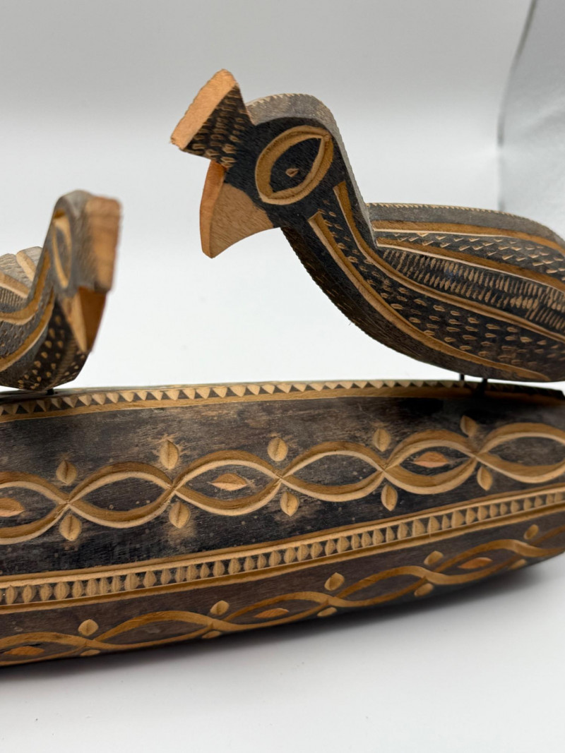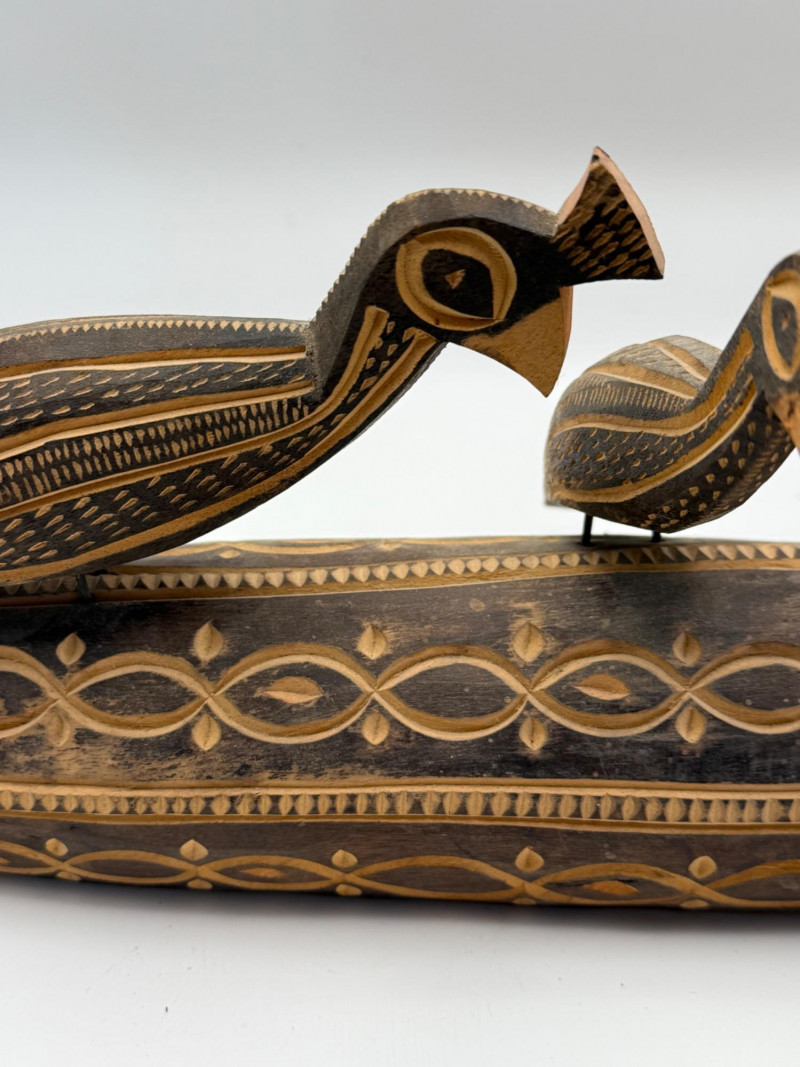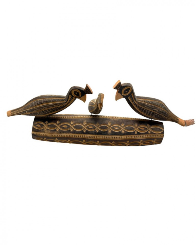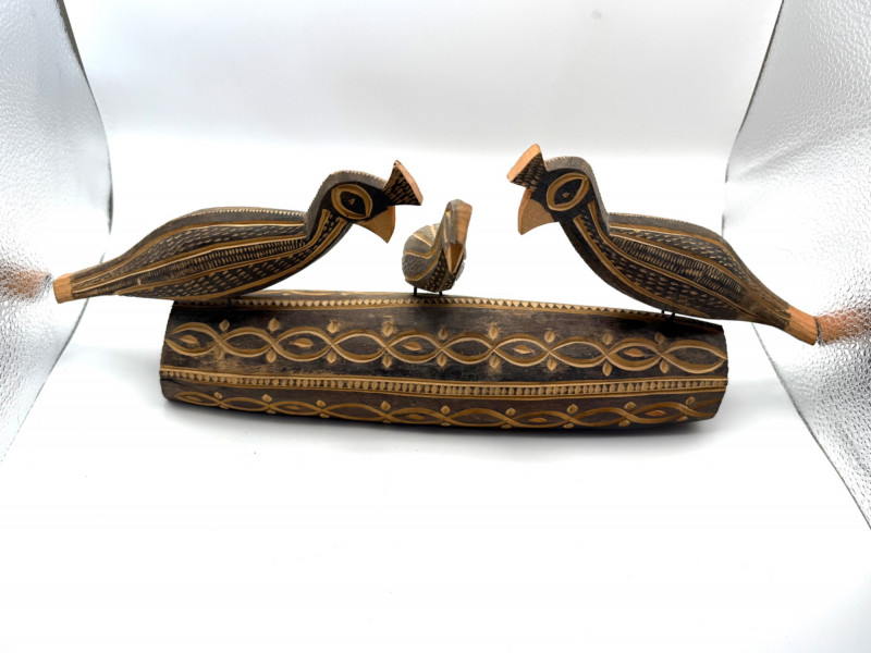 A hand-carved wooden sculpture featuring three stylized birds perched atop a decorated log base. Each bird is uniquely carved with incised feather patterns and painted in earthy tones of brown and black. The birds are positioned in a row, facing forward with upright posture and elongated forms. The log base is adorned with symmetrical geometric carvings, adding visual rhythm and cultural flair. The piece evokes themes of nature, family, and traditional craftsmanship, making it ideal for rustic or ethnographic interiors. Material: Carved and painted wood Color Scheme: Birds: Brown and black with etched feather detailing Base: Natural wood with carved geometric patterns Details