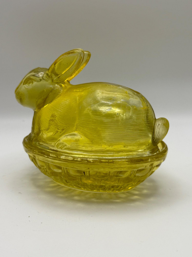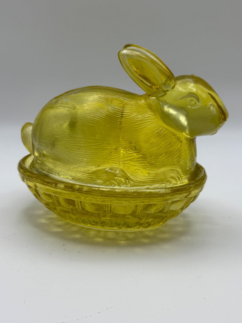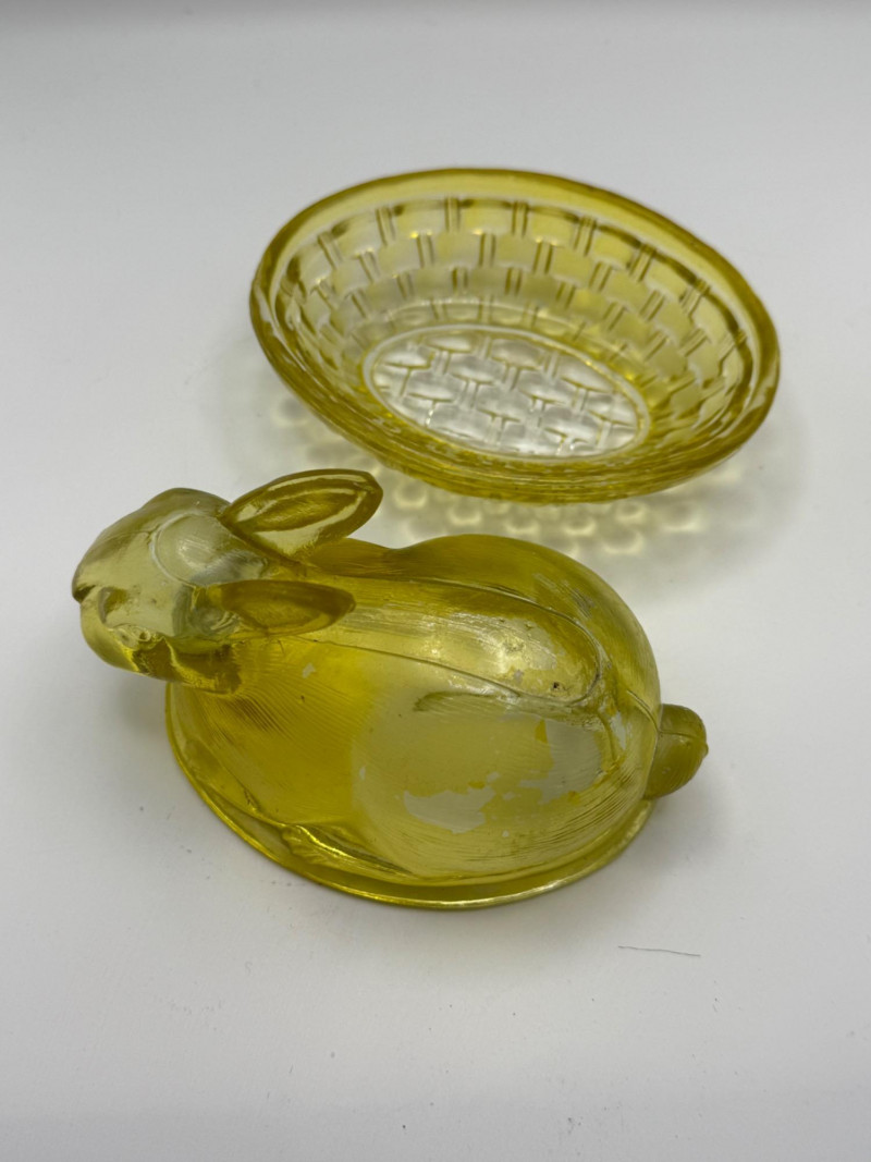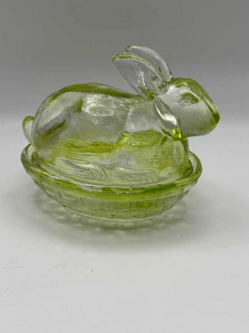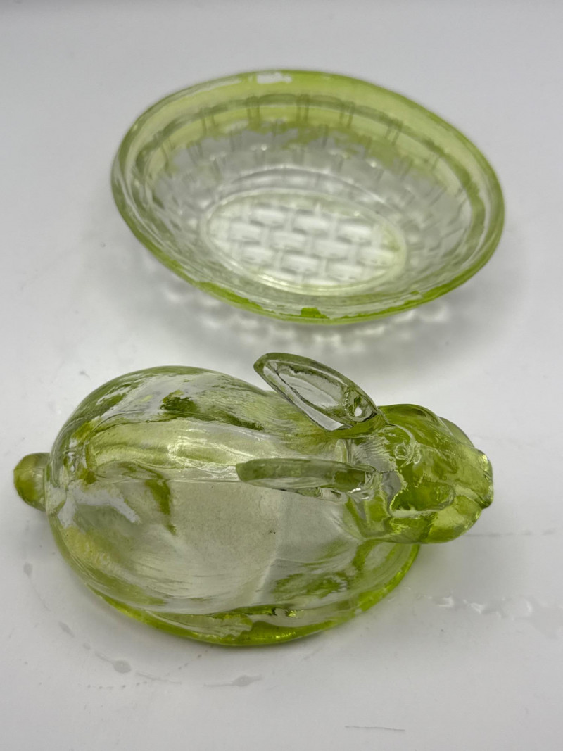 Charming vintage pressed glass containers featuring rabbit lids seated atop woven nest bases. One in lemon yellow, the other in soft spring green—both with molded fur and basket texture. Ideal for seasonal décor, candy display, or collectible glassware. Material: Pressed glass Age: Midcentury to late 20th century Style: Figural glass canisters with molded detail Important Details: Approx. 4.5" W × 4" H each; sold as a pair; no chips or cracks noted