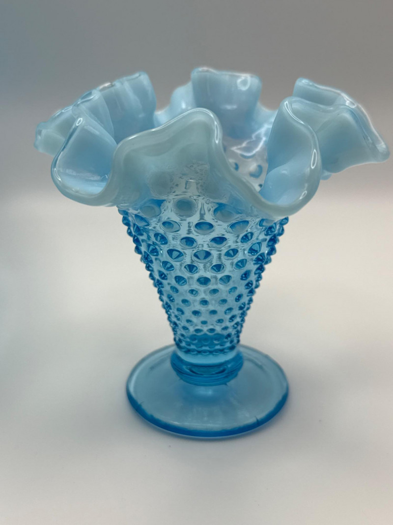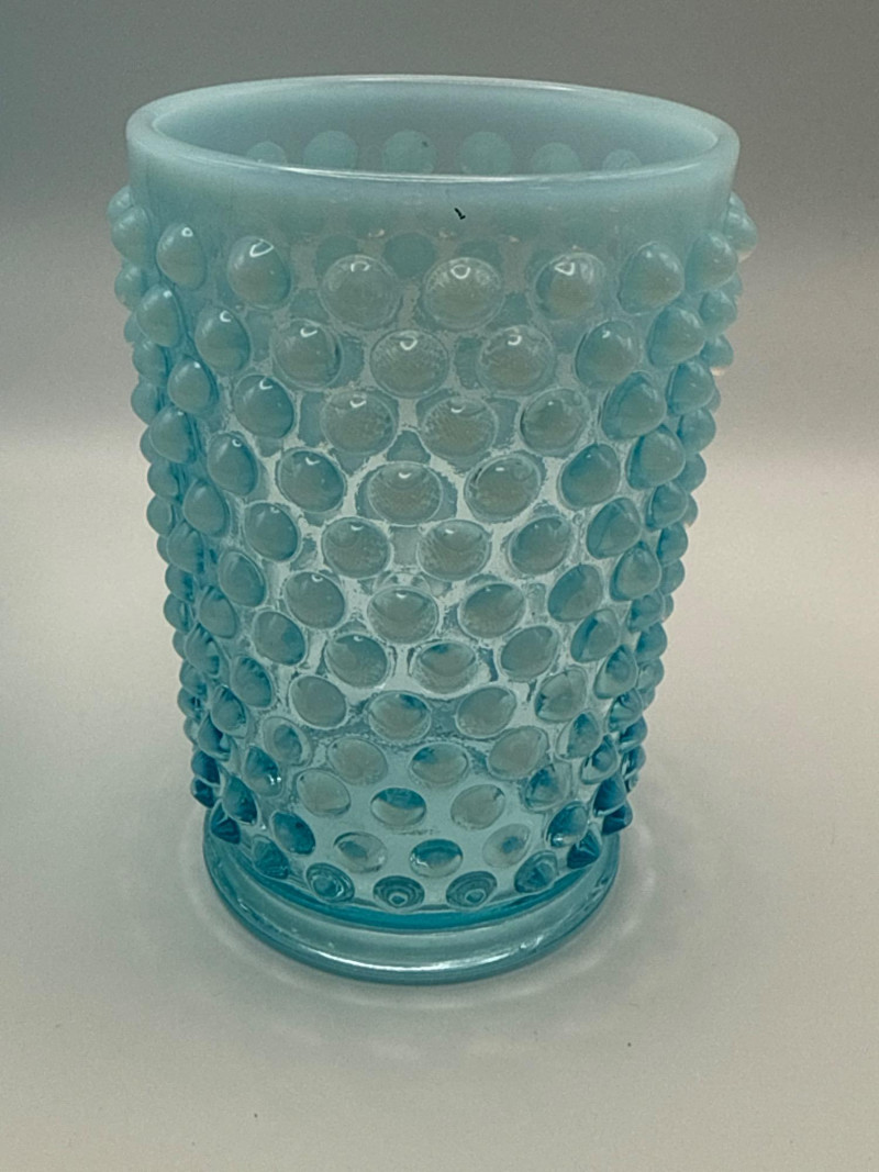 A trio of vintage blue opalescent glass pieces including a ruffled-edge footed bowl with floral embossing (Jefferson), a hobnail vase with flared rim (Fenton), and a hobnail tumbler (Fenton). These midcentury pieces showcase the luminous quality of opalescent glass and the distinctive textures of two iconic American glassmakers. Material: Opalescent pressed glass Age: Midcentury (circa 1940s–60s) Style: Hobnail and embossed floral with ruffled edges and footed base Important Details: Set of 3; Jefferson and Fenton glass; excellent condition with no chips or cracks noted