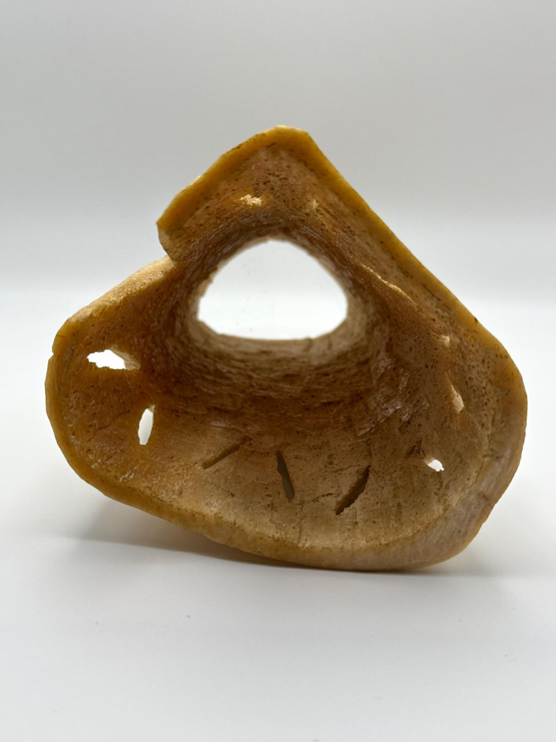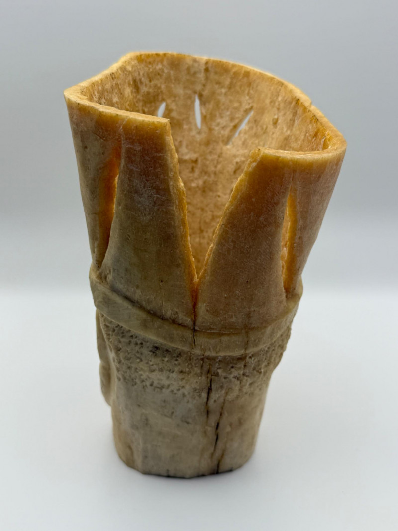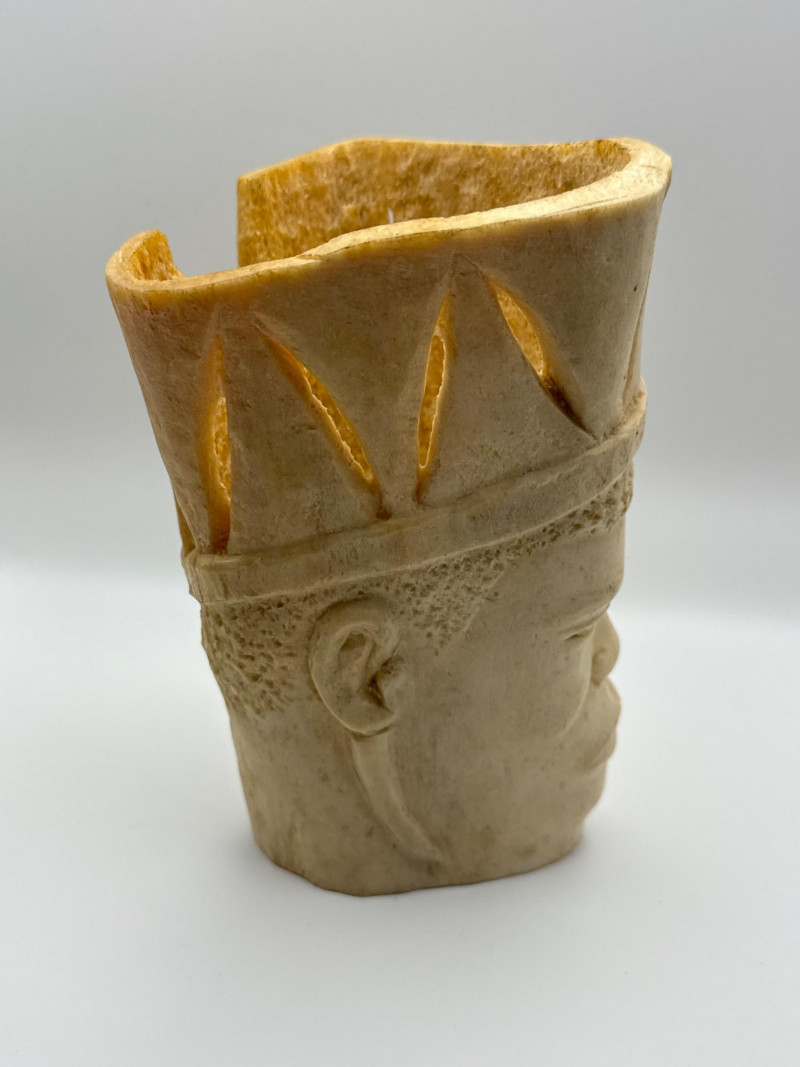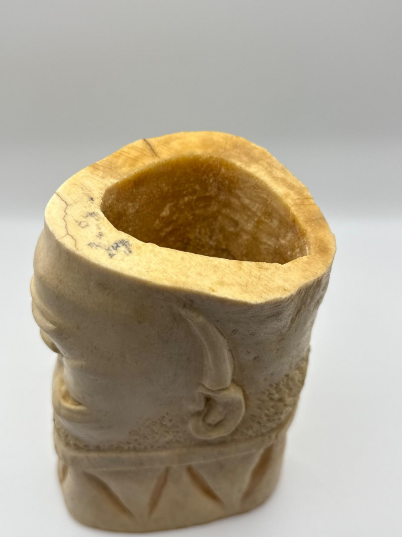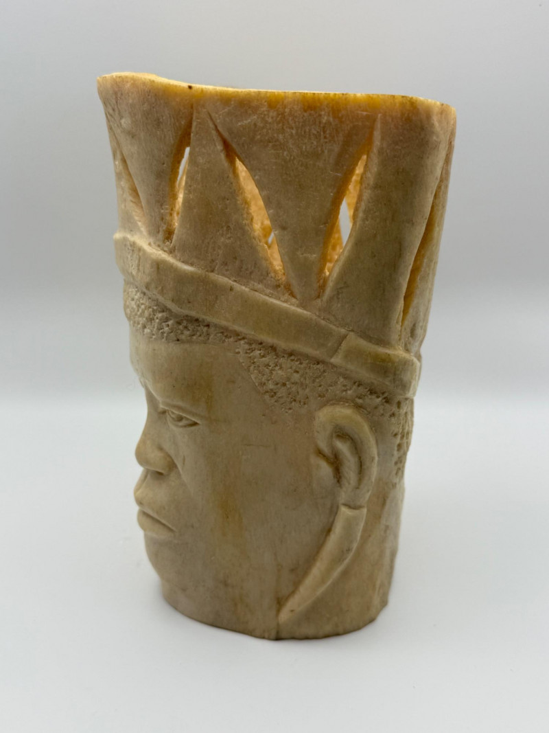 Hand-carved bust of a crowned figure rendered in natural bone, showcasing stylized facial features and a pierced triangular headdress. This piece reflects traditional African artisan techniques and cultural symbolism, likely crafted as a decorative or ceremonial object. Material: Carved bone Age: Vintage (mid to late 20th century) Style: African tribal with geometric crown motif Important Details: Approx. 6.5" H; finely detailed facial carving; pierced crown design; excellent condition