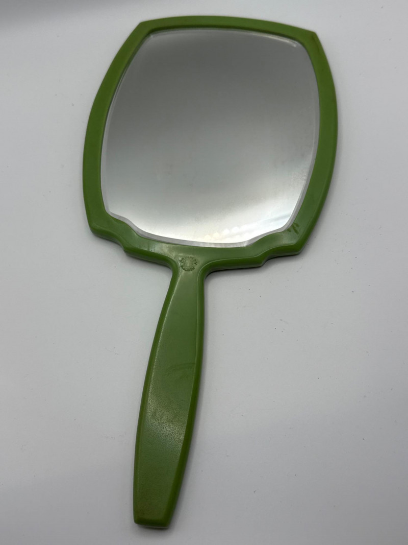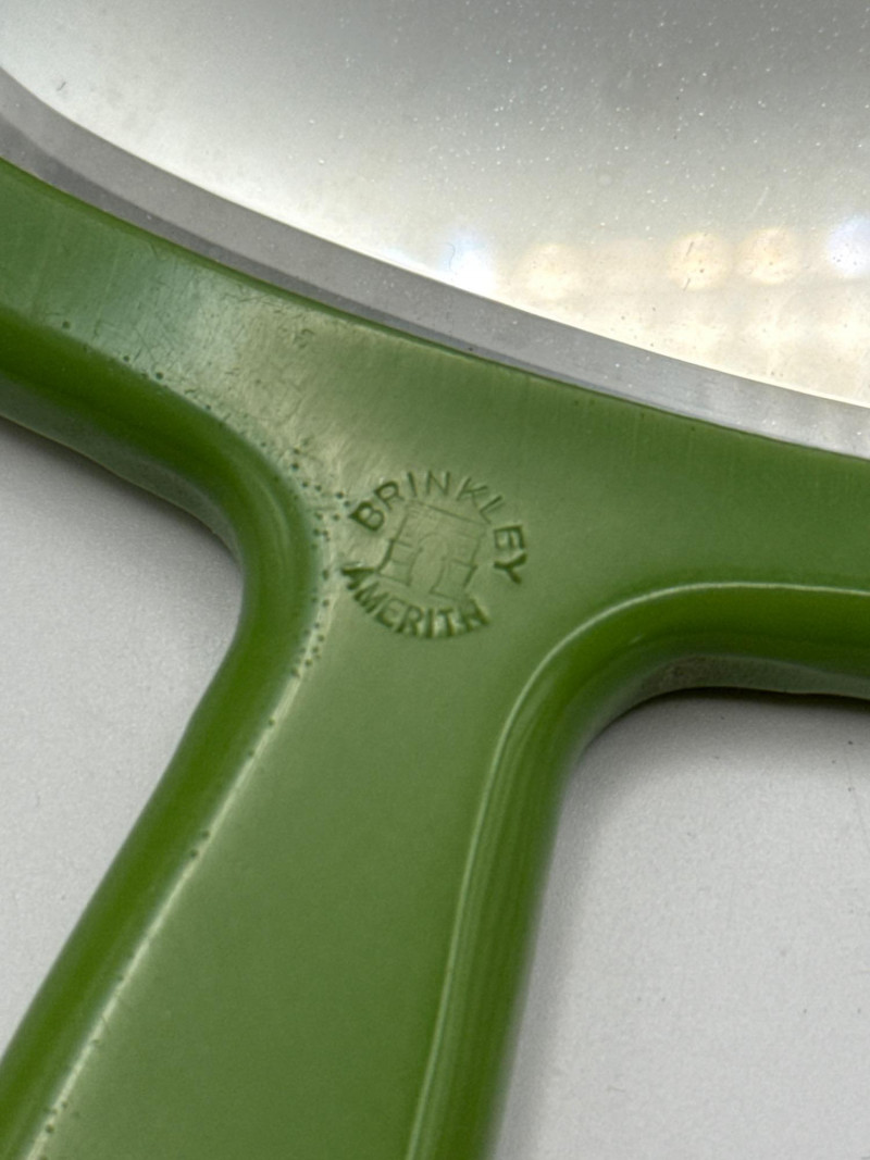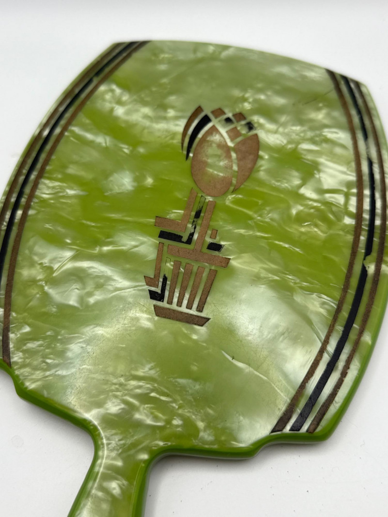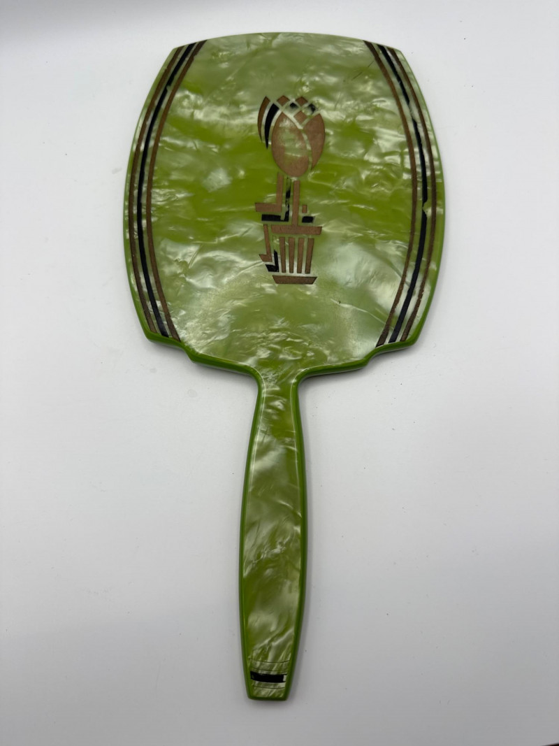 Vintage hand mirror made of green marbled celluloid, featuring a stylized Art Deco floral motif on the back. The symmetrical design includes a long handle and curved edges, with decorative black and brown framing lines. The back showcases a flower-in-pot motif rendered in brown and black, adding period charm and graphic appeal. This piece is attributed to Brinkley Amerith and reflects mid-century vanity design. Important Details: Maker: Brinkley Amerith Material: Celluloid Design Features: Green marbled finish Art Deco floral motif on reverse Black and brown framing accents Symmetrical shape with curved edges and long handle