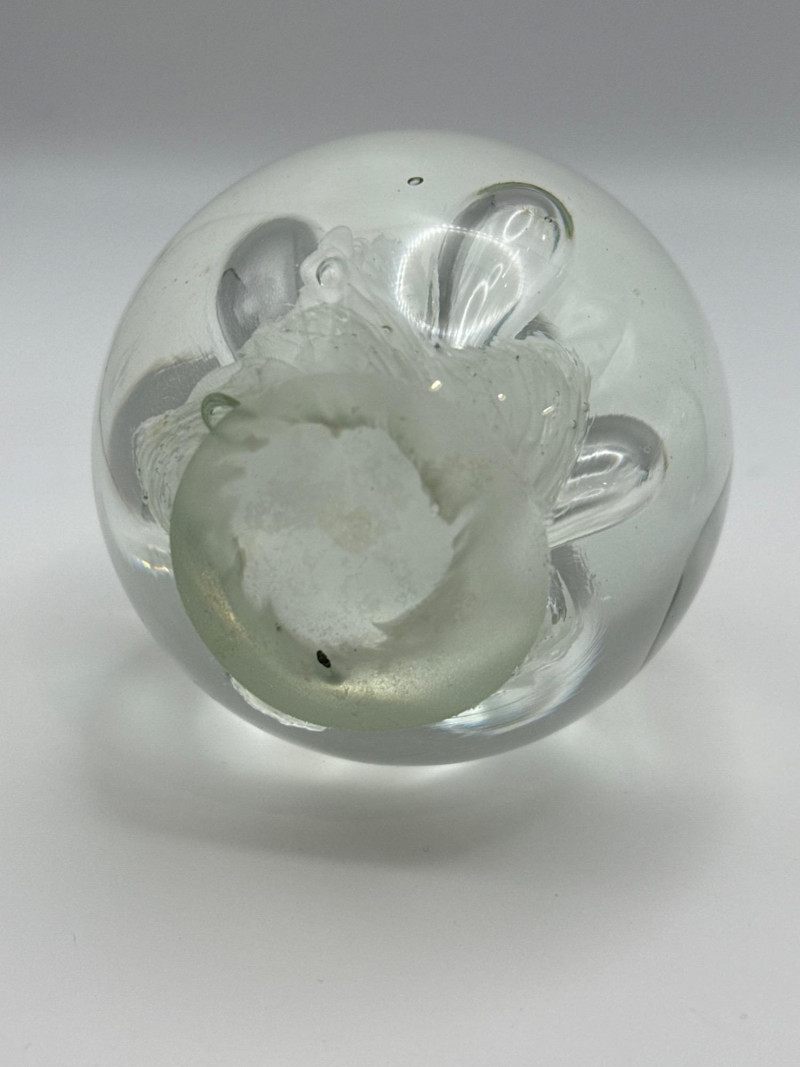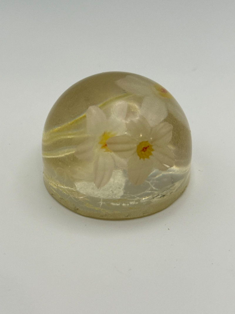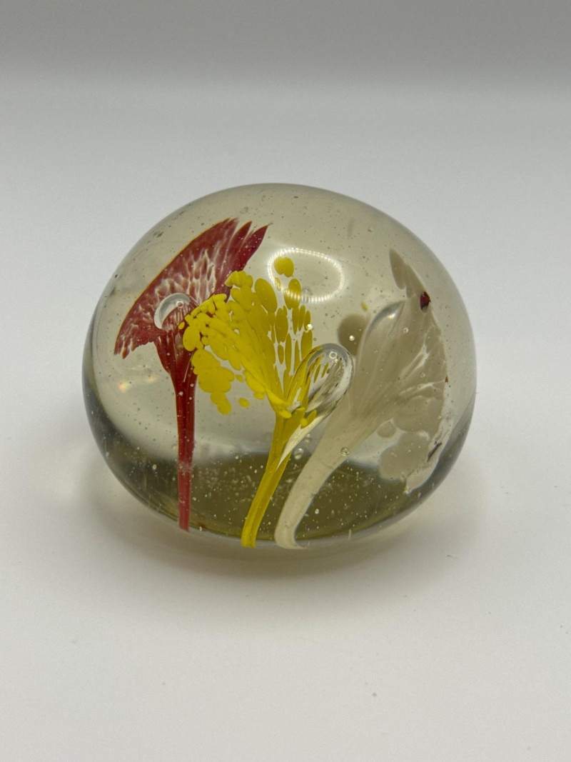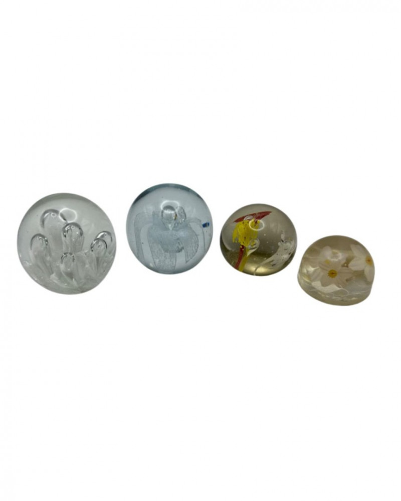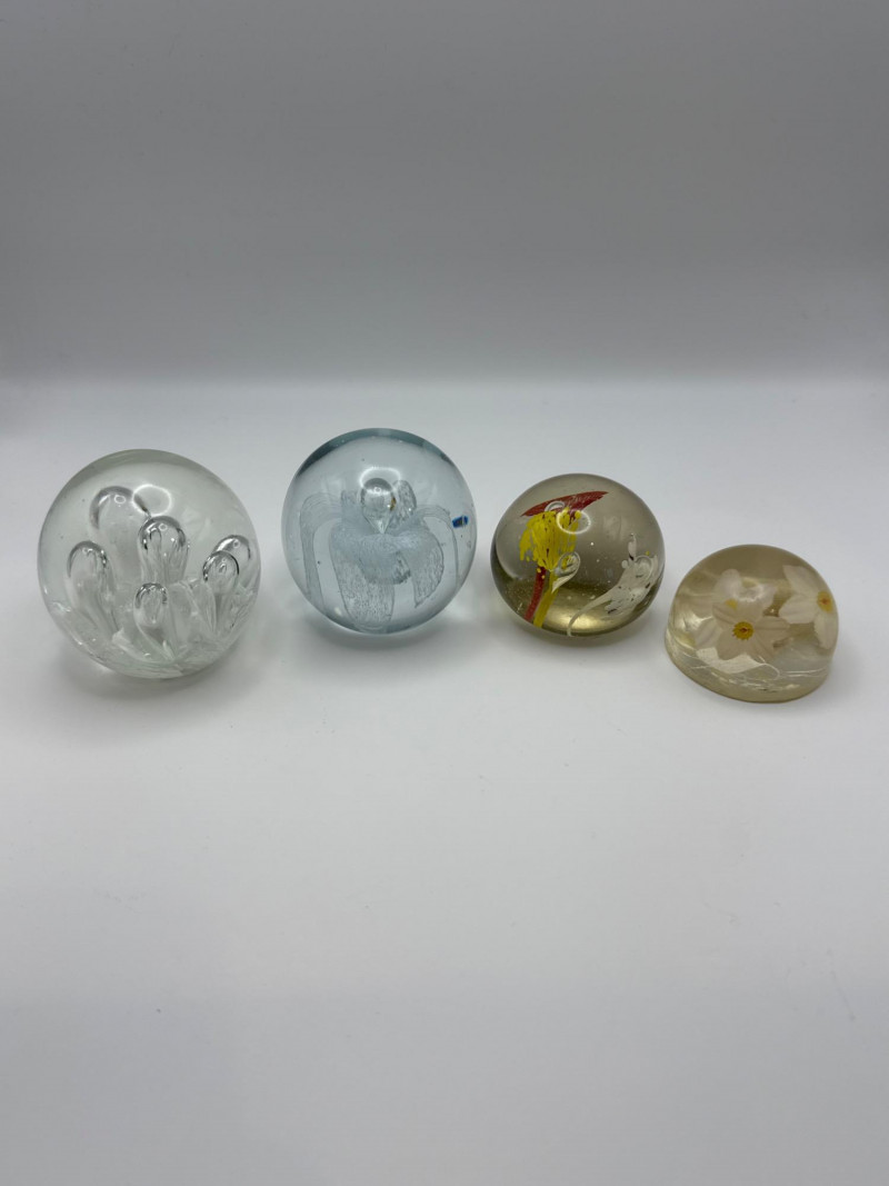 Grouping of four decorative paperweights featuring a mix of abstract and floral designs. Includes one acrylic piece (smallest), a clear sculptural form with flame-like curves, a dome with embedded white flowers and green leaves, and one additional abstract glass form. A visually varied set ideal for desk or display. Material: Acrylic and glass Age: Late 20th century Style: Mixed – abstract and floral Important Details: Smallest is acrylic; approx. 1.5"–2.5" H; no chips or cracks noted; display-ready