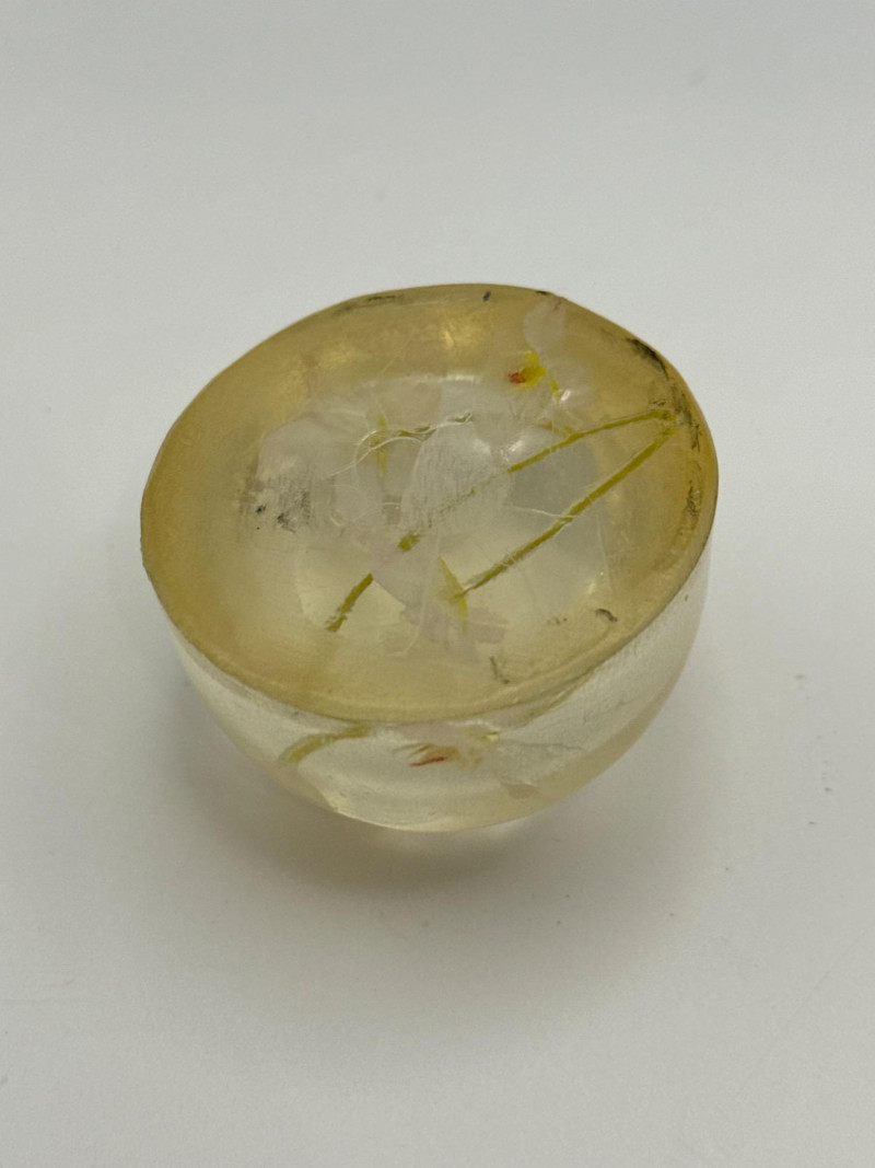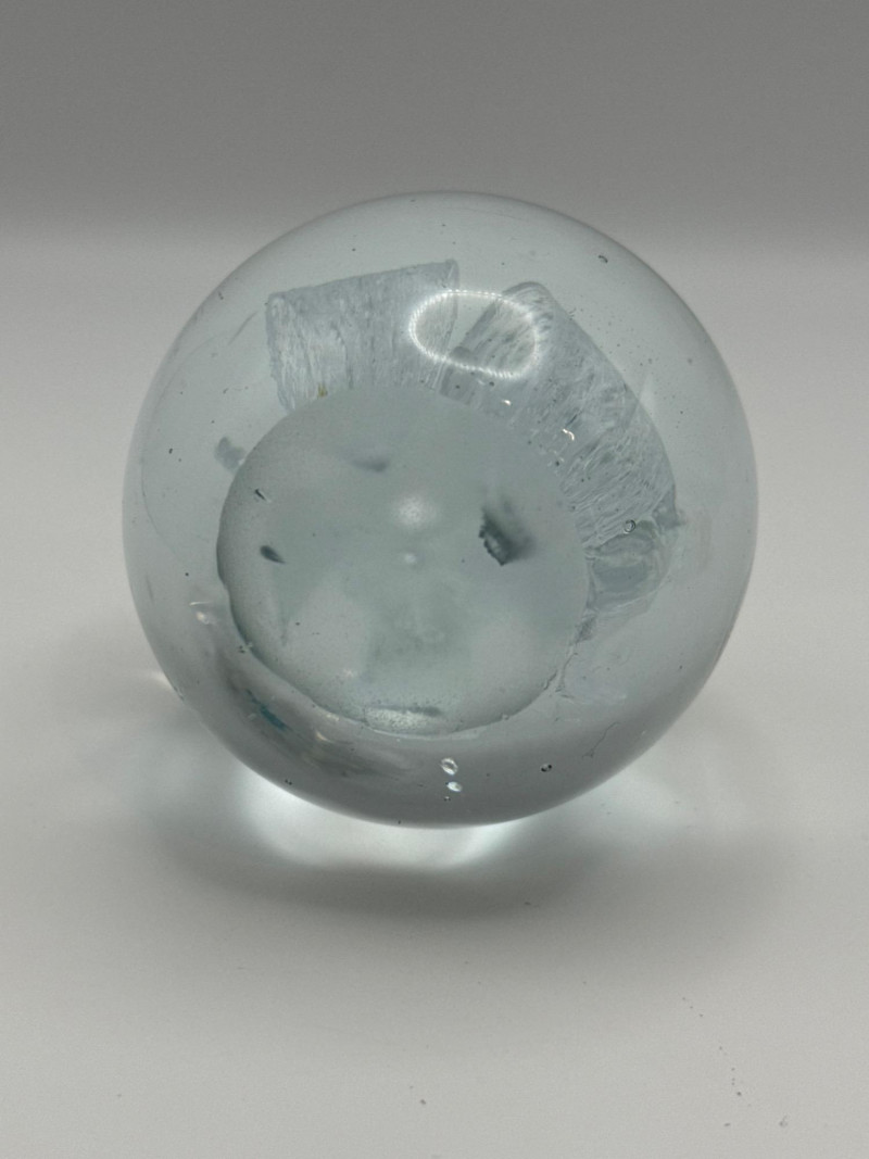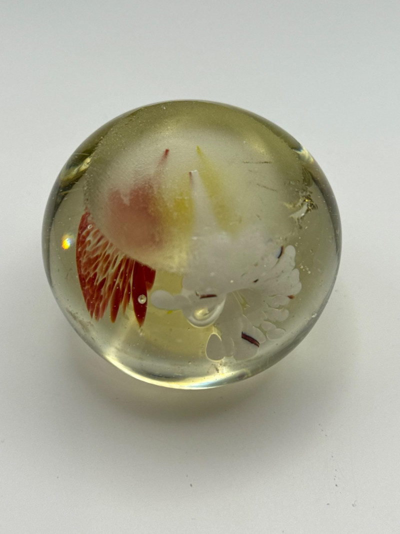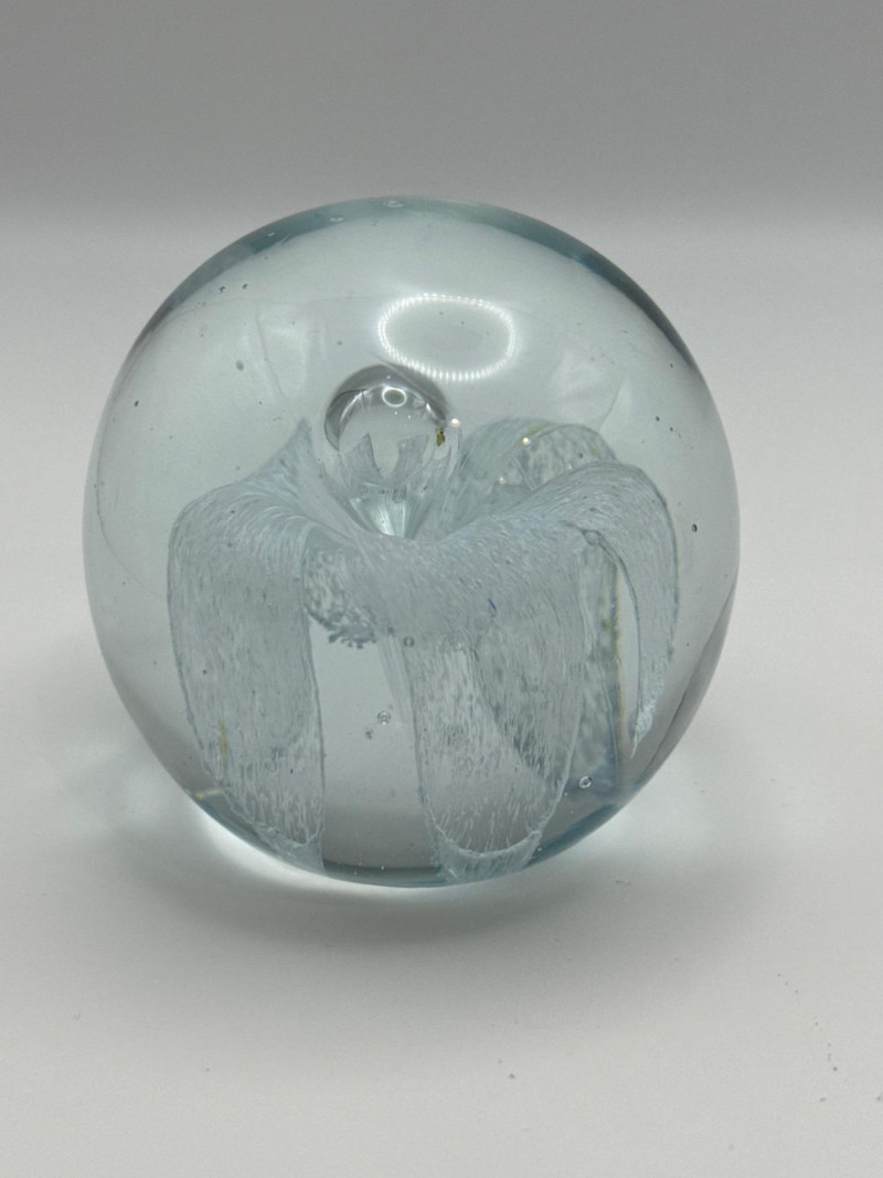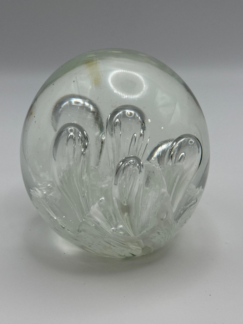 Grouping of four decorative paperweights featuring a mix of abstract and floral designs. Includes one acrylic piece (smallest), a clear sculptural form with flame-like curves, a dome with embedded white flowers and green leaves, and one additional abstract glass form. A visually varied set ideal for desk or display. Material: Acrylic and glass Age: Late 20th century Style: Mixed – abstract and floral Important Details: Smallest is acrylic; approx. 1.5"–2.5" H; no chips or cracks noted; display-ready