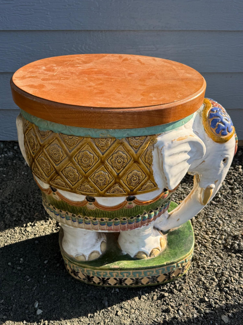 Ornate Elephant Ceramic StoolThis image shows a decorative elephant-shaped ceramic stool or side table placed outdoors on a gravel surface. The piece is artistically crafted with intricate detailing and vibrant colors, including gold, green, blue, and white.The elephant is designed with realistic features and is adorned with a patterned blanket-like motif across its back. The top surface is a smooth, round wooden platform, making it functional as a stool or small table. The base features geometric and floral designs in green and beige tones, adding to its ornate appearance.Overall, the object blends utility with cultural artistry, reflecting traditional Asian or Indian decorative styles. It stands out as a unique accent piece suitable for both indoor and outdoor settings.