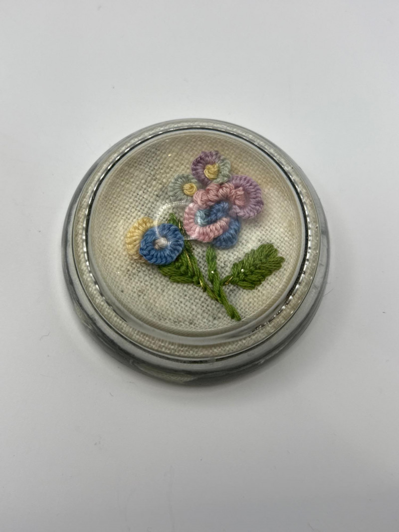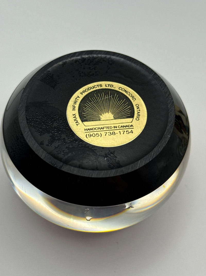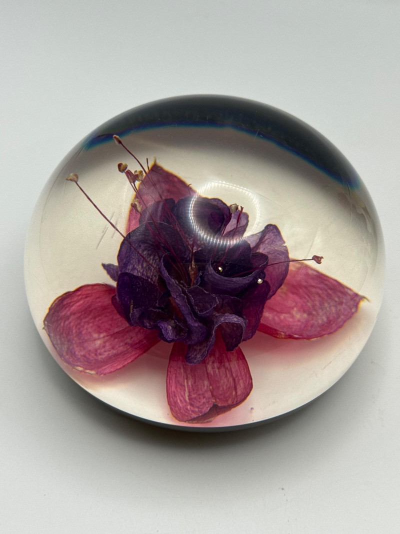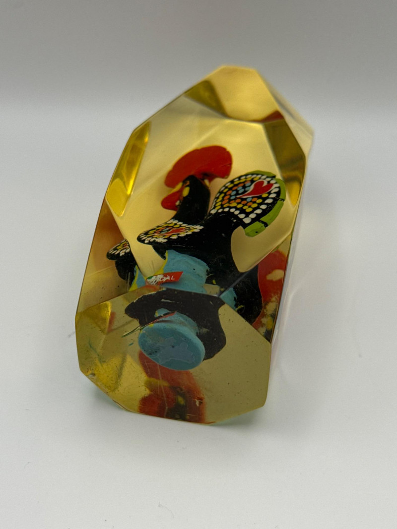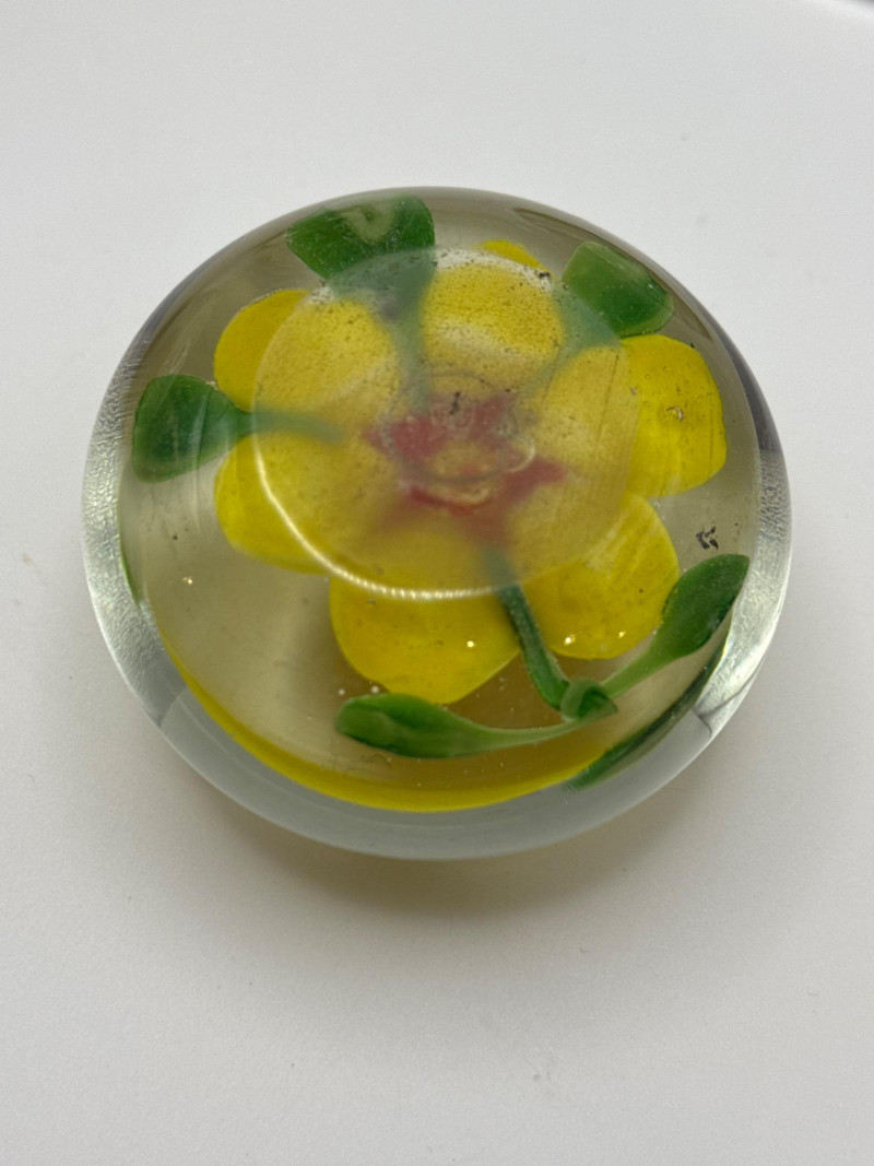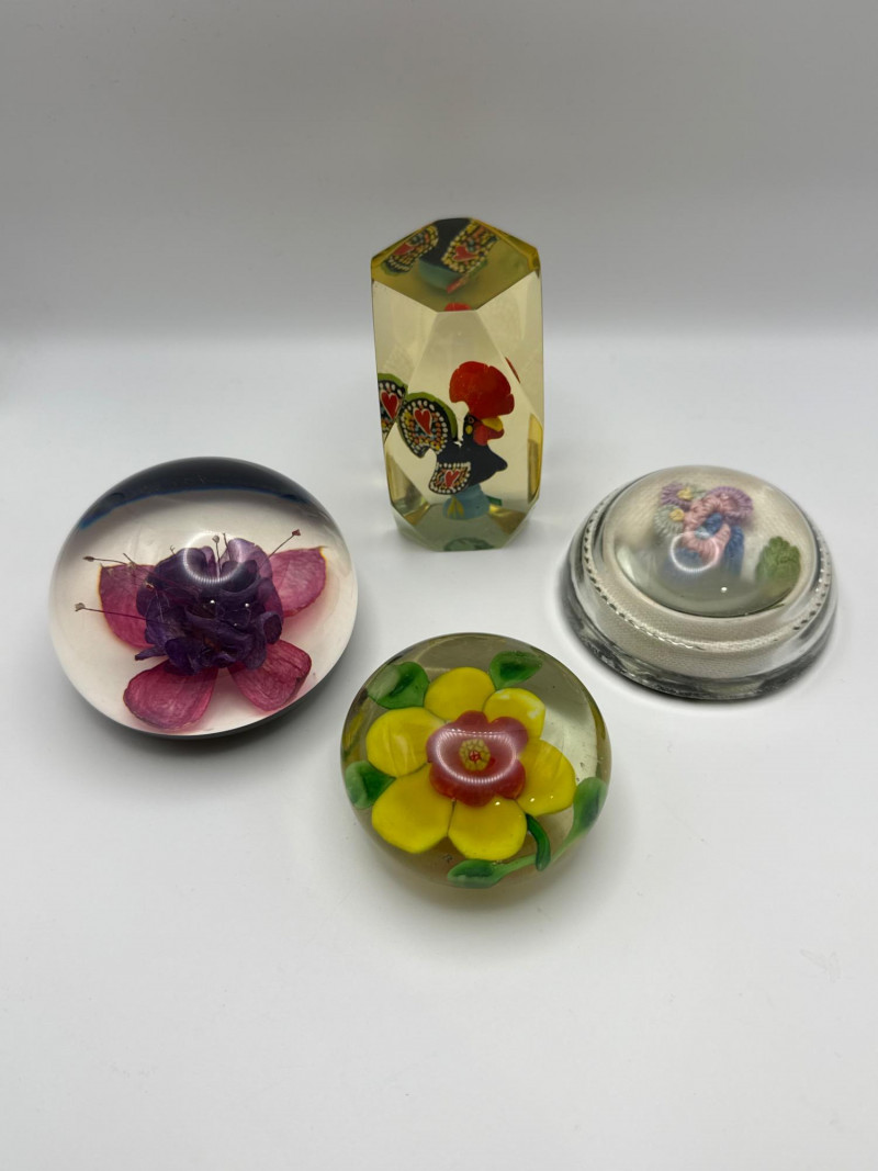 Set of four decorative paperweights featuring a mix of glass and acrylic construction. Includes one glass sphere with a vibrant yellow flower and three acrylic pieces: a purple-pink floral sphere, a hexagonal rooster motif with heart accents, and a dome-shaped paperweight with multicolored thread art. Each piece showcases distinct artistic styles—from folk-inspired to botanical—making this a playful and collectible desktop display. Important Details: Materials: Yellow flower paperweight: Glass Remaining three: Acrylic Dimensions: Approx. 2.5"–3.5" diameter each Design Features: Yellow glass sphere with embedded flower Acrylic purple-pink floral sphere Acrylic hexagonal rooster motif with heart accents Acrylic dome with multicolor thread embroidery Condition: Excellent; no chips or cracks