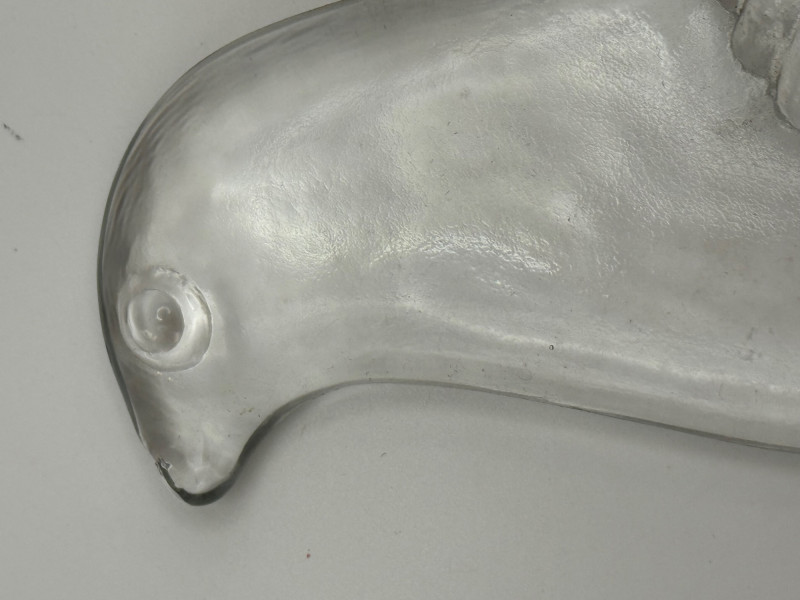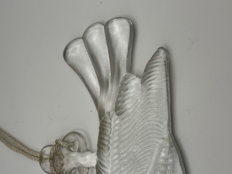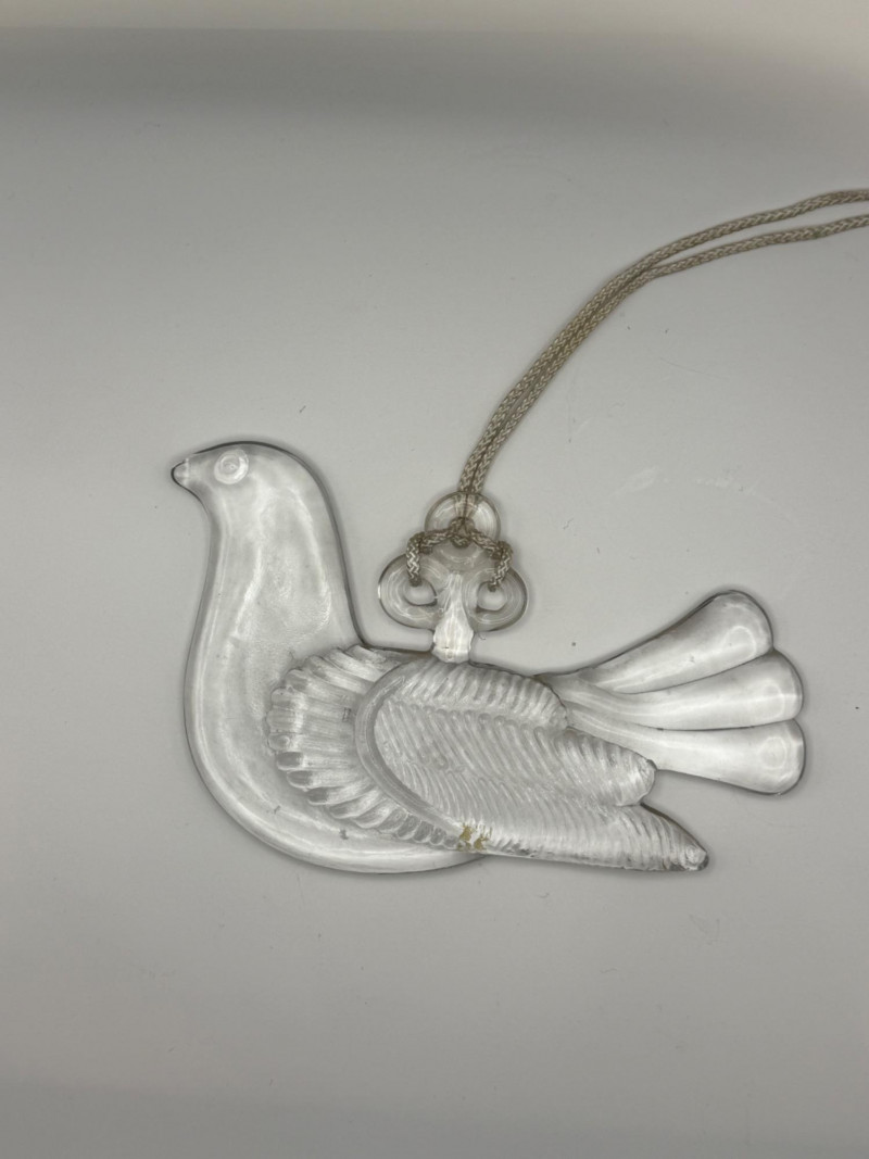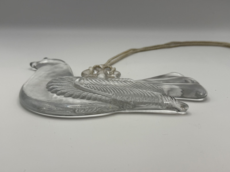 Translucent glass ornament shaped like a dove, designed by Kosta Boda. Features detailed feather engravings on wings and tail, with a loop at the top for hanging. The piece is crafted to catch and reflect light, making it ideal for window display or as a symbolic decorative accent. A braided string is attached for easy suspension. Important Details: Maker: Kosta Boda Material: Molded translucent glass Design Features: Dove shape with engraved feather details Hanging loop with braided string Light-catching clarity and texture