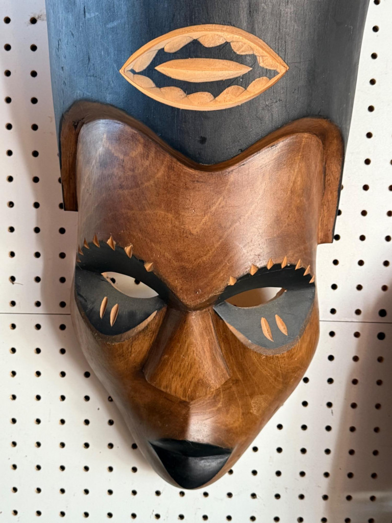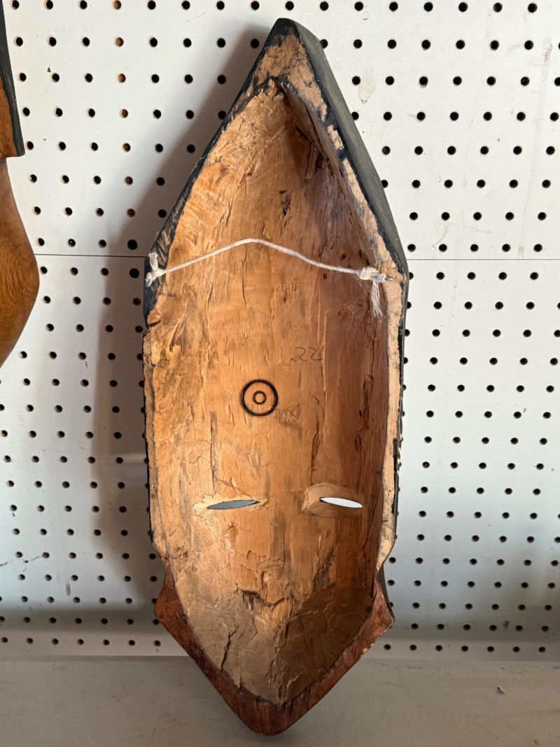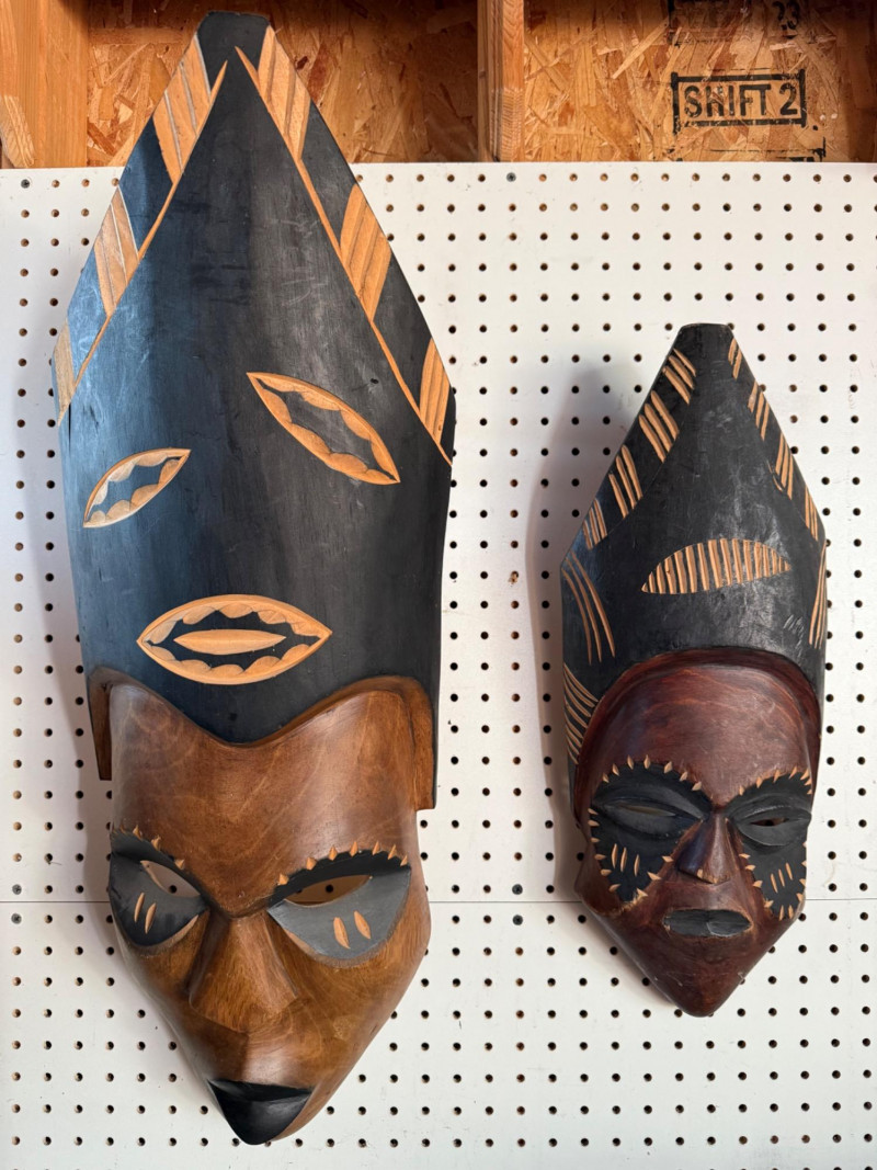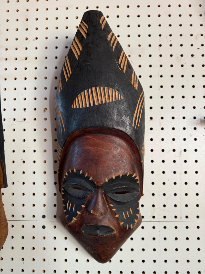 Striking pair of carved and painted African tribal masks, each featuring elongated facial forms and tall geometric headdresses. The larger mask showcases a black crown with orange patterning and three eye-like motifs, while the face is rendered in brown with exaggerated black and orange eyes and mouth. The smaller mask echoes the design with a similarly tall headdress and bold facial detailing. Both masks are adorned with traditional color palettes and symbolic shapes, reflecting ceremonial or ritual use. Mounted for display, these masks offer powerful presence and cultural storytelling. Important Details: Material: Carved and painted wood Large African Carved Masks carved from lightweight wood.