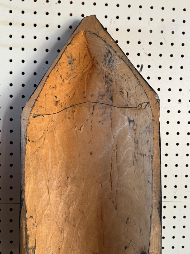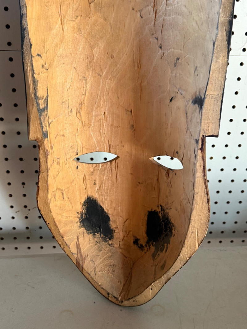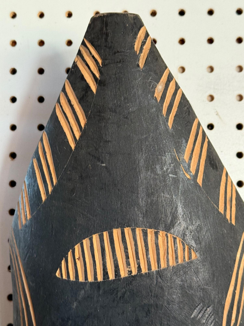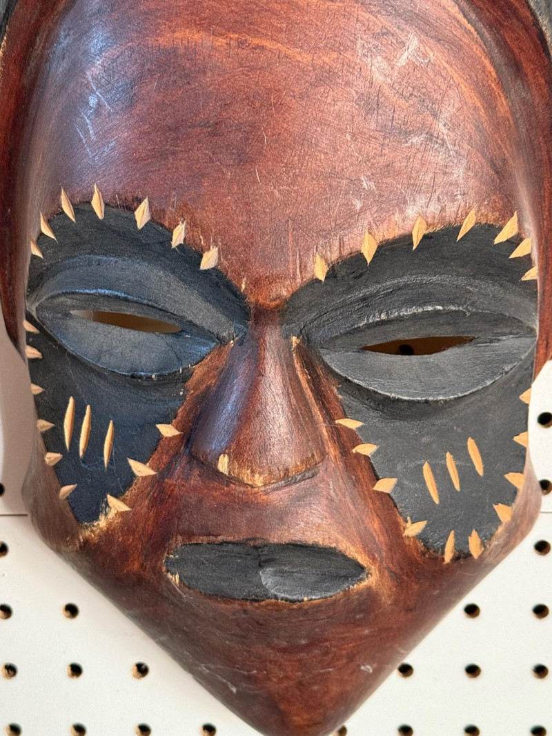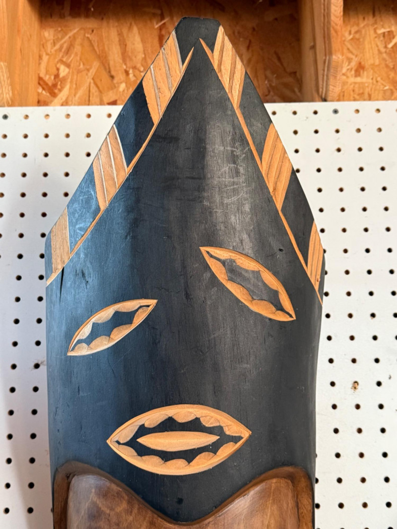 Striking pair of carved and painted African tribal masks, each featuring elongated facial forms and tall geometric headdresses. The larger mask showcases a black crown with orange patterning and three eye-like motifs, while the face is rendered in brown with exaggerated black and orange eyes and mouth. The smaller mask echoes the design with a similarly tall headdress and bold facial detailing. Both masks are adorned with traditional color palettes and symbolic shapes, reflecting ceremonial or ritual use. Mounted for display, these masks offer powerful presence and cultural storytelling. Important Details: Material: Carved and painted wood Large African Carved Masks carved from lightweight wood.