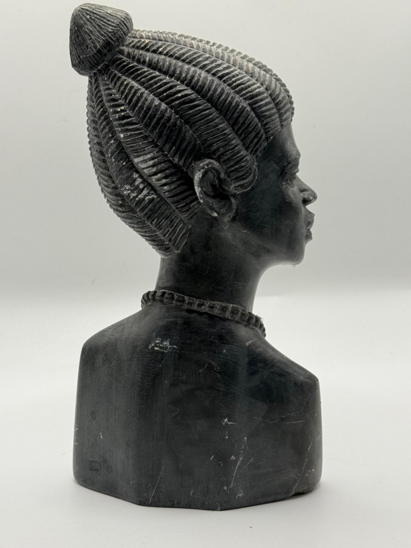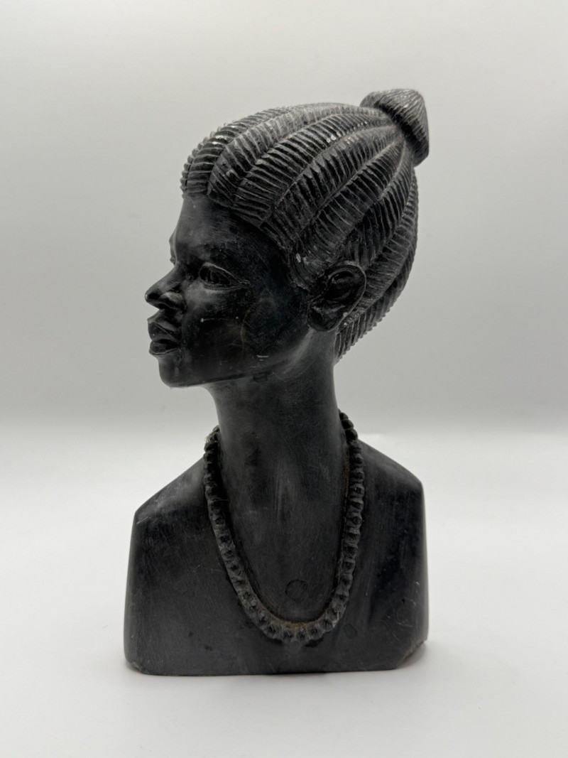Elegant carved bust of an African woman, rendered in dark stone with finely detailed features and traditional adornment. Her hair is styled in textured rows pulled into a bun, and she wears a beaded necklace across the collar. The sculpture captures grace and strength through its stylized facial contours and smooth finish. A timeless piece of cultural artistry, ideal for display in ethnographic or fine art collections. Important Details: Material: Carved dark stone (possibly serpentine or ebony stone)