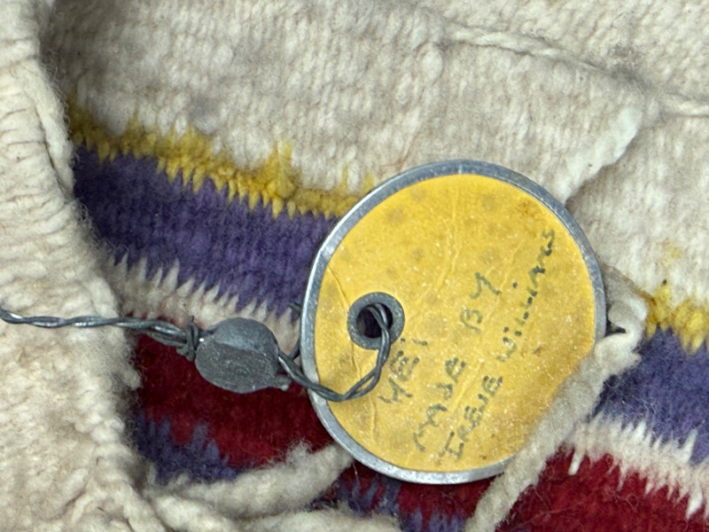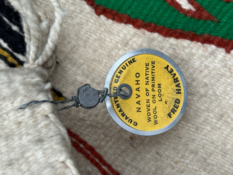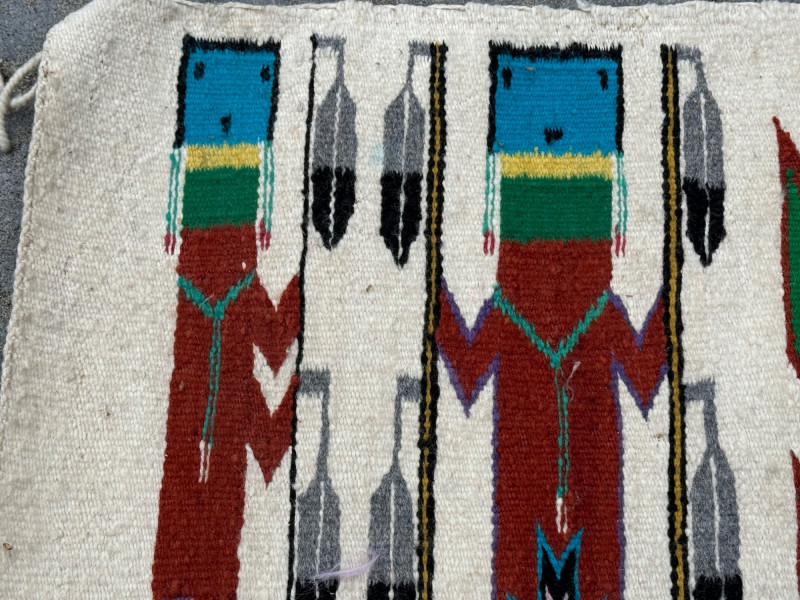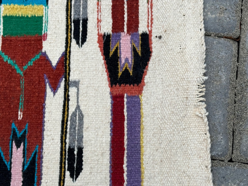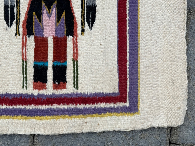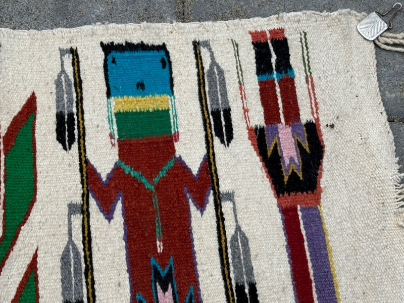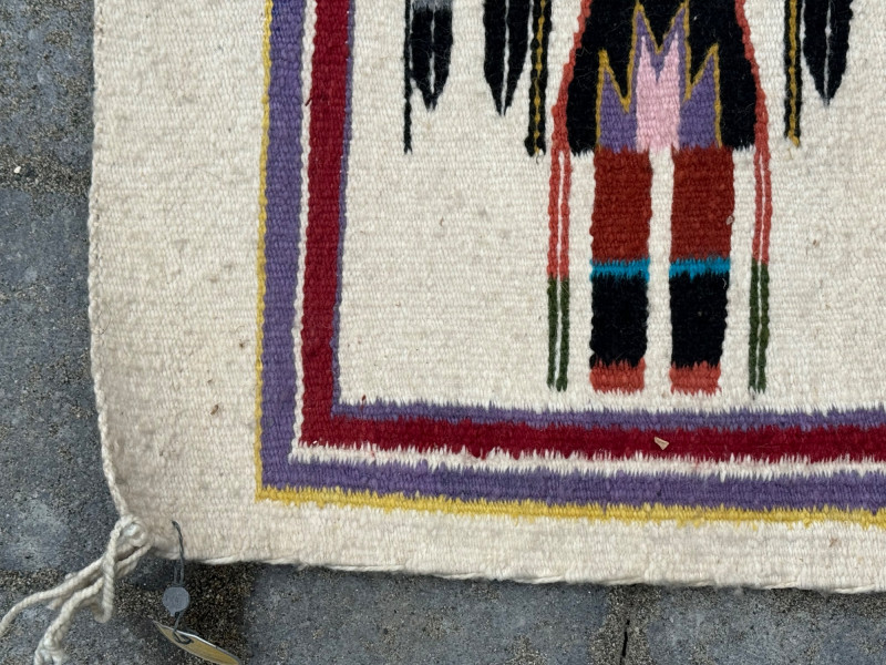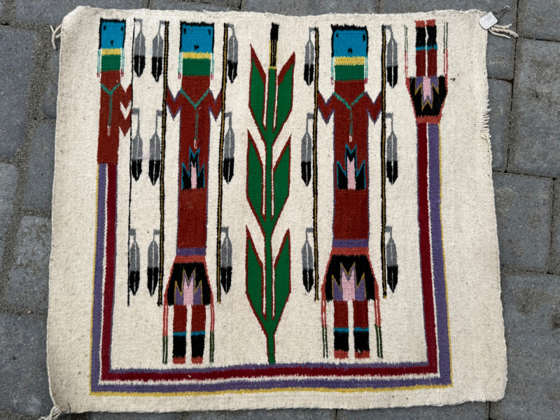 Irene Williams Navajo Yei Weaving: A Sacred Tapestry of Tradition This Irene Williams Navajo weaving is a Yei pictorial textile, showcasing sacred figures and symbolic motifs central to Navajo spirituality and tradition. Key Features of the WeavingArtist: Irene Williams, a Navajo weaver known for her detailed Yei designs. Design Style: Yei pictorial, which depicts supernatural beings from Navajo mythology. These figures are often associated with healing and ceremonial practices.Figures: The weaving features four stylized Yei figures, symmetrically arranged and holding feathered staffs. Their geometric adornments reflect traditional Navajo aesthetics. Central Motif: A green plant with red accents, likely representing corn—a sacred symbol of life and sustenance in Navajo culture. Color Palette: Cream background with a multicolored border in purple, red, and yellow, enhancing the visual rhythm and framing the spiritual narrative. Material: Typically woven from hand-dyed wool, using traditional upright looms passed down through generations.