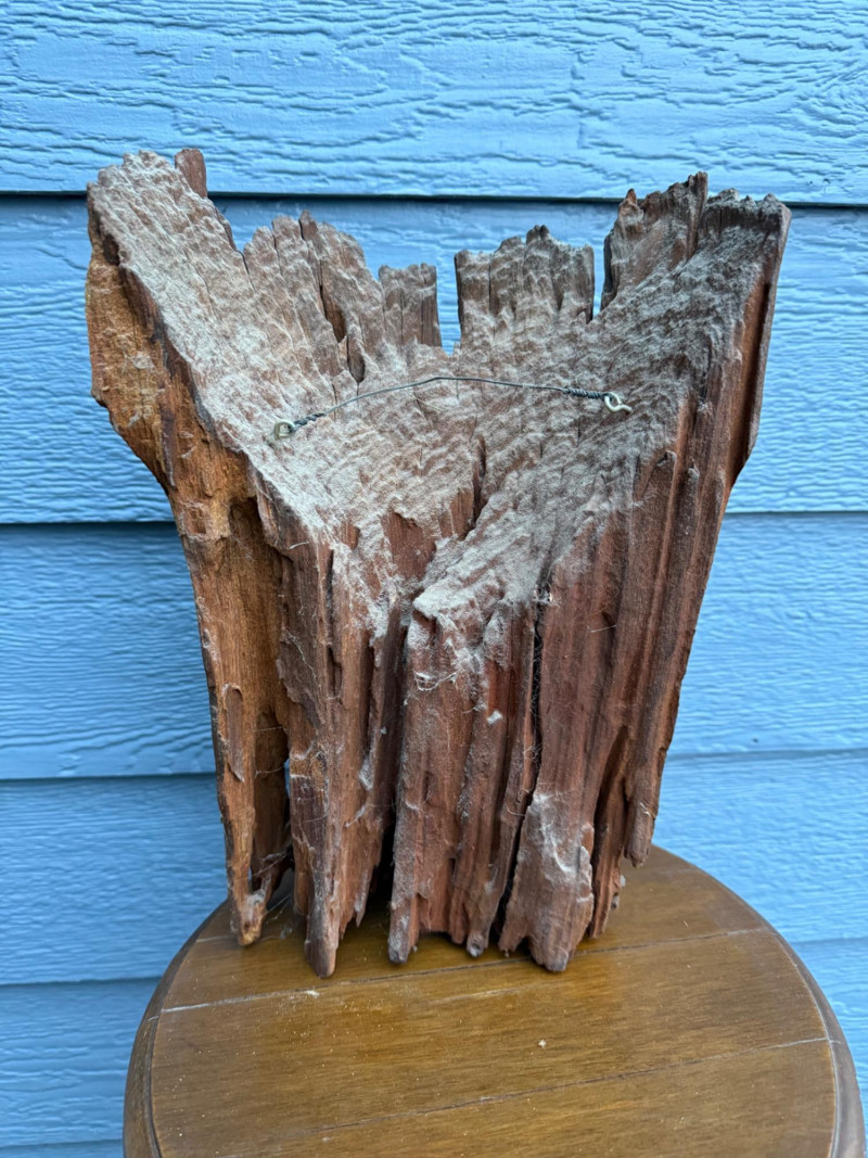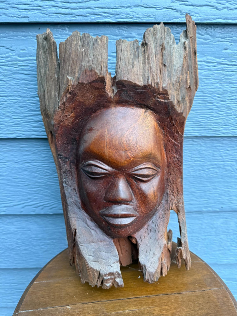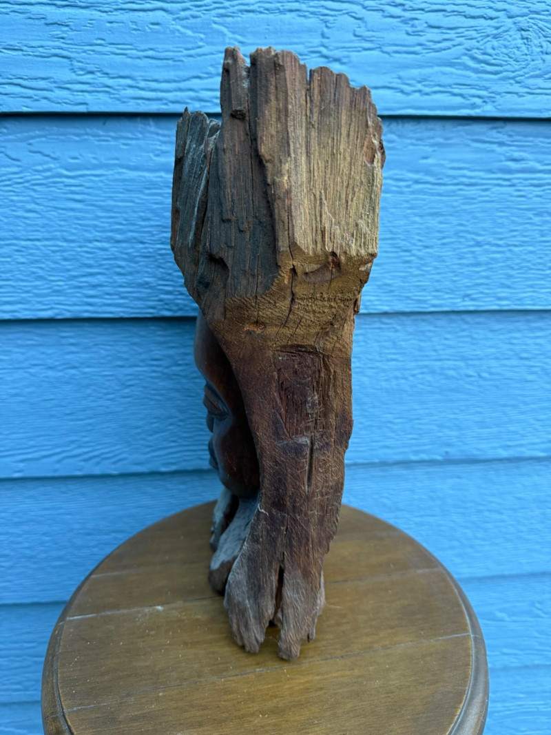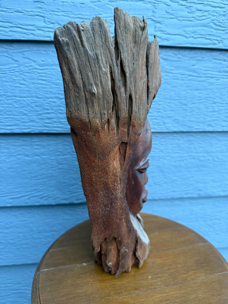 Evocative carved bust of a stylized human face emerging from a rugged piece of driftwood or bark. The sculpture features closed eyes, a prominent nose, and full lips, seamlessly integrated into the natural contours of the wood. The top and bottom edges retain their jagged, organic texture, enhancing the rustic and elemental feel of the piece. This fusion of craftsmanship and raw material evokes themes of ancestral presence, nature, and spiritual reflection. Important Details: Material: Carved hardwood (driftwood or bark)