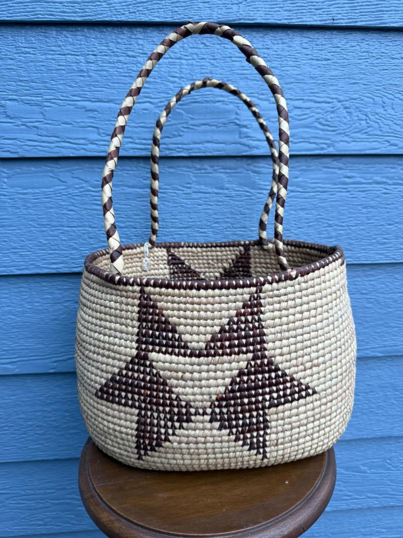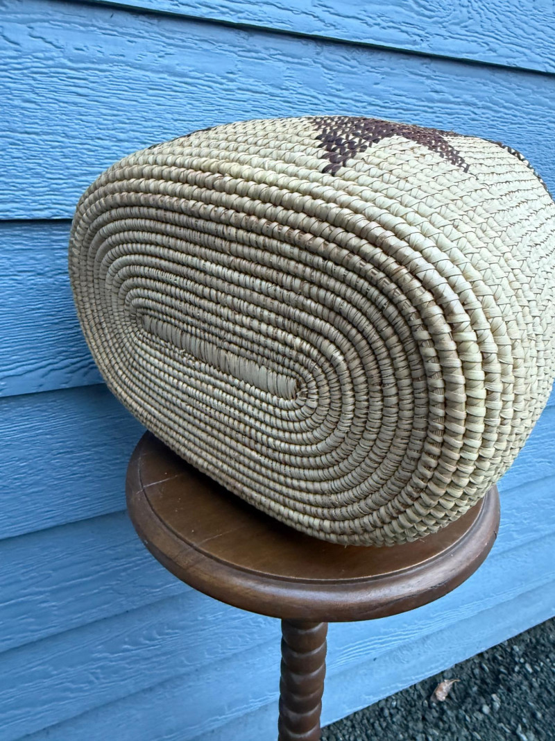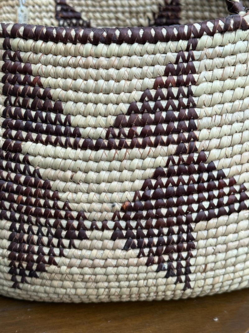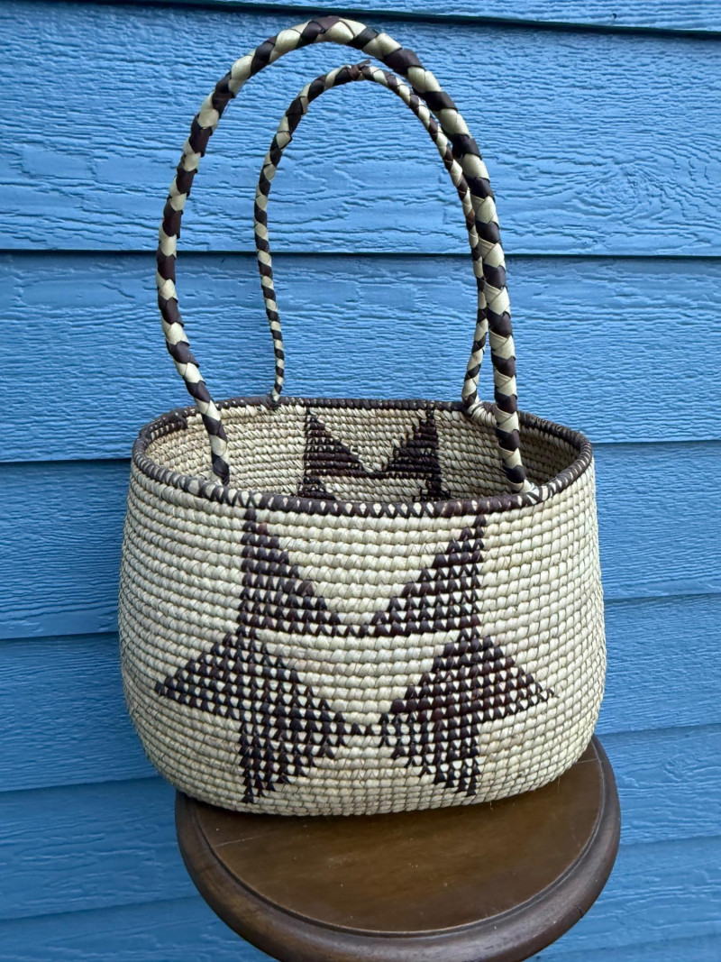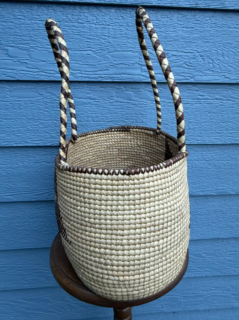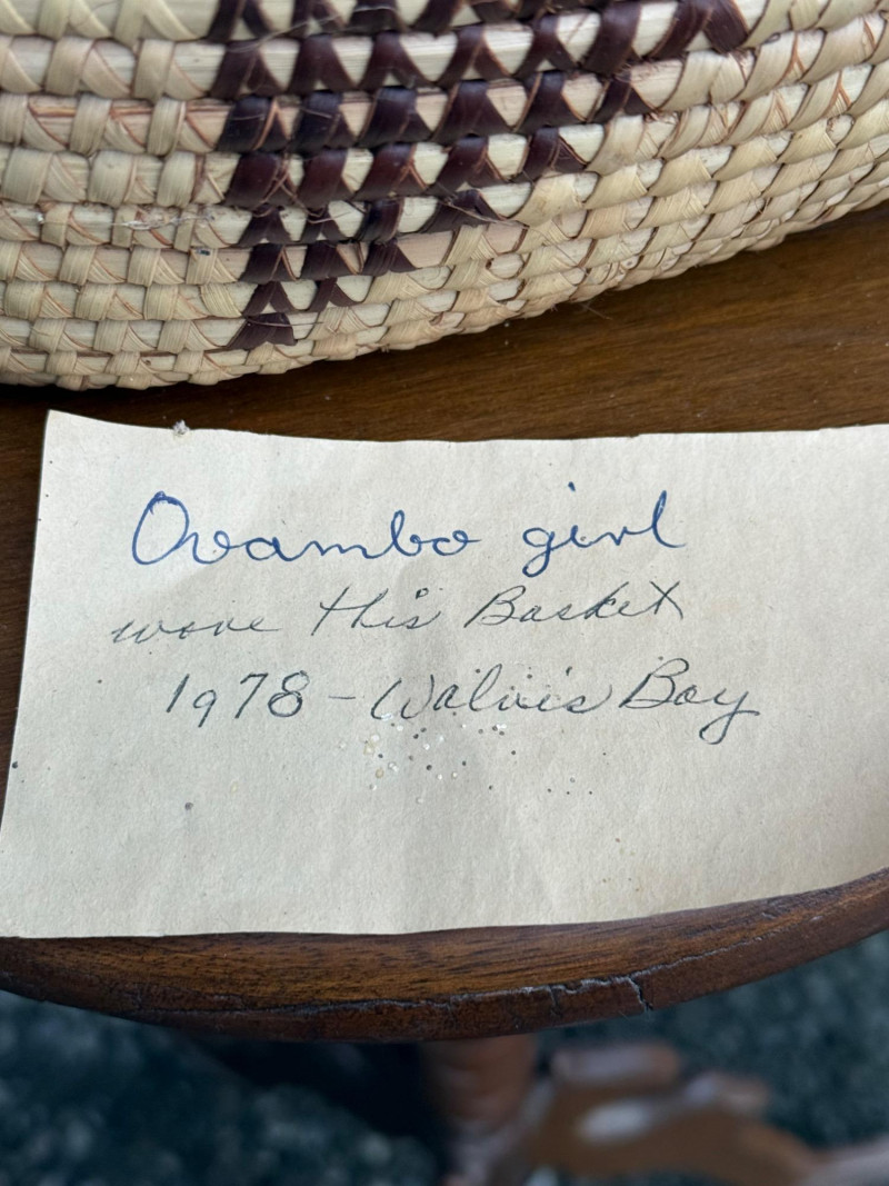 Ovambo Basket: A Handwoven Expression of Namibian Tradition This Ovambo basket is a finely crafted storage vessel made by the Ovambo people of northern Namibia. It reflects a deep heritage of weaving techniques and symbolic design rooted in daily life and cultural identity. Ethnic Group: The Ovambo are Namibia’s largest ethnic group, known for their skilled craftsmanship and use of natural materials. Geographic Context: These baskets are traditionally made in the northern regions of Namibia, where palm leaves and grasses are harvested and prepared for weaving. Traditional Use: Ovambo baskets serve both practical and ceremonial purposes, used for storing grains, serving food, and presenting offerings during rituals.Cultural and Regional Origins