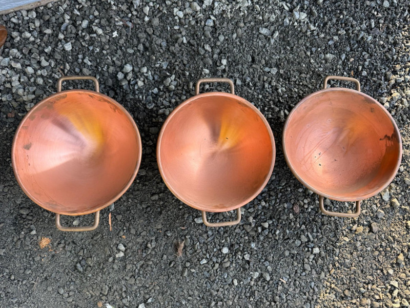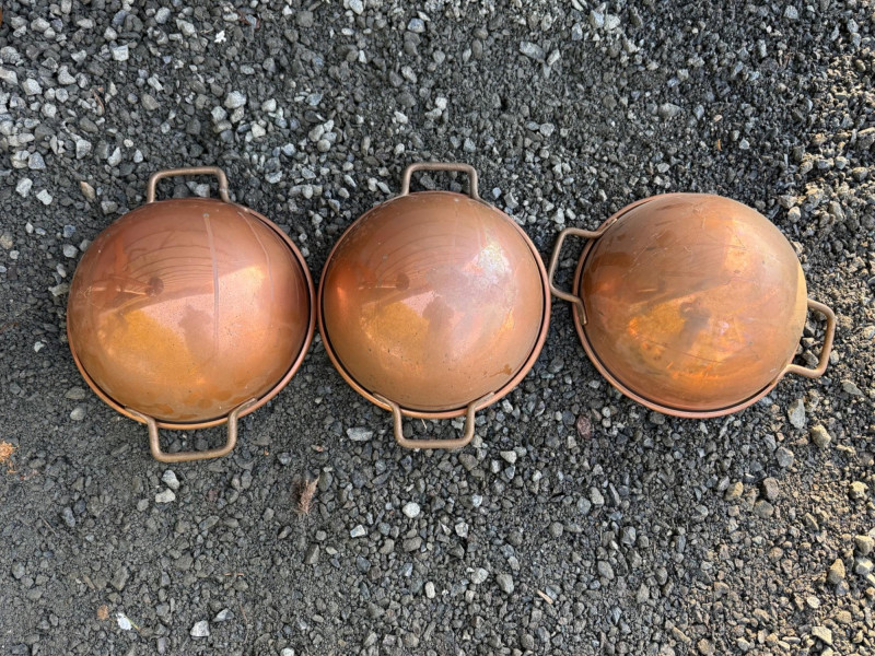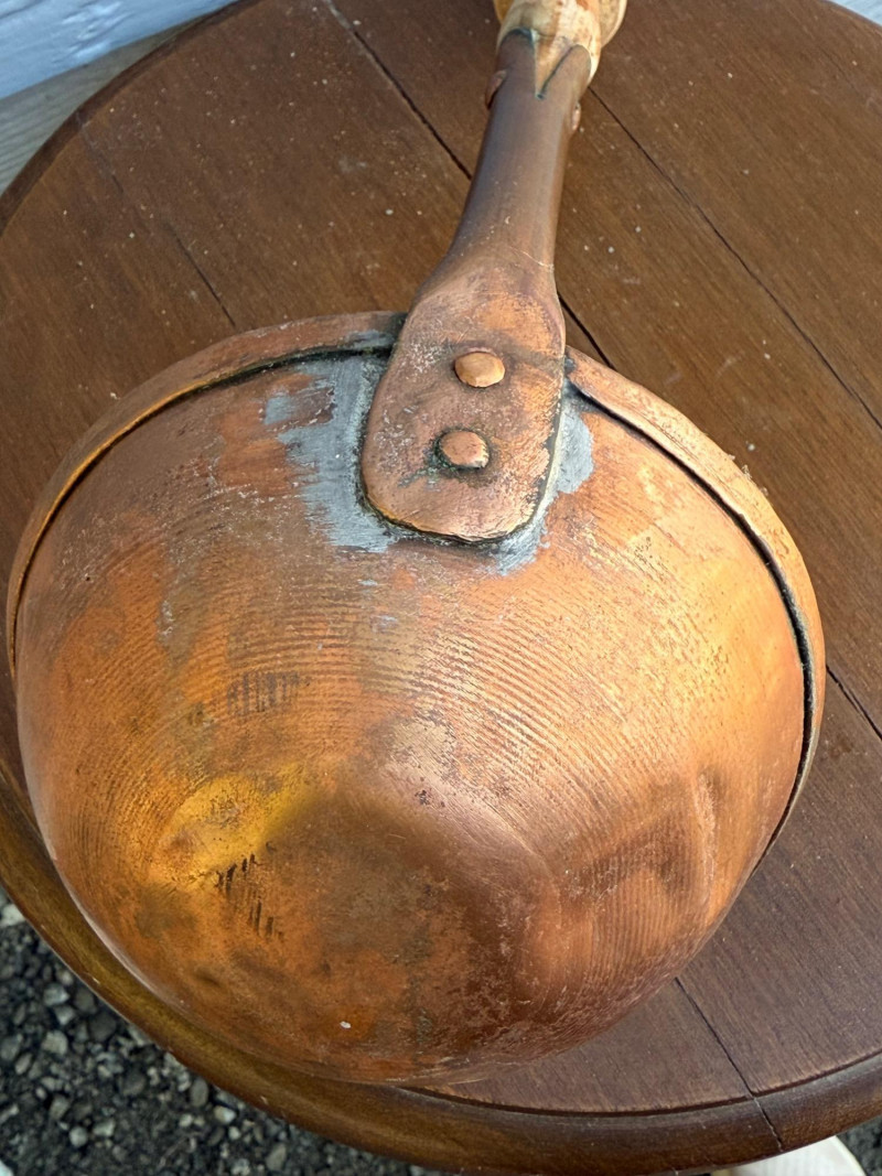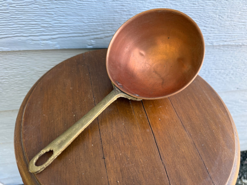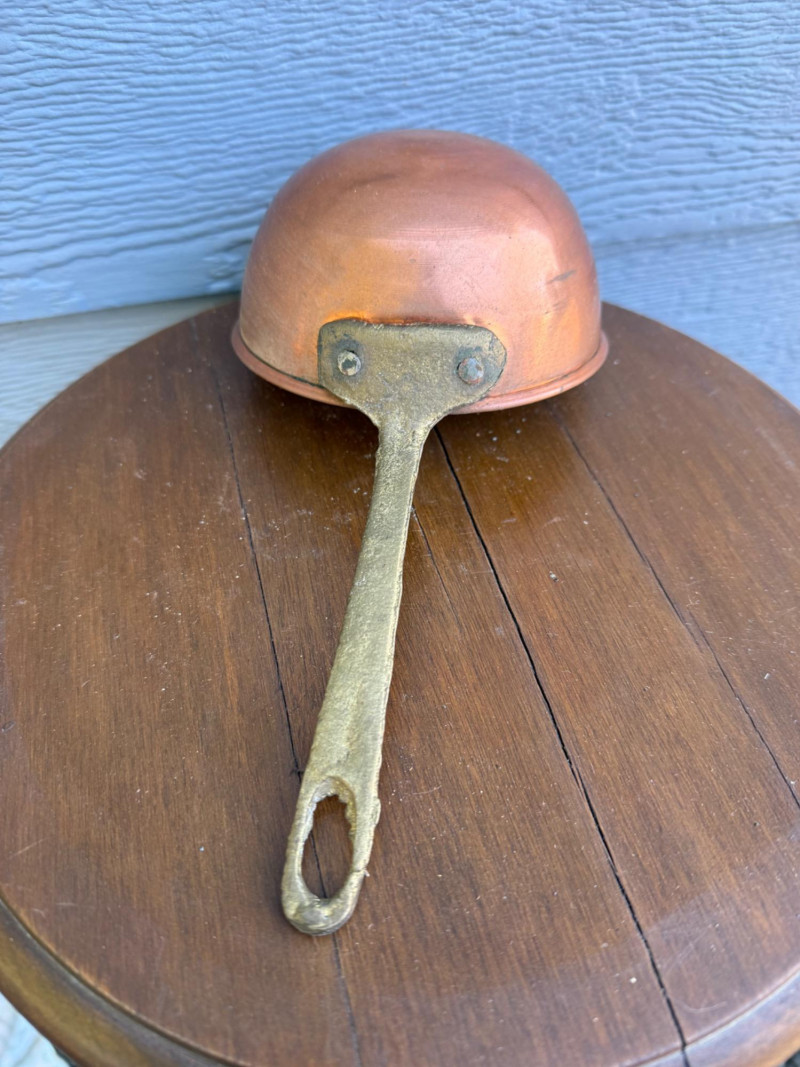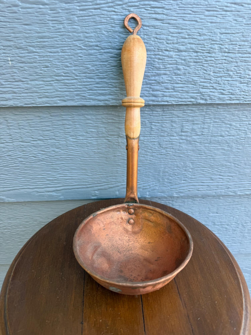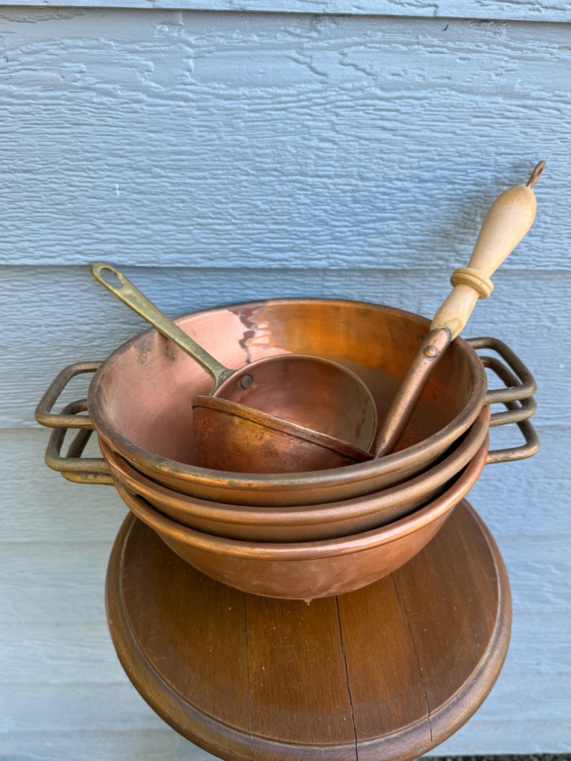 Charming set of three vintage copper bowls with looped side handles, stacked and paired with two ladles—one all-copper and one with a brass scoop and wooden handle. The bowls feature a warm patina and classic utilitarian form, ideal for rustic kitchen styling, display, or repurposing. A nostalgic nod to traditional cooking tools with visual appeal and functional versatility.