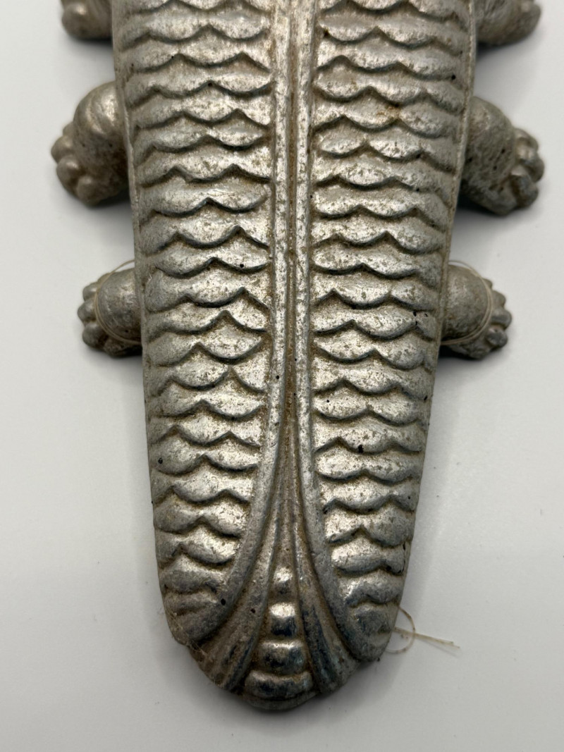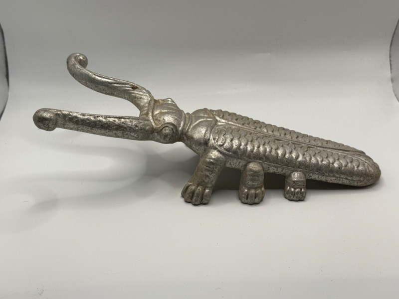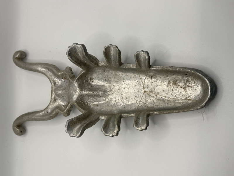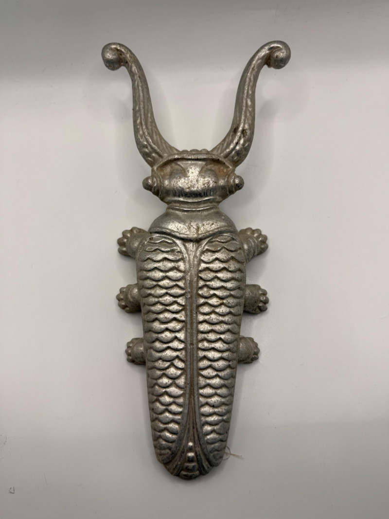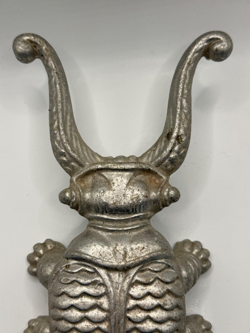Aluminum Boot Pull: A Sculptural Blend of Utility and Art This aluminum boot pull is a cast metal object designed to assist in removing boots, while also serving as a decorative piece. Its form resembles a stylized insect or beetle, merging function with artistic flair. Material: Made from cast aluminum or a silver-toned alloy, offering durability and resistance to rust. Form: The body is textured with a segmented or scaled pattern, evoking the exoskeleton of a beetle. Limbs and Antennae: Six protruding limbs and two large, curved antennae or horns give it a symmetrical, organic appearance. Functionality: The curved elements and sturdy limbs are likely intended to grip the heel of a boot, allowing the user to pull it off with ease—especially useful for tight-fitting or muddy footwear. Artistic Appeal: Its ornate and symmetrical design suggests it may also be used as a wall-mounted hook or decorative accent in rustic or vintage interiors.Design and Features