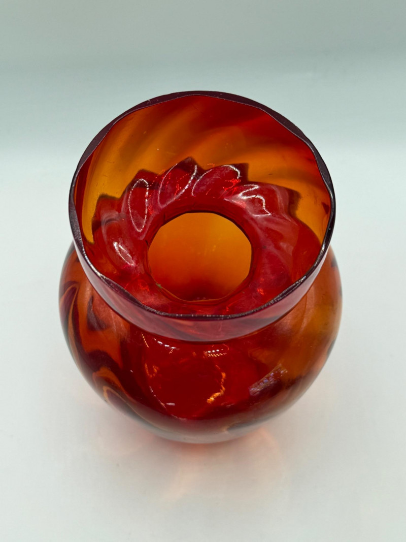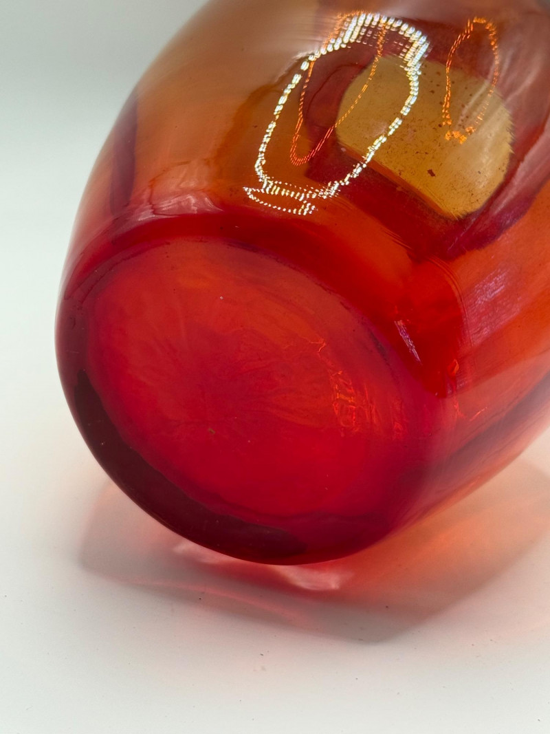 Striking vintage bulb-forcing vase in classic Amberina glass, featuring a rich gradient from deep red to golden amber. The flared rim and narrow neck are designed to cradle a bulb for rooting, while the rounded base provides water support and visual weight. This piece blends botanical utility with vibrant mid-century glass artistry—ideal for display, seasonal forcing, or as a standalone collectible. Important Details: Material: Hand-blown Amberina glass