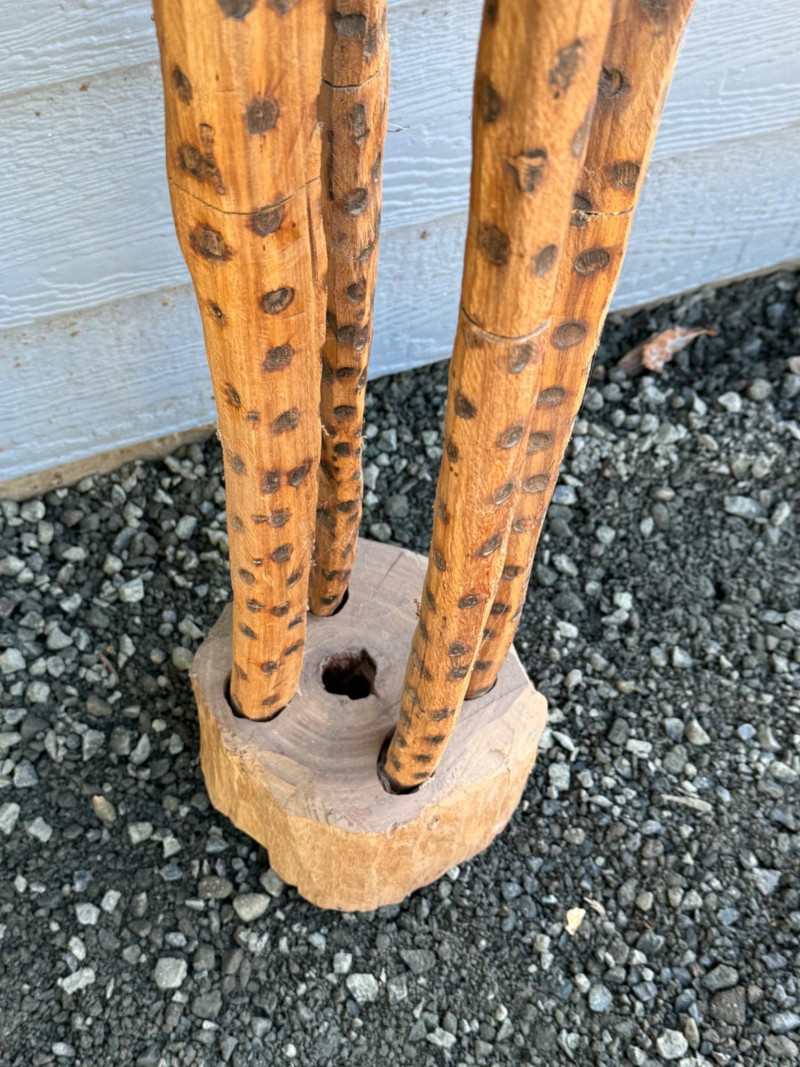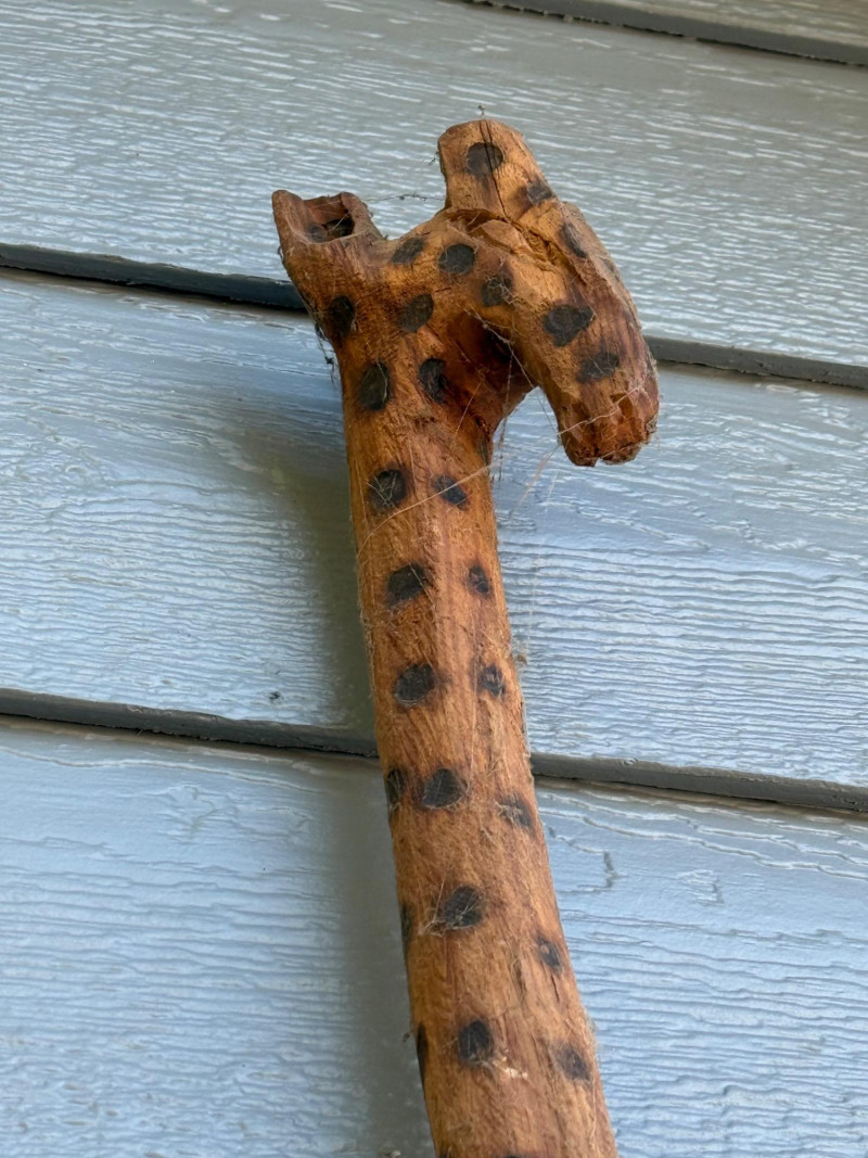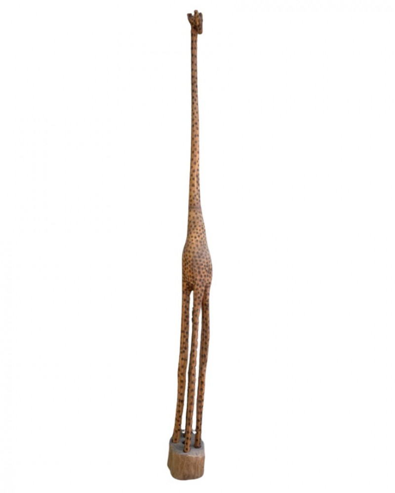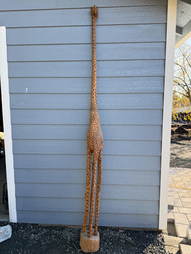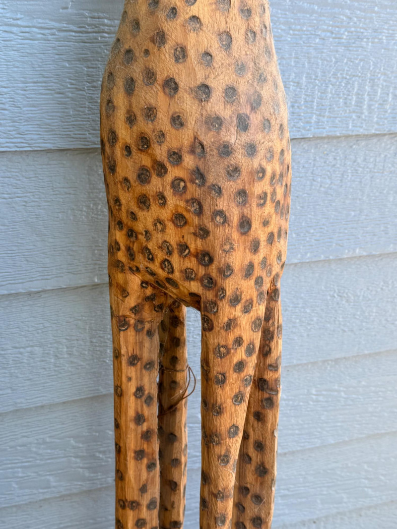 Striking hand-carved wooden giraffe sculpture standing an impressive 8 feet tall. This elongated figure features exaggerated proportions, with slender legs and neck, and is painted in a classic spotted coat pattern. The stylized form captures the elegance and whimsy of the giraffe, making it a bold statement piece for indoor or covered outdoor display. Ideal for safari-themed decor, gallery staging, or collectors of oversized folk art. Important Details: Material: Carved and painted wood