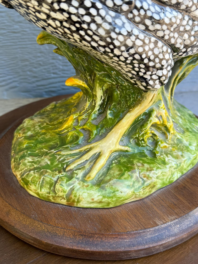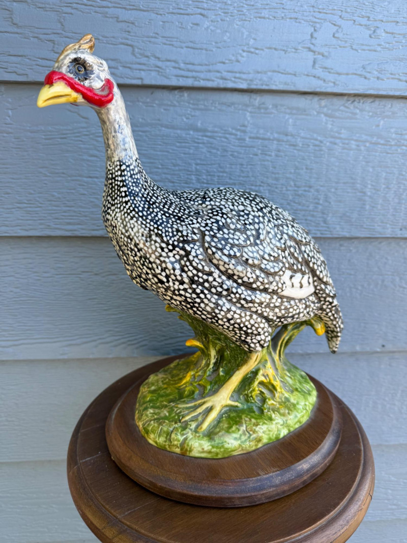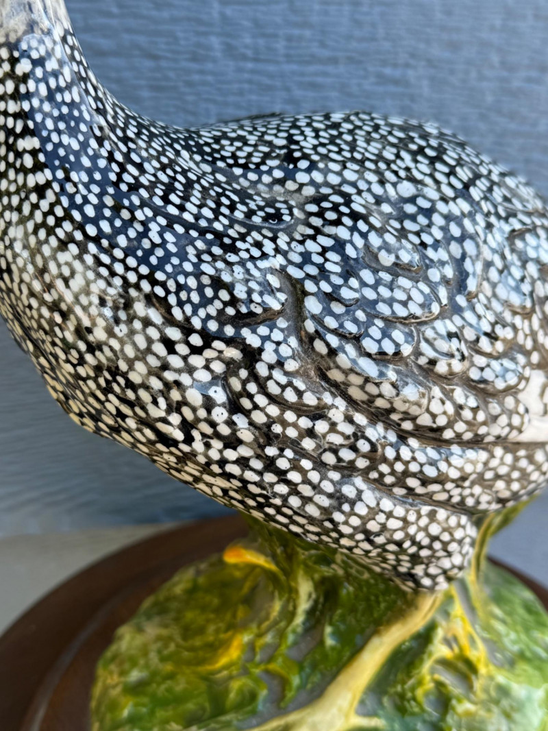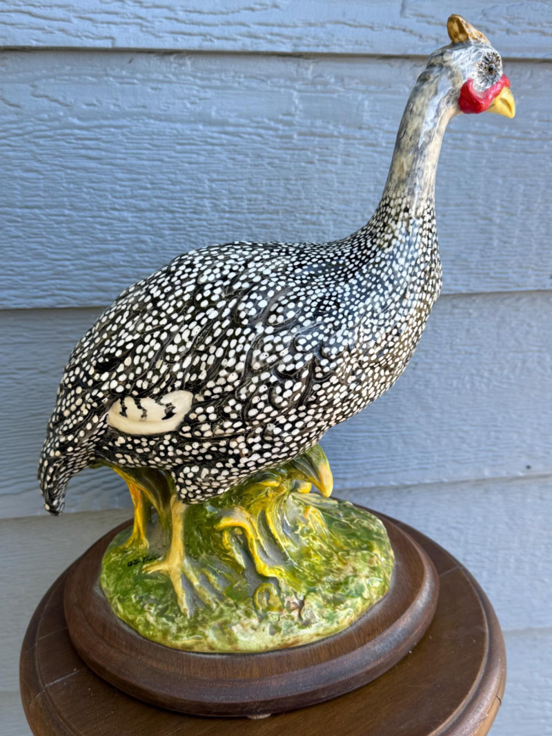 Realistically rendered ceramic guinea fowl figurine mounted on a round wooden base. The bird features speckled black and white plumage, a yellow beak, and red wattles, with finely detailed feather texture and expressive posture. The base is sculpted and painted to resemble grassy terrain, adding depth and naturalism. Signed by the artist, this piece blends folk charm with decorative sophistication—ideal for collectors of wildlife ceramics or country-themed decor. Important Details: Material: Glazed ceramic with painted wood base Dimensions: Approx. 8.5" H × 7" W Design Features: Speckled plumage with detailed featherwork Painted facial features: yellow beak, red wattles Sculpted grassy terrain base Artist-signed