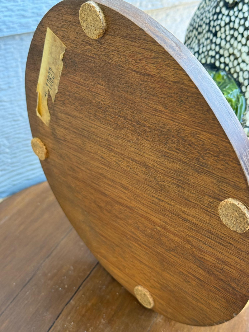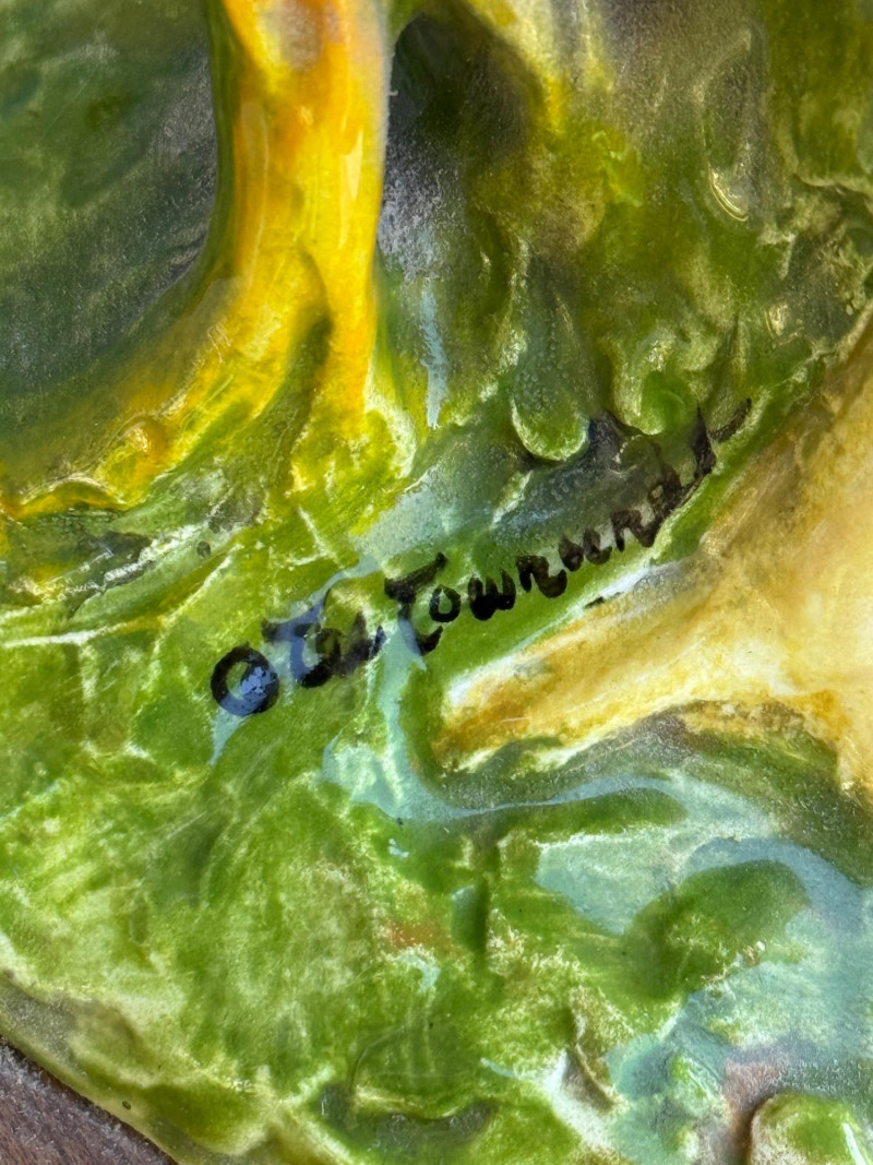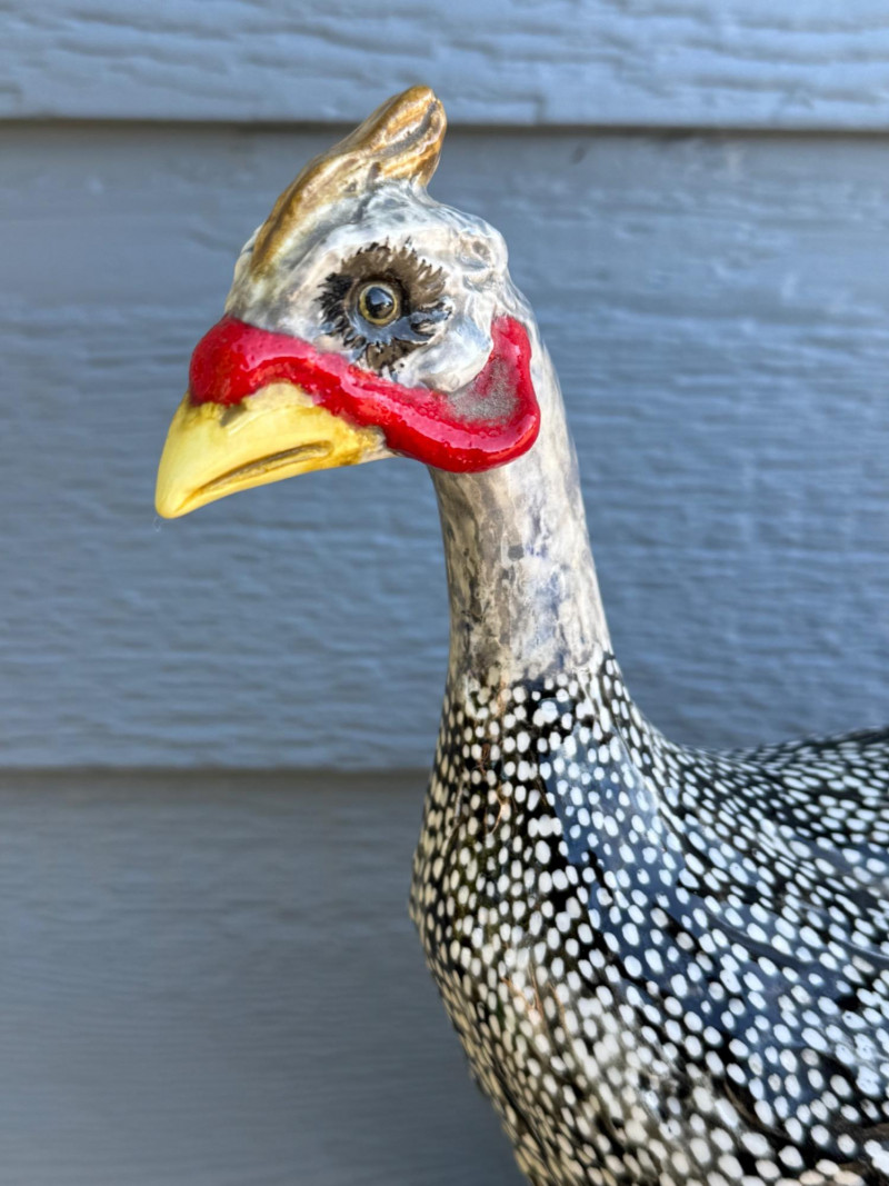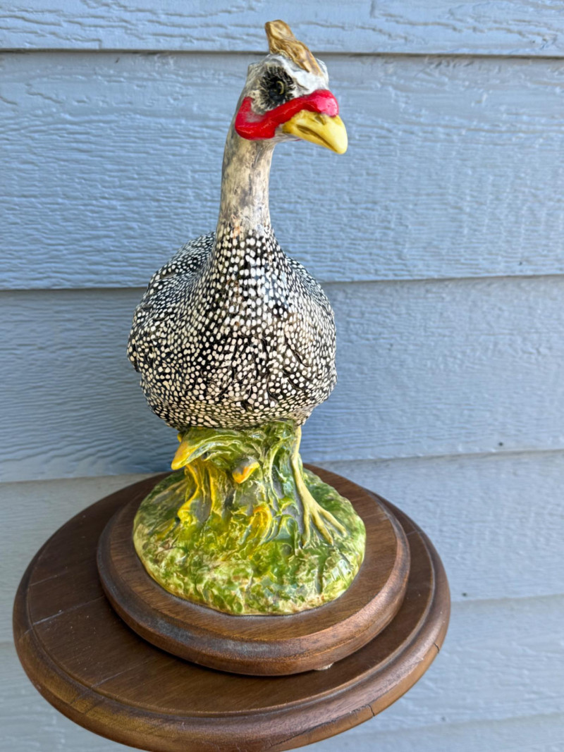 Realistically rendered ceramic guinea fowl figurine mounted on a round wooden base. The bird features speckled black and white plumage, a yellow beak, and red wattles, with finely detailed feather texture and expressive posture. The base is sculpted and painted to resemble grassy terrain, adding depth and naturalism. Signed by the artist, this piece blends folk charm with decorative sophistication—ideal for collectors of wildlife ceramics or country-themed decor. Important Details: Material: Glazed ceramic with painted wood base Dimensions: Approx. 8.5" H × 7" W Design Features: Speckled plumage with detailed featherwork Painted facial features: yellow beak, red wattles Sculpted grassy terrain base Artist-signed