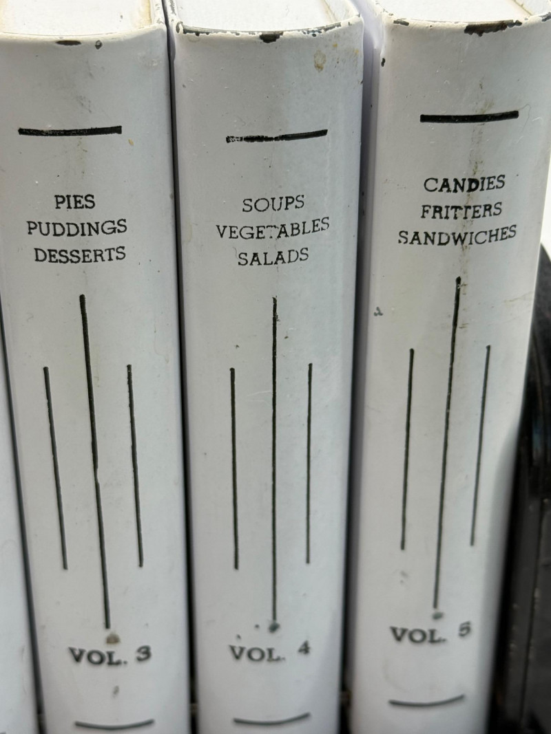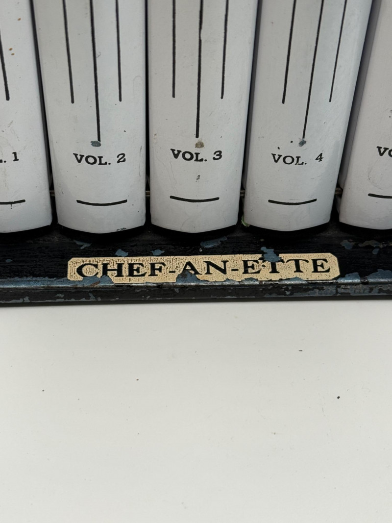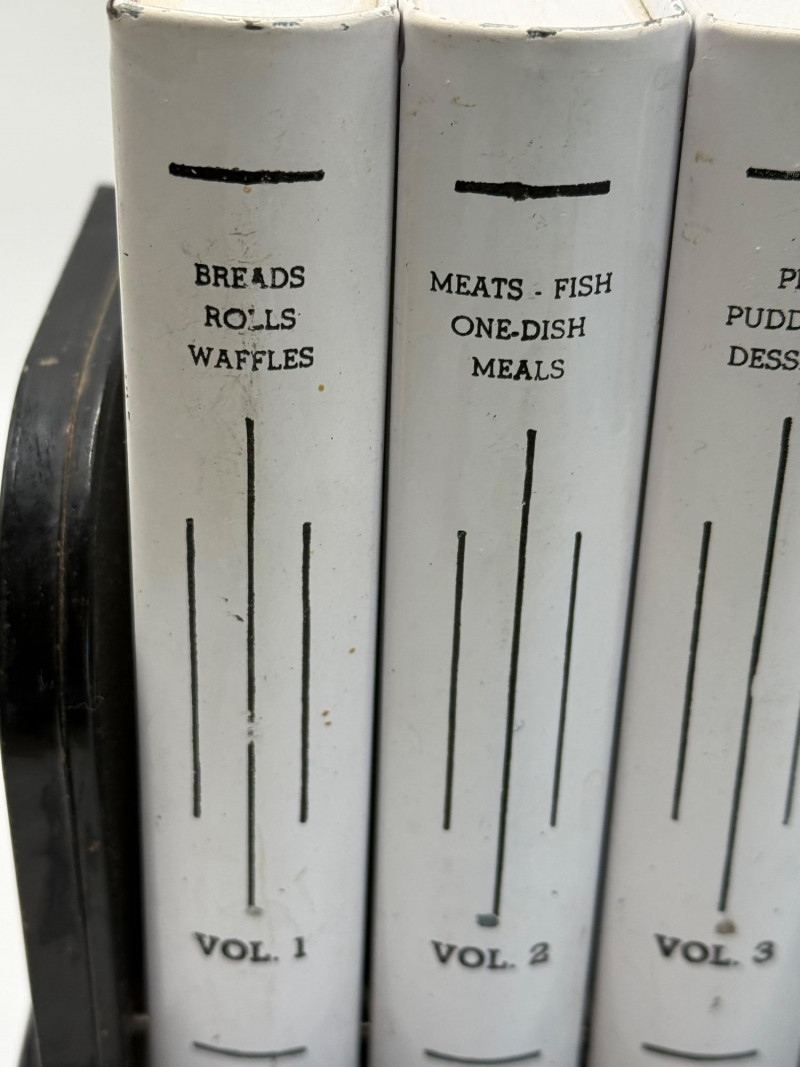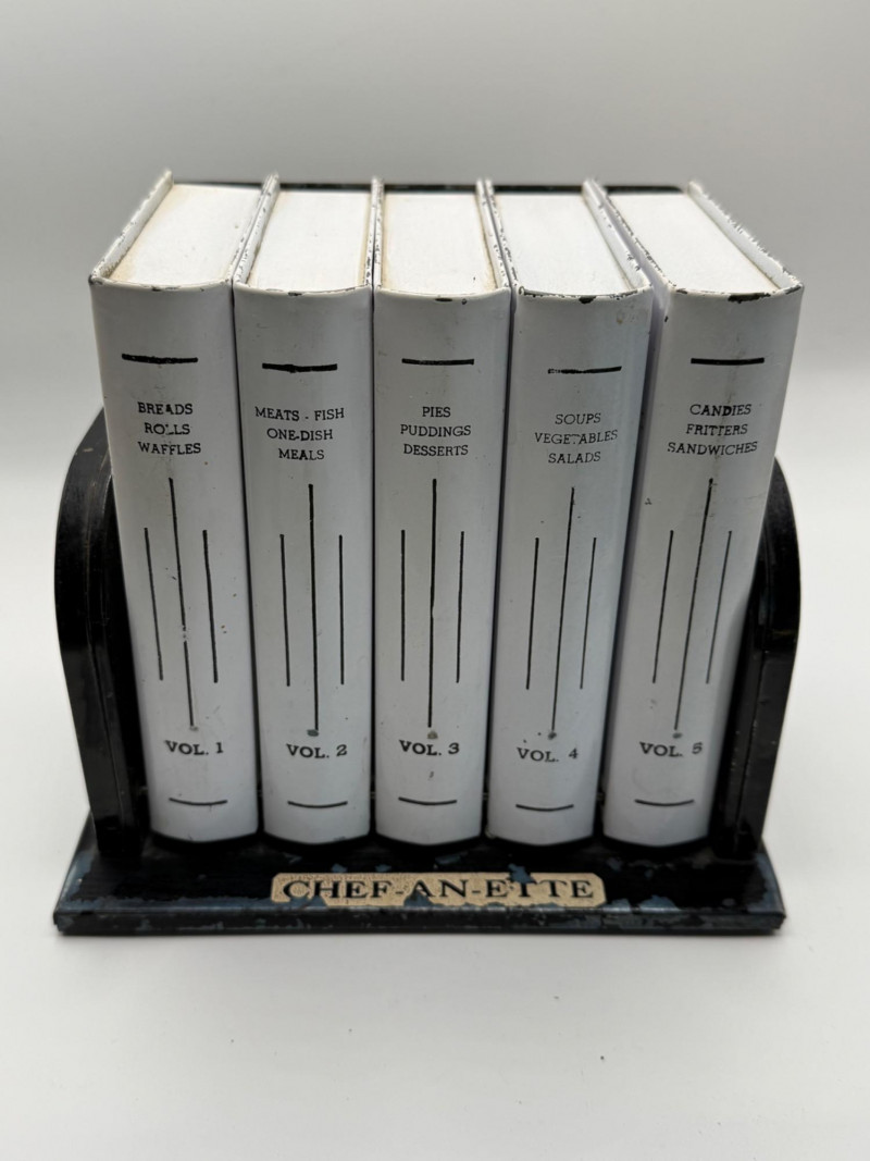 Complete set of five vintage Chef-An-Ette recipe booklets housed in their original black plastic stand. Each volume is labeled with its category and includes mid-century recipes ranging from breads and meats to candies and desserts. The white booklets feature bold black lettering and are organized by volume number, making this a charming and functional kitchen collectible. A nostalgic nod to 1950s–60s home cooking, perfect for display or use.