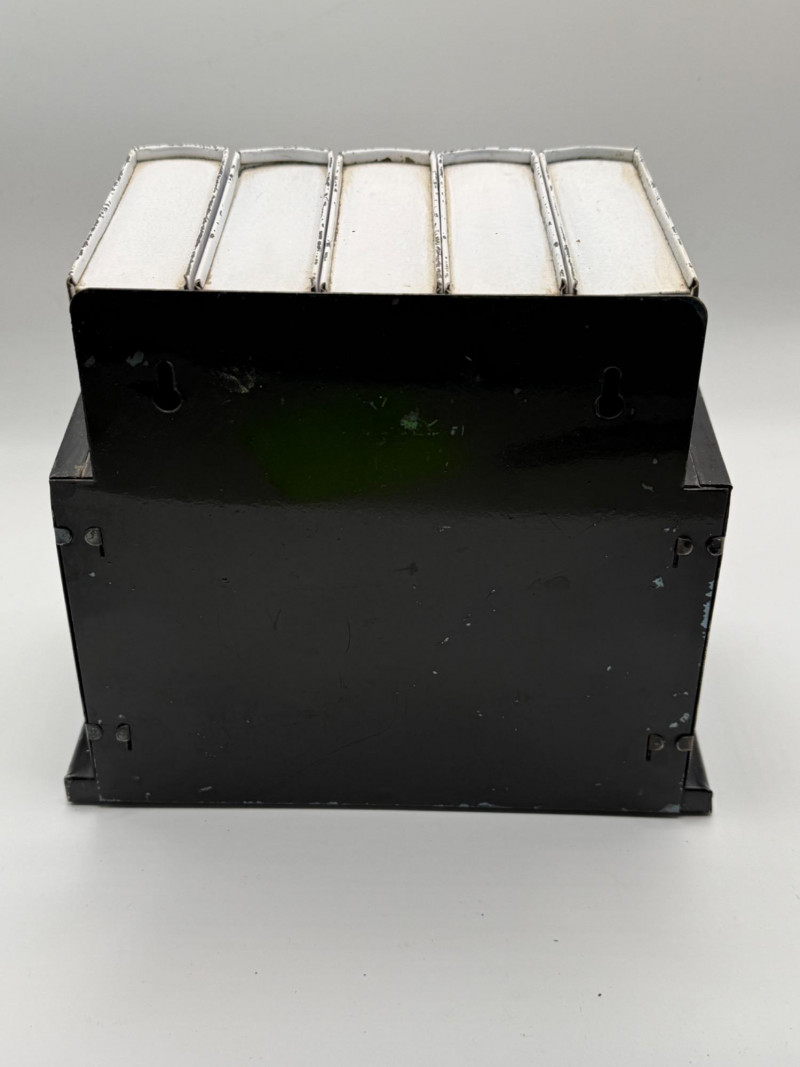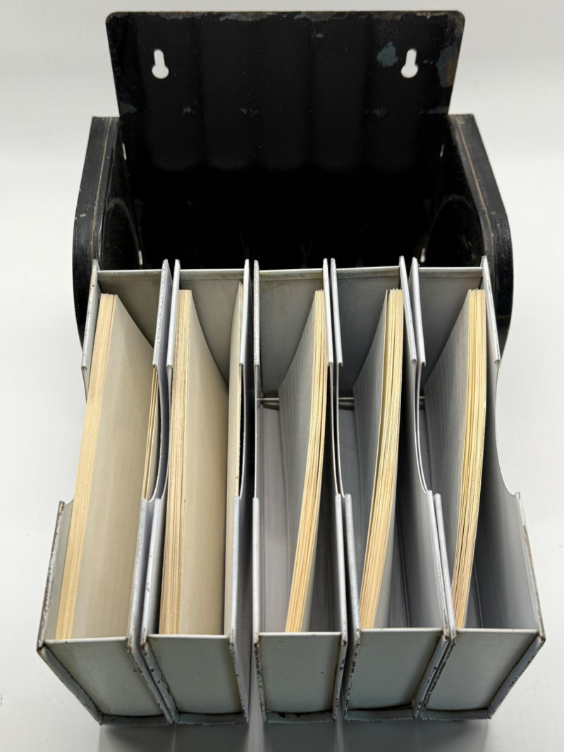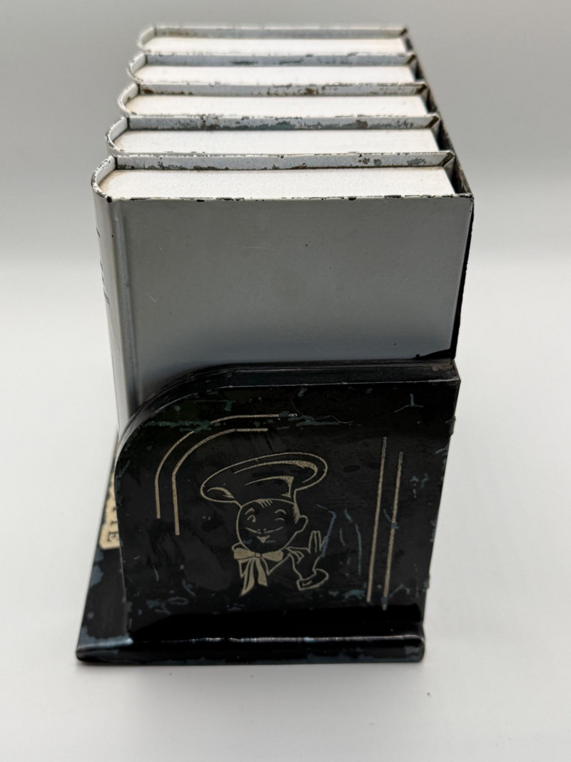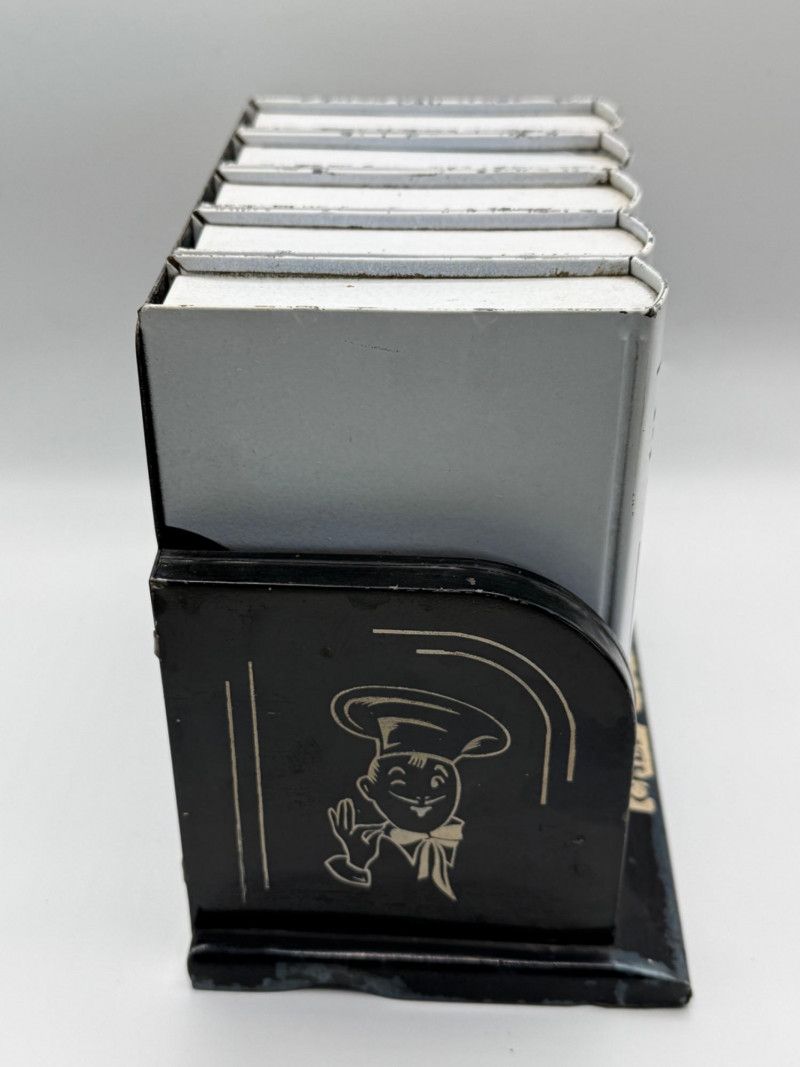 Complete set of five vintage Chef-An-Ette recipe booklets housed in their original black plastic stand. Each volume is labeled with its category and includes mid-century recipes ranging from breads and meats to candies and desserts. The white booklets feature bold black lettering and are organized by volume number, making this a charming and functional kitchen collectible. A nostalgic nod to 1950s–60s home cooking, perfect for display or use.