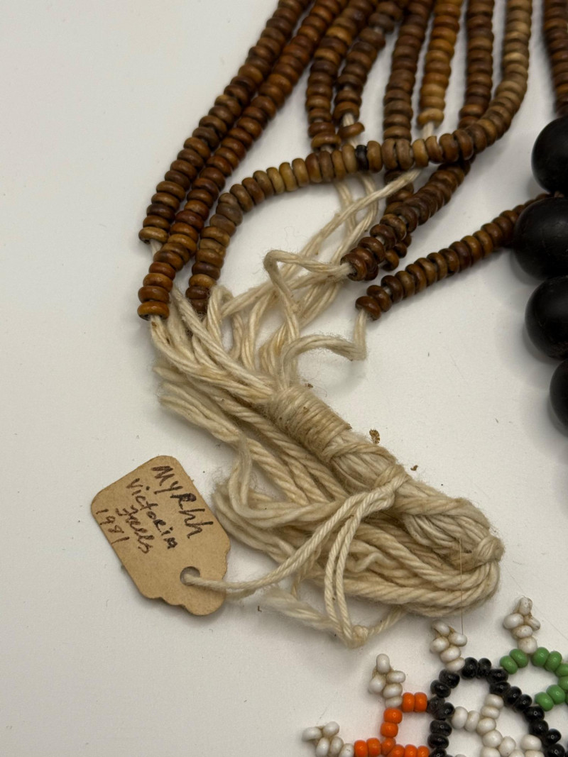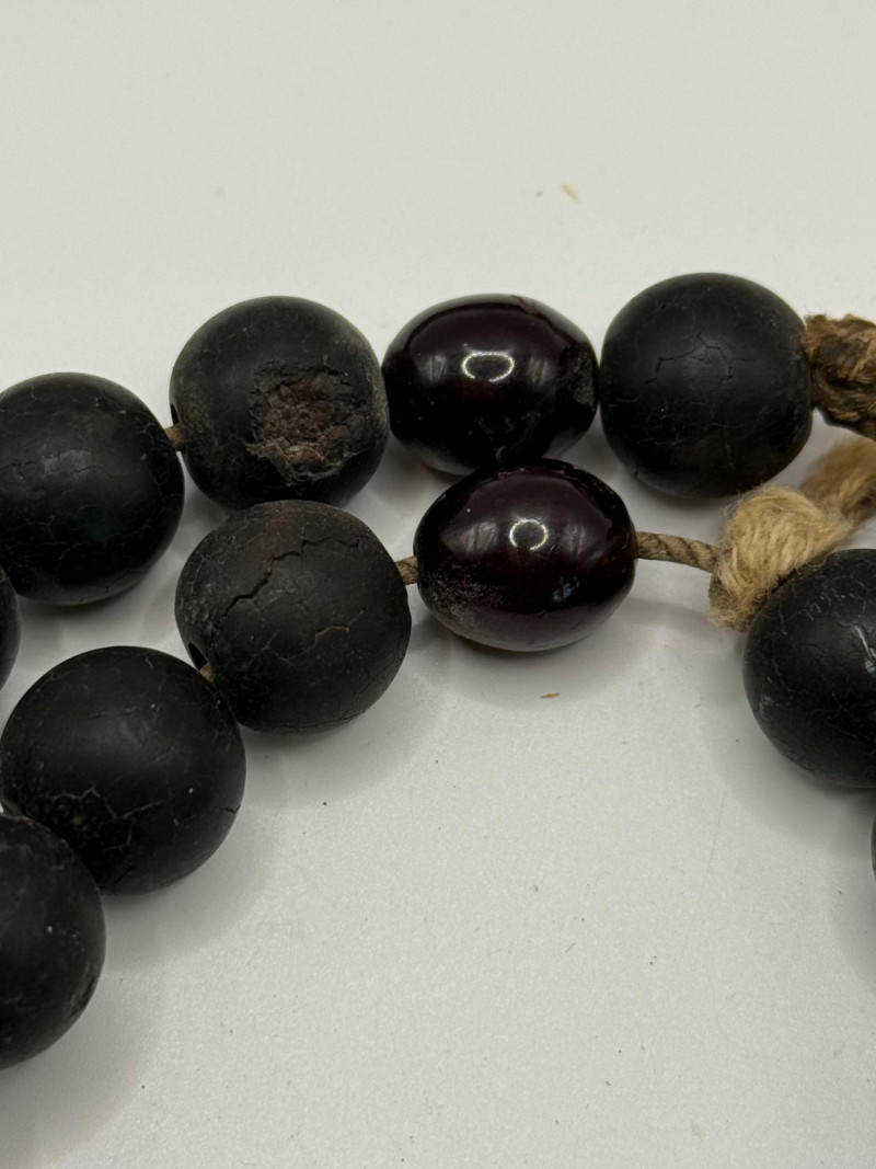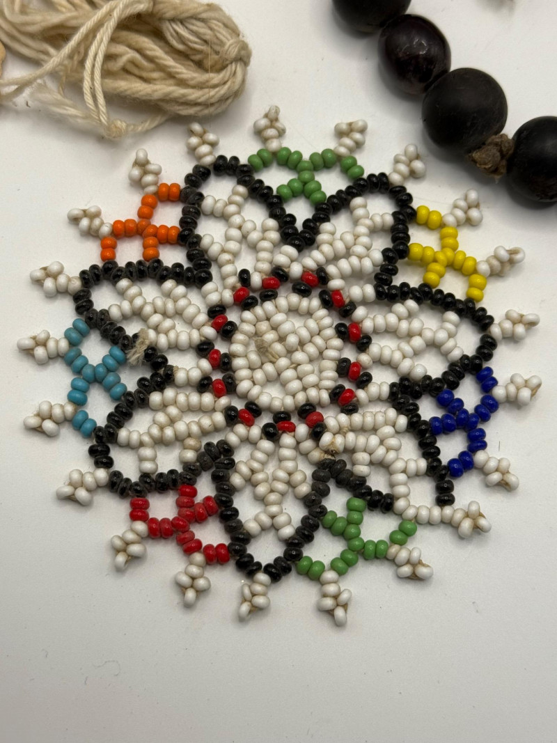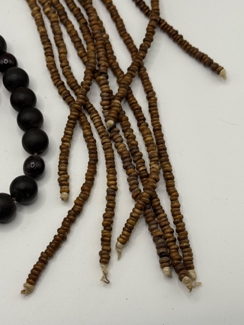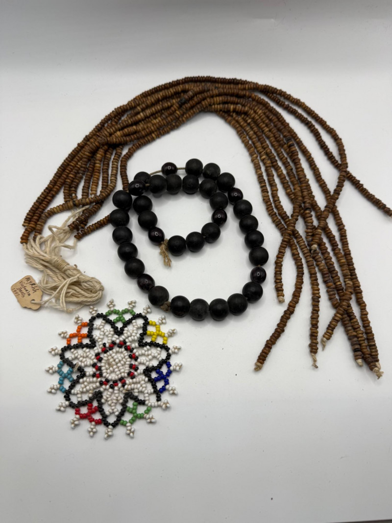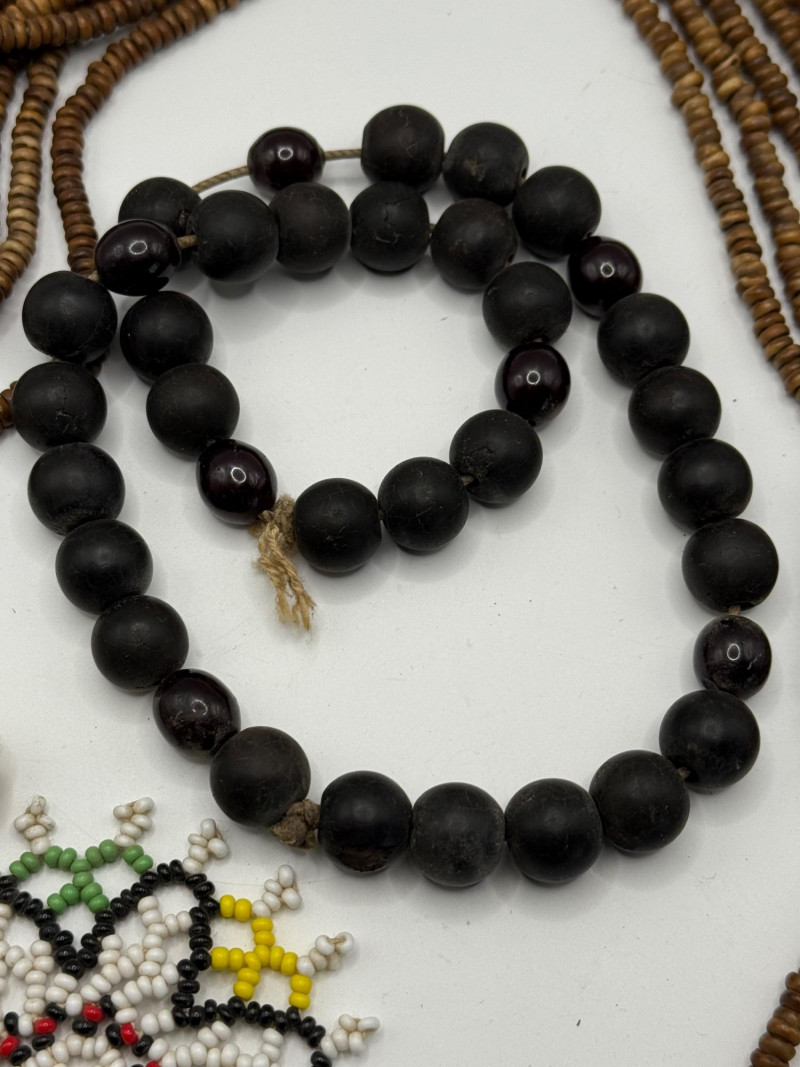Myrrh bead strands are 17” long. The dark bead strand is 18 inches long and looks like clay and dark red glass. Small colorful beaded trivet is 3 1/4 inches wide.