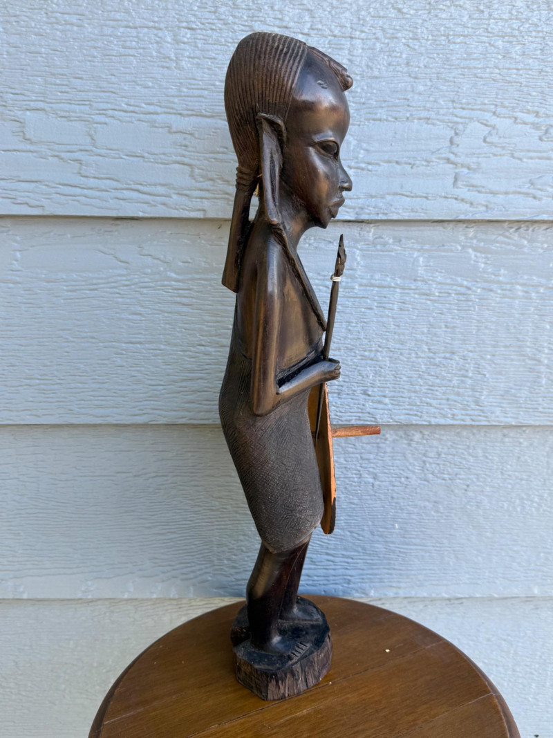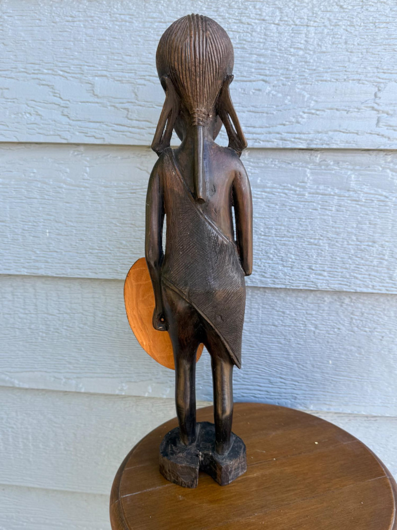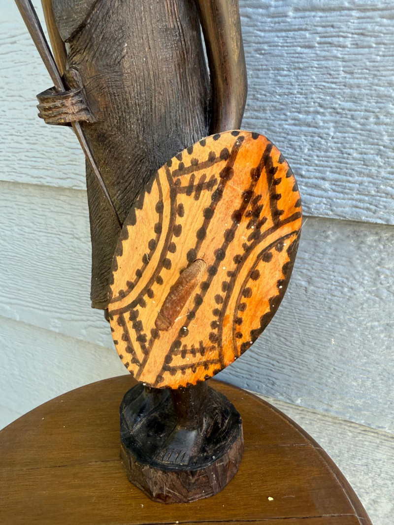 Tall carved wooden figure depicting a traditional African warrior, standing upright with a spear in one hand and an oval shield in the other. The shield features a painted tribal motif in black dots and lines on a light brown ground. The figure is rendered with elongated facial features, stylized hair, and a garment carved in flowing detail. Mounted on a circular base with additional carved accents, this piece embodies ceremonial strength and artistic craftsmanship. Important Details: Material: Carved and painted wood Dimensions: Approx. 18" H × 6" W Design Features: Warrior stance with spear and shield Painted tribal pattern on shield Elongated facial features and stylized hair
