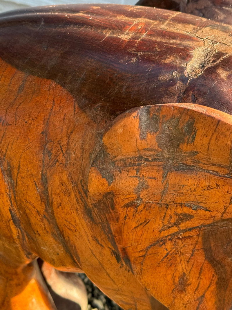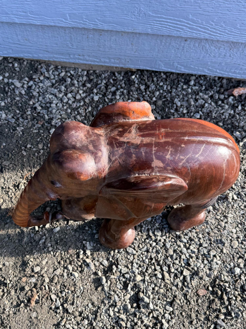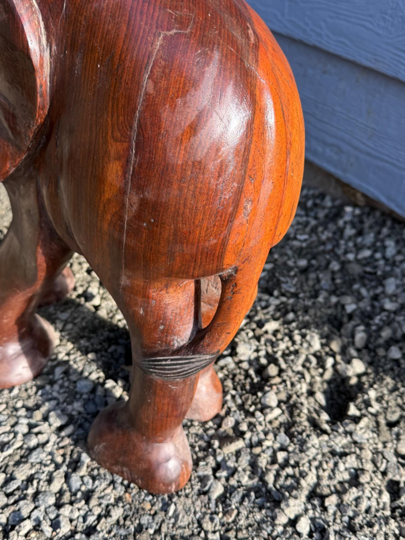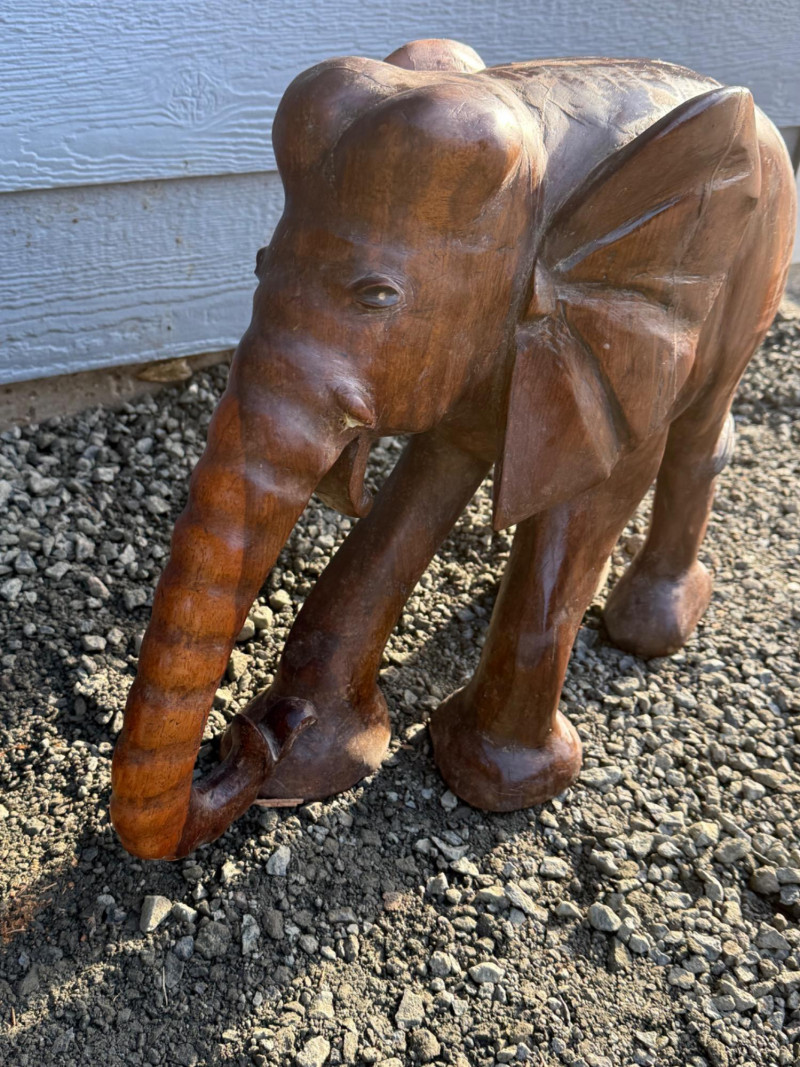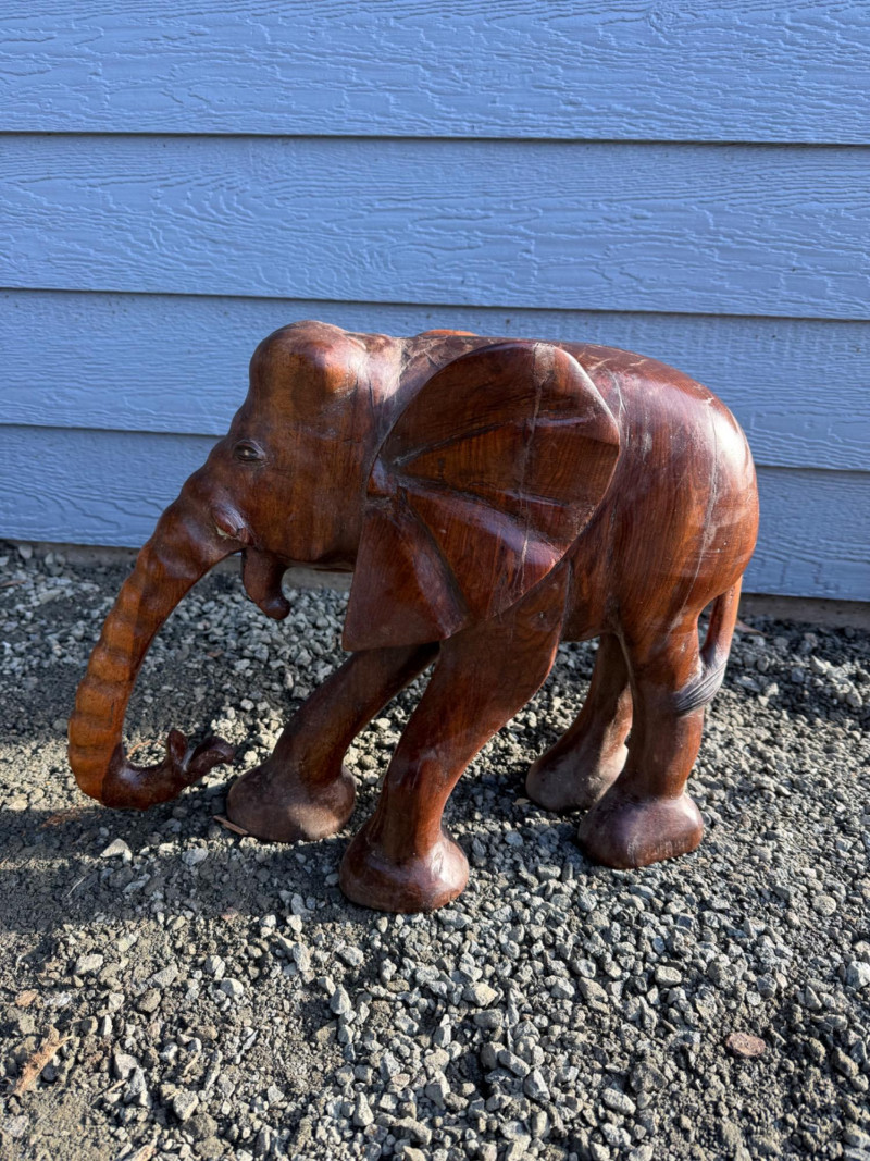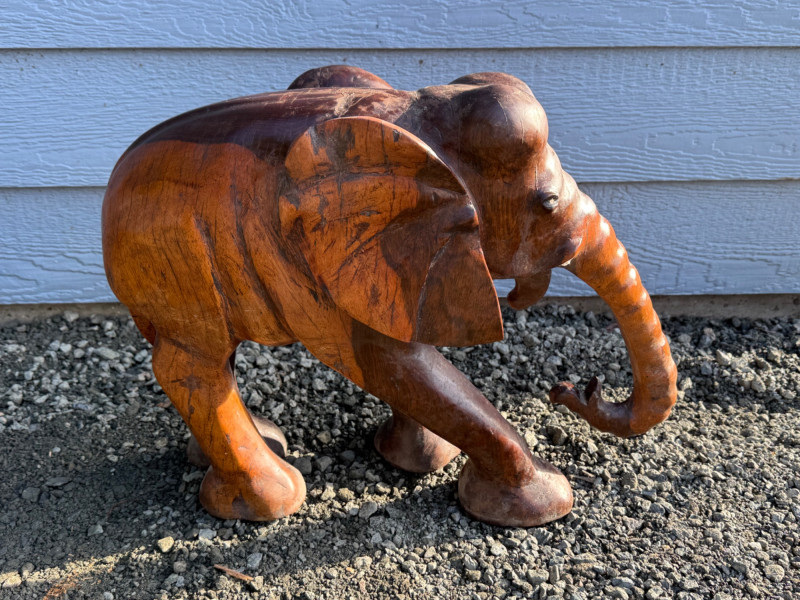 Carved Wood Elephant: A Symbol of Strength and Grace in Sculptural Form This wooden elephant sculpture is a finely crafted decorative piece that captures the animal’s majesty through detailed carving and polished finish. Material: Carved from solid wood, the sculpture features a smooth, polished surface that highlights the natural grain and tonal variations of the material. Form: The elephant is depicted in a standing pose with its trunk curled downward and slightly forward, a gesture often associated with grounded strength or calm demeanor. Details: The artisan has carefully rendered the ears, eyes, legs, and trunk, giving the piece a lifelike presence. The large, flared ears and arched back add to its realistic proportions. Finish: The glossy surface suggests either a wax or lacquer treatment, enhancing both durability and visual appeal.Design and Craftsmanship