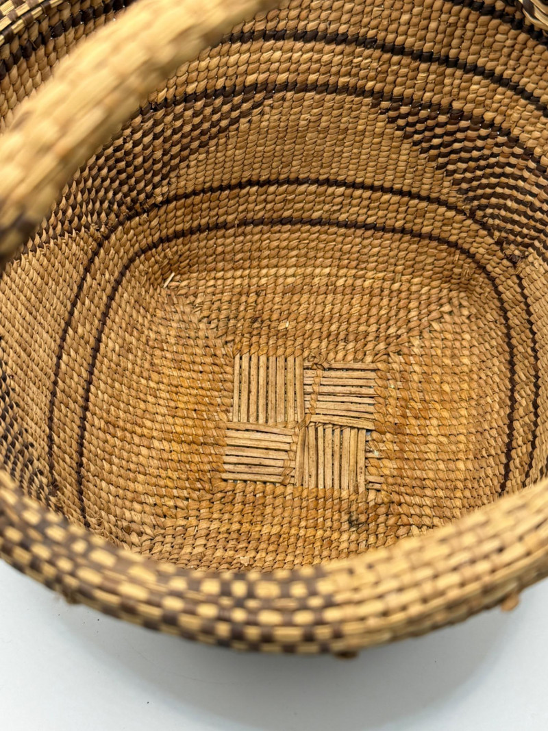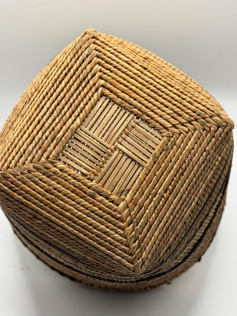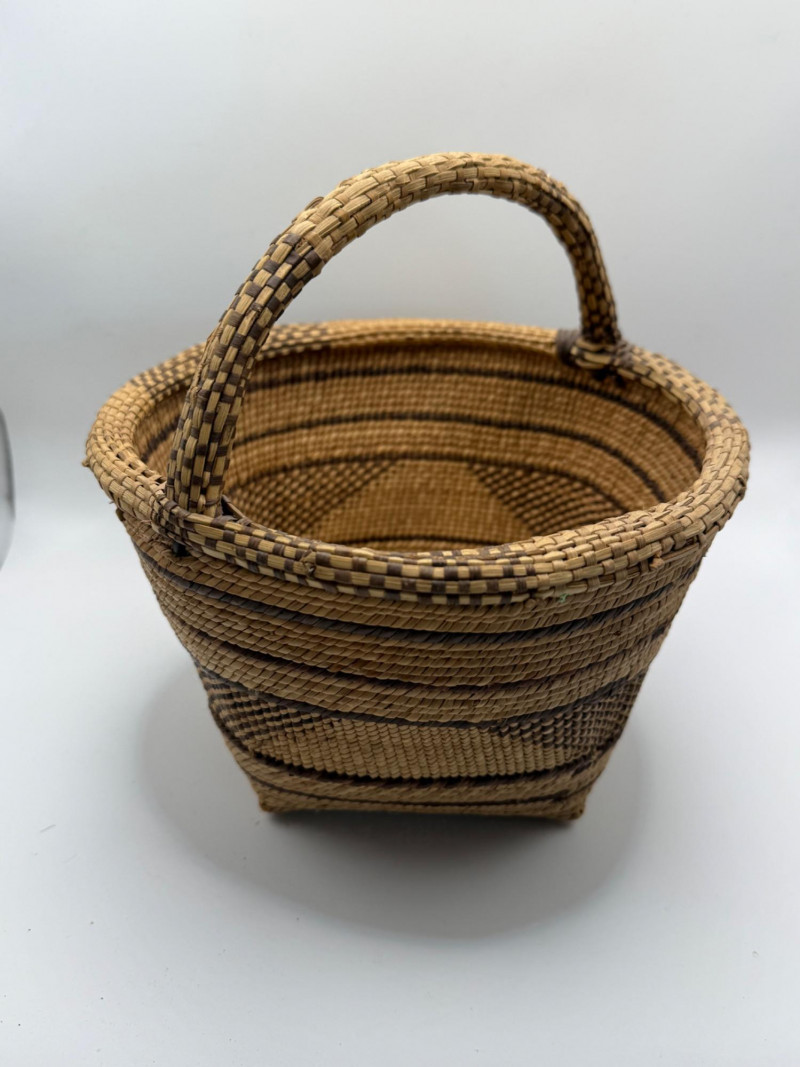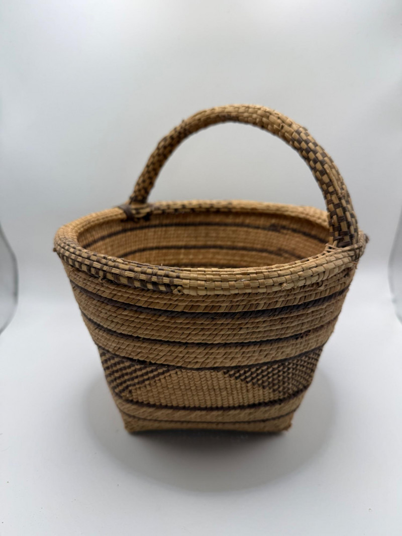 African Basket with Arched Handle: A Handwoven Vessel of Utility and Elegance This African basket is a finely crafted example of traditional handweaving, combining natural materials with a balanced, functional design. Fiber Type: Woven from natural plant fibers, likely grass, palm, or sisal, which are commonly used in African basketry for their strength and flexibility. Weave: The basket features a tight, uniform weave, demonstrating skilled craftsmanship and attention to structural integrity. Color Pattern: Alternating light and dark brown tones form a rhythmic, geometric pattern, enhancing both visual appeal and cultural expression. Regional Style: While the exact origin is not specified, the form and weave suggest styles found in West or East African basketry traditions, such as those from Ghana, Kenya, or Uganda. Symbolism: The color contrasts and patterns may reflect local aesthetics or symbolic meanings, often tied to nature, community, or daily life.Materials and Construction