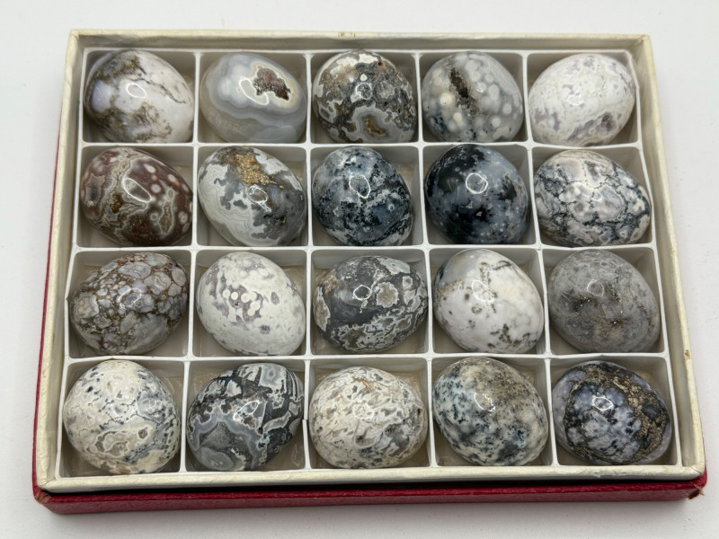 Thomsonite Egg Collection: Polished Zeolite Specimens from Lake Superior This set of twenty thomsonite eggs showcases the rare zeolite mineral in a polished, egg-shaped form, arranged in a grid tray for display. Each specimen reflects the unique geological beauty and mineral diversity of the Lake Superior region. Mineral Type: Thomsonite is a rare member of the zeolite group, composed of hydrated sodium calcium aluminum silicate. Formation: Found in vesicles of volcanic basalt, especially along the North Shore of Lake Superior, where ancient lava flows created ideal conditions for zeolite crystallization. Rarity: Thomsonite is among the rarest zeolites, prized for its aesthetic qualities and limited geographic occurrence. Symbolism: Egg shapes are often associated with renewal and protection, adding symbolic depth to their geological appeal. Use: Primarily ornamental, these eggs are used in display collections, lapidary arts, and educational contexts.Material and Mineral Composition