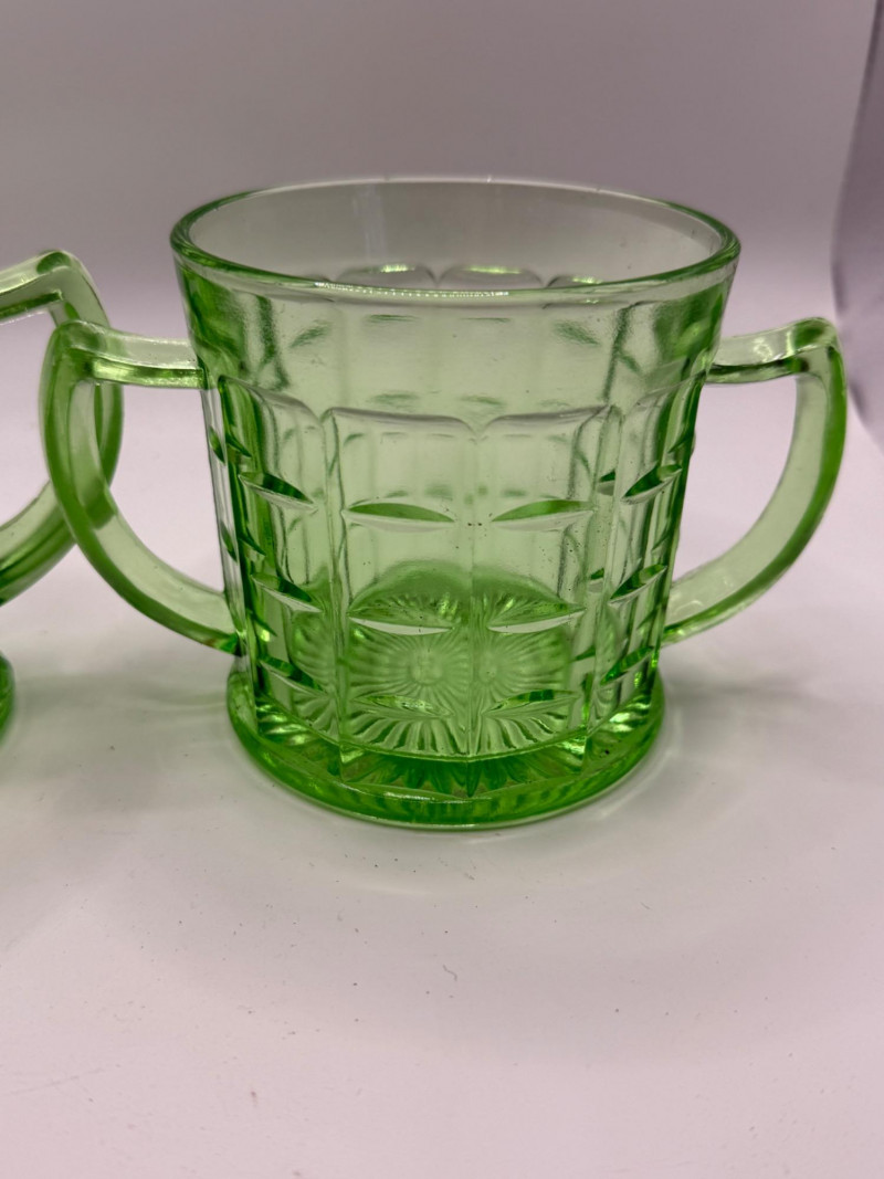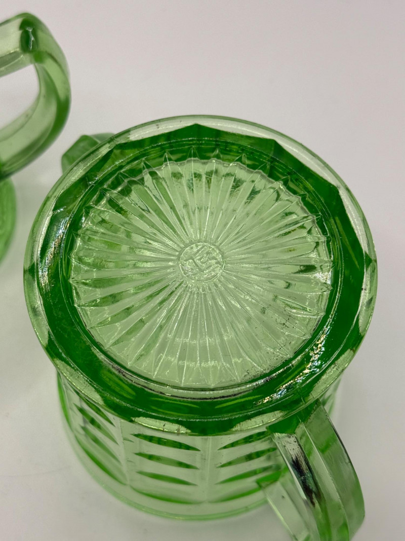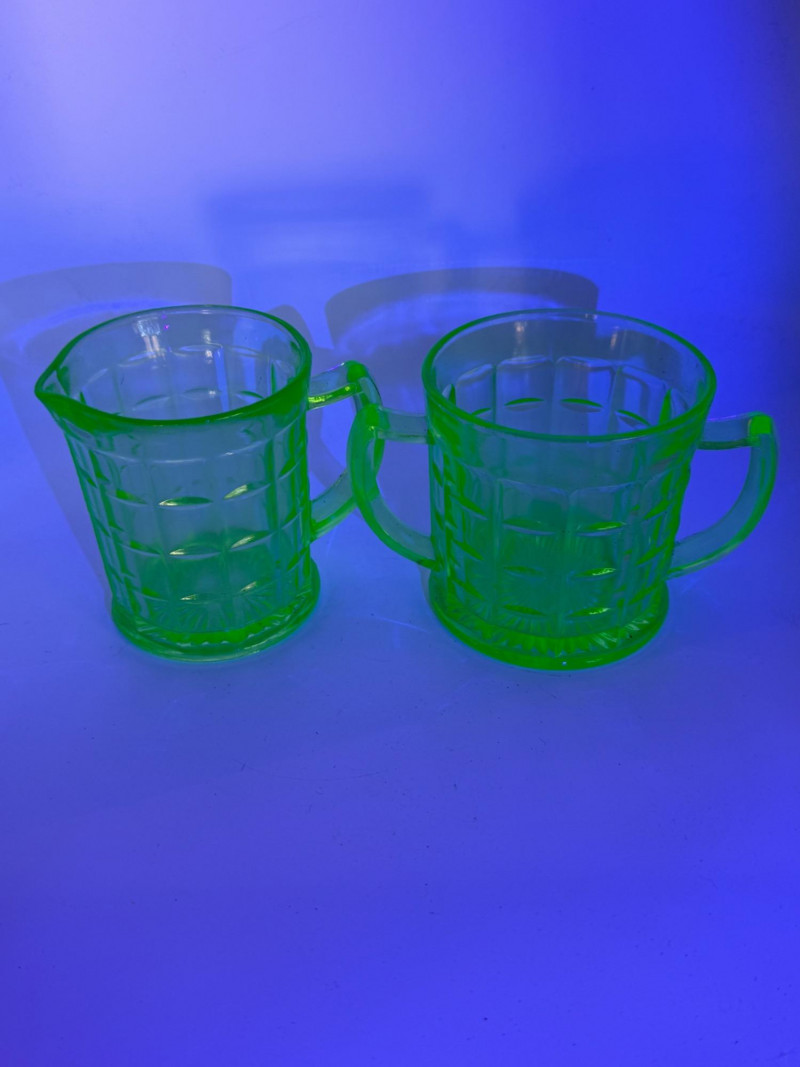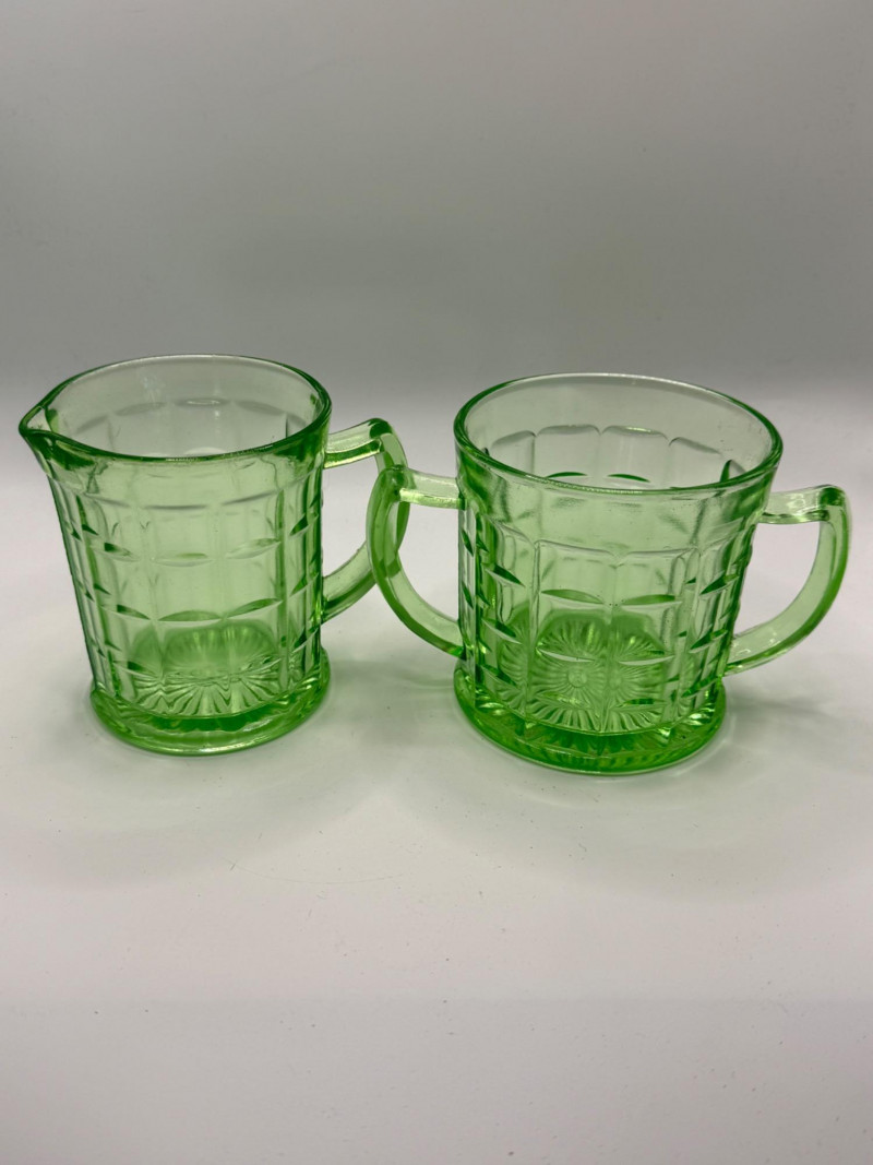 Hazel Atlas Green Depression Glass Creamer and Sugar: Colonial Block Pattern, Circa 1930s This matching creamer and sugar set from Hazel Atlas exemplifies the Colonial Blockpattern, a popular Depression glass design produced between 1930 and 1935. The pieces are crafted in green uranium glass, known for its vibrant color and subtle fluorescence under UV light. Pattern: Colonial Block, characterized by a geometric grid-like texture that adds visual depth and grip. Material: Pressed green uranium glass, a hallmark of Depression-era tableware, valued for its affordability and cheerful color during economic hardship.Design and Features
