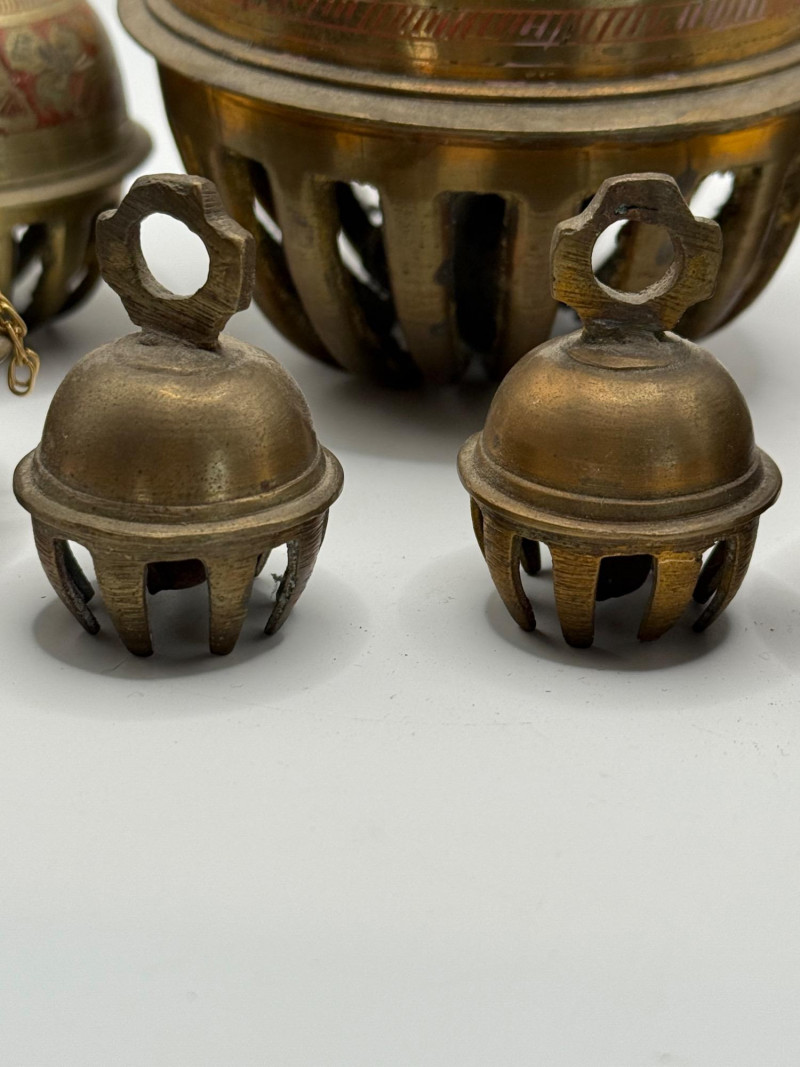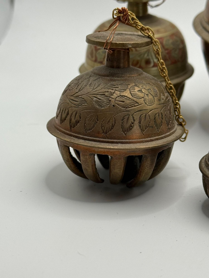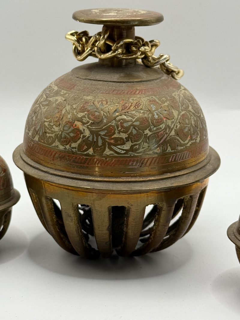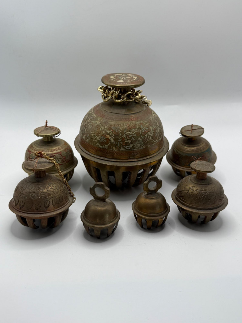 Brass Censers with Chain Handles: Ornate Ritual Vessels for Incense Burning This collection of seven brass or bronze censers—often referred to as incense burners or ritual bells—displays intricate craftsmanship and ceremonial design rooted in religious and cultural traditions. Metal Type: Likely cast from brass or bronze, chosen for its durability, heat resistance, and decorative potential. Surface Finish: Each piece features engraved floral and geometric motifs, enhancing their visual richness and reflecting traditional metalworking techniques. Openwork Design: The bodies include slotted openings that allow incense smoke to escape, creating both aromatic and visual effects during use.Materials and Construction