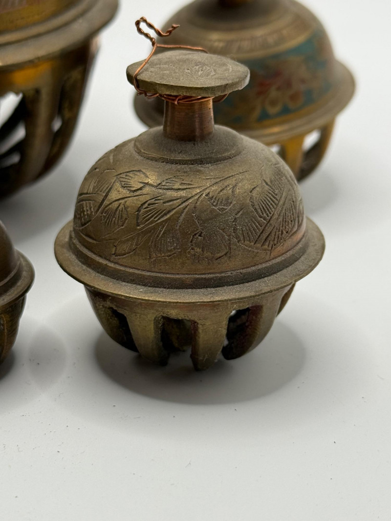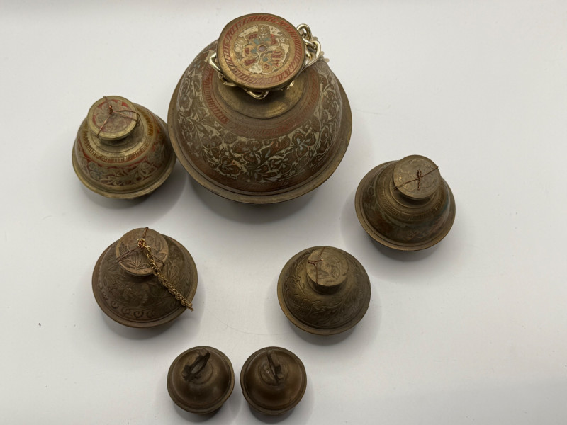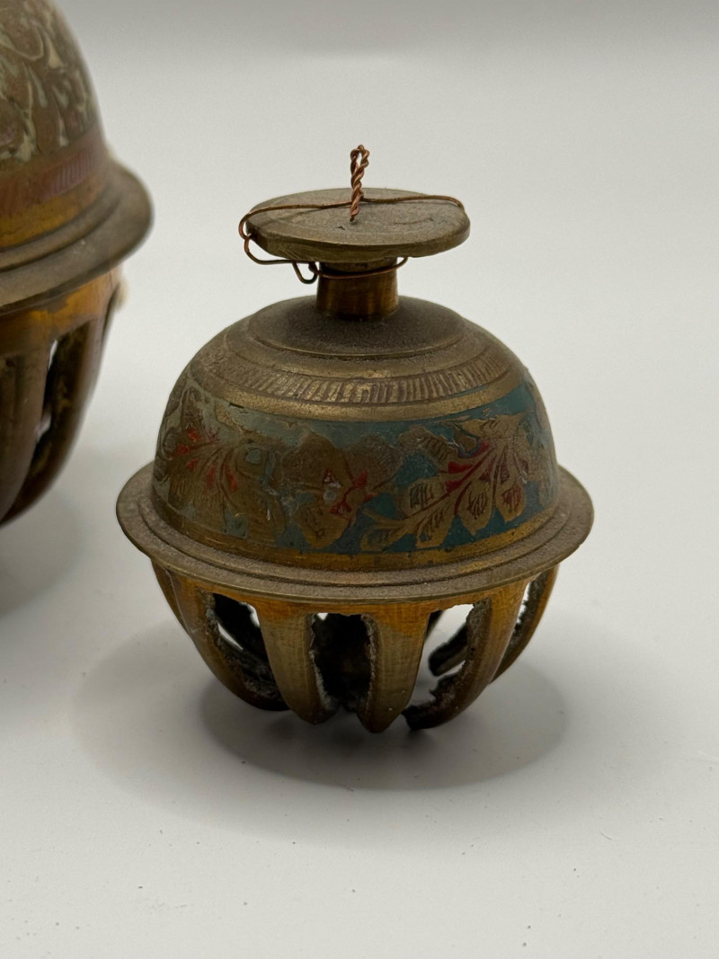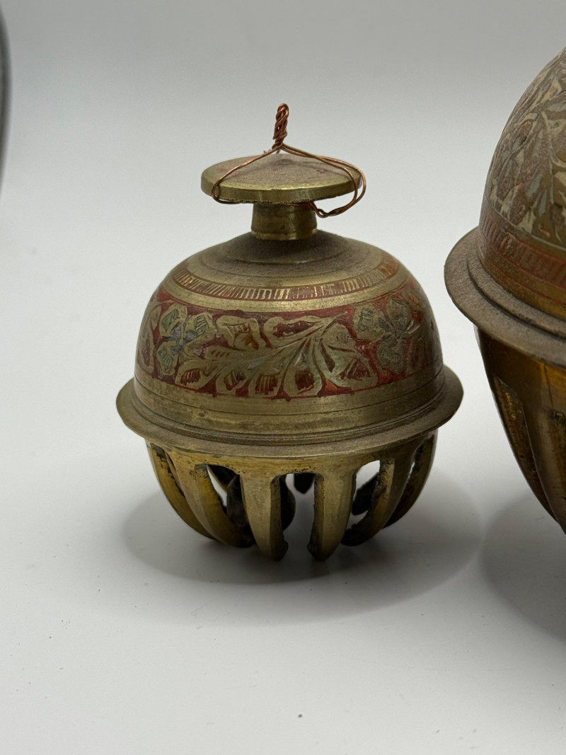 Brass Censers with Chain Handles: Ornate Ritual Vessels for Incense Burning This collection of seven brass or bronze censers—often referred to as incense burners or ritual bells—displays intricate craftsmanship and ceremonial design rooted in religious and cultural traditions. Metal Type: Likely cast from brass or bronze, chosen for its durability, heat resistance, and decorative potential. Surface Finish: Each piece features engraved floral and geometric motifs, enhancing their visual richness and reflecting traditional metalworking techniques. Openwork Design: The bodies include slotted openings that allow incense smoke to escape, creating both aromatic and visual effects during use.Materials and Construction