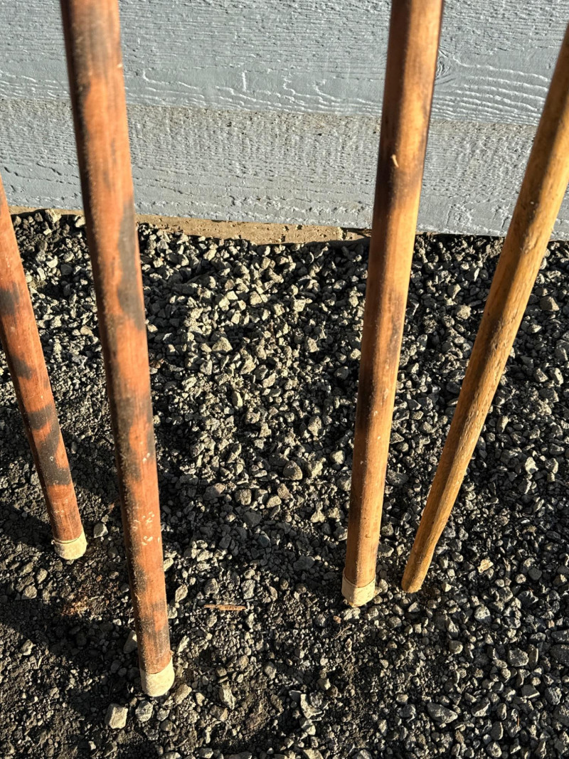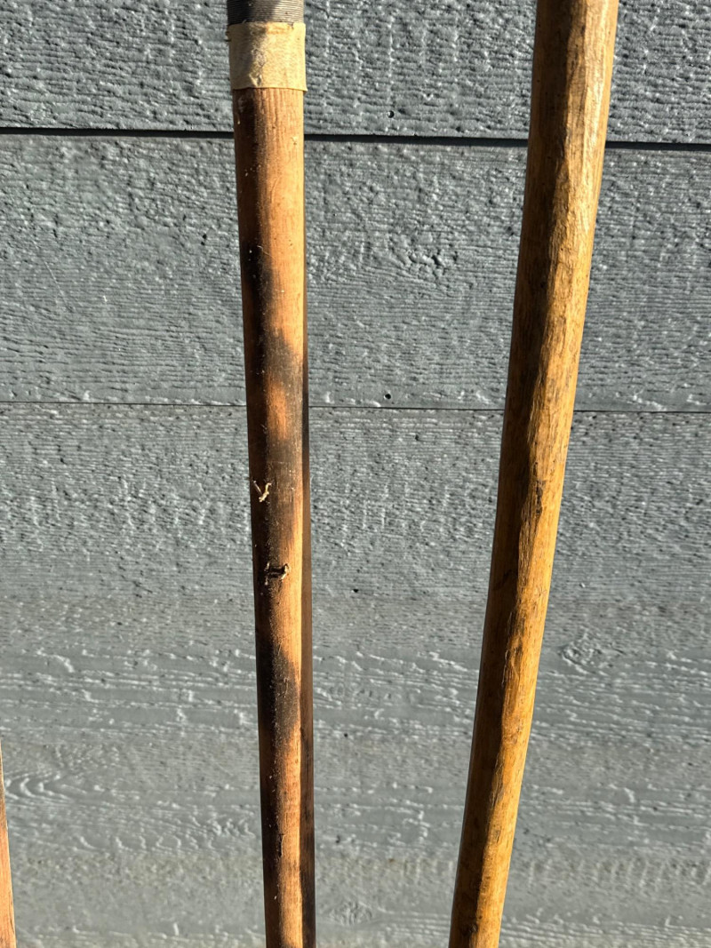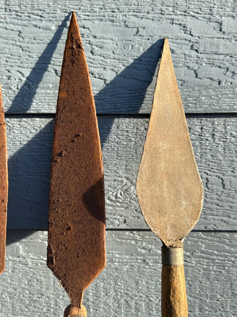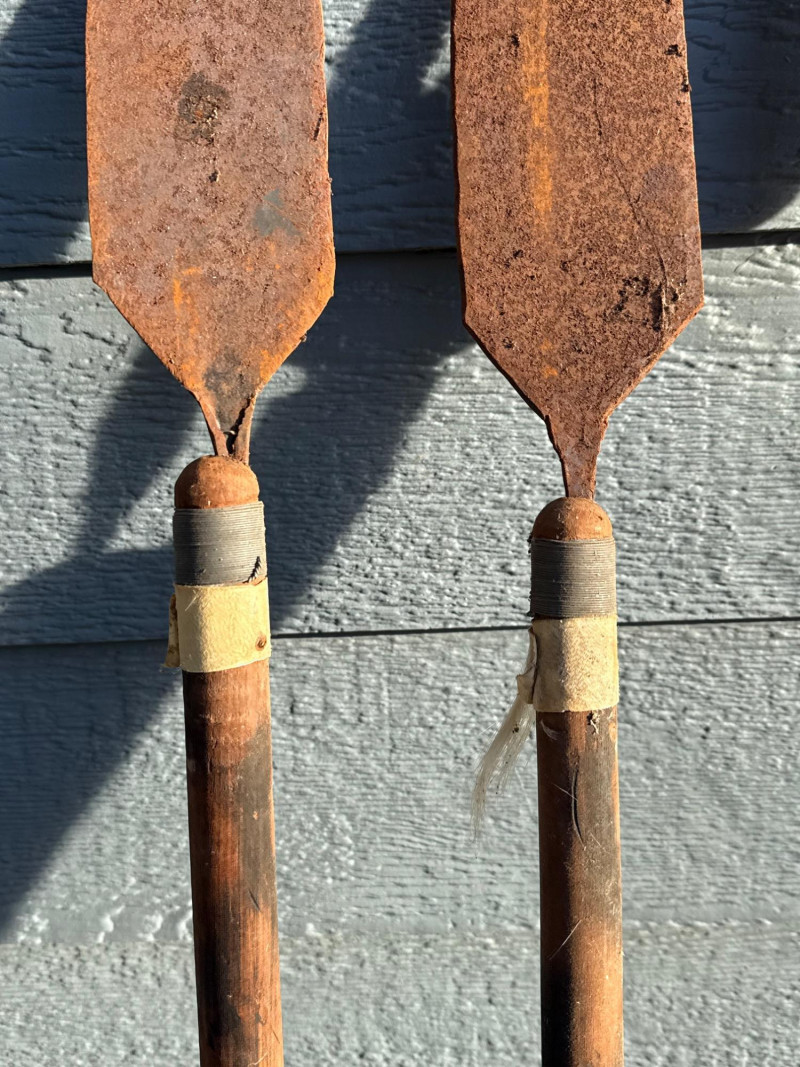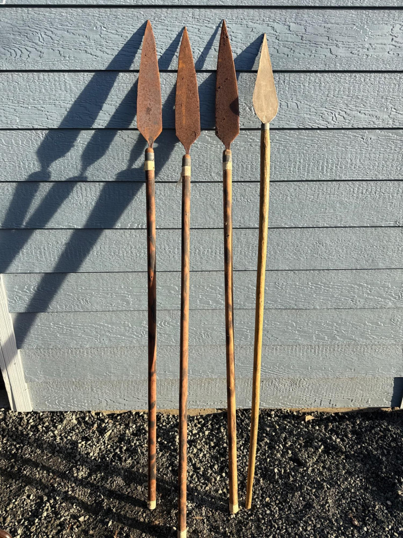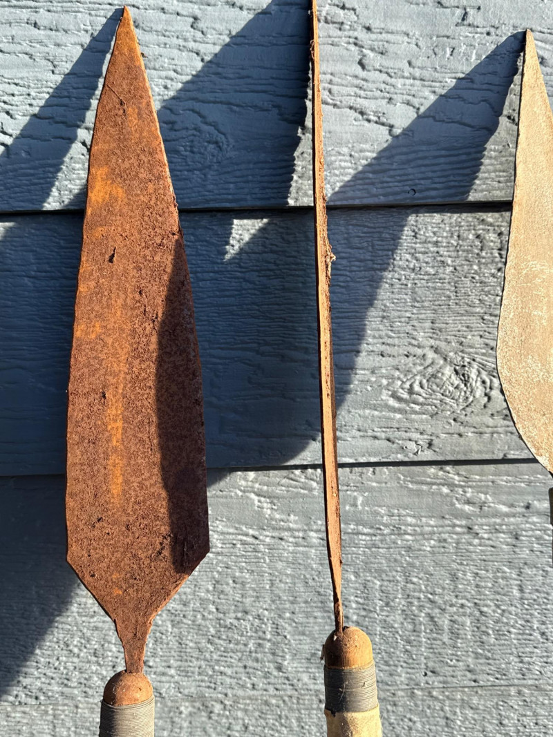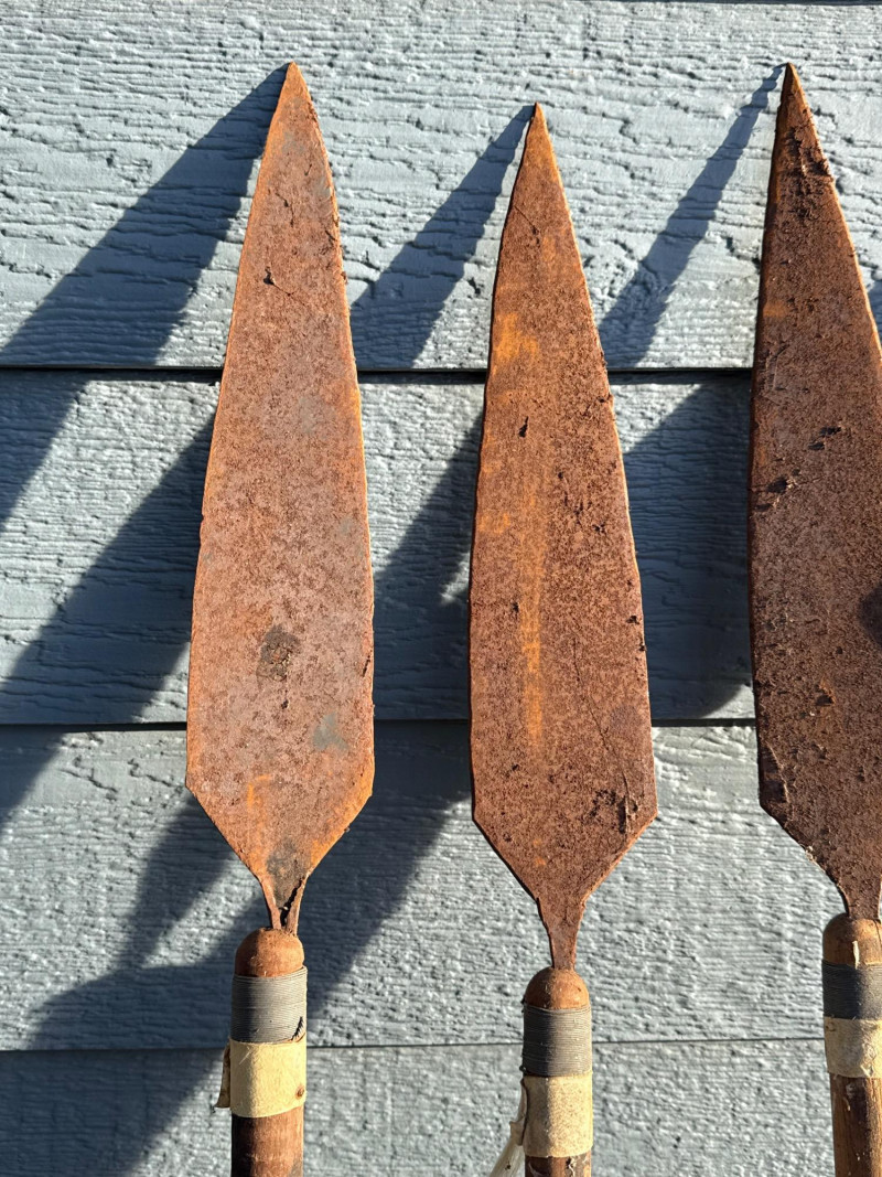 Traditional Iron-Tipped Spears: Handcrafted Weapons of Cultural and Historical Significance This trio of traditional spears presents a compelling example of indigenous craftsmanship, likely originating from sub-Saharan Africa. Their aged appearance and construction suggest they may have served both practical and ceremonial roles. Spearheads: Each spear features a leaf-shaped iron tip, visibly rusted and aged, indicative of long-term exposure and traditional forging methods. The shape is optimized for both thrusting and cutting. Shafts: Made from dark-stained wood, the shafts show mottled patterns and natural grain, suggesting hand-selection and minimal industrial processing.Materials and Construction